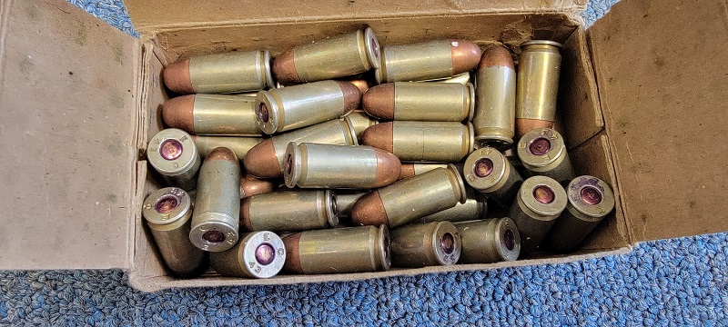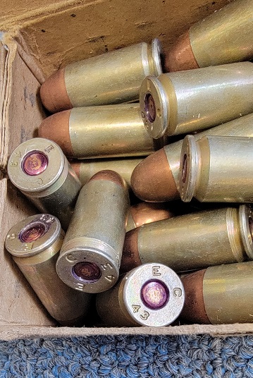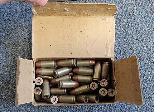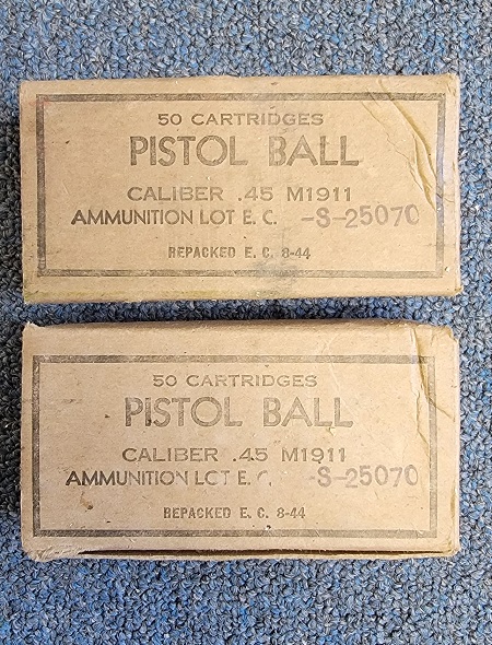 8/2/23 – These are two boxes of 1944 packaged .45 Caliber ammunition. One box is unopened, with all 50 rounds included. The other box has been opened, and is the same lot number, but only with 38 total rounds inside. The rounds shown in photos are inside the opened box. Great condition as shown, and 1943 head-stamped. 88 rounds total.