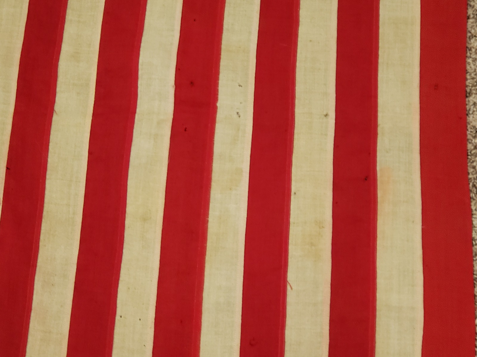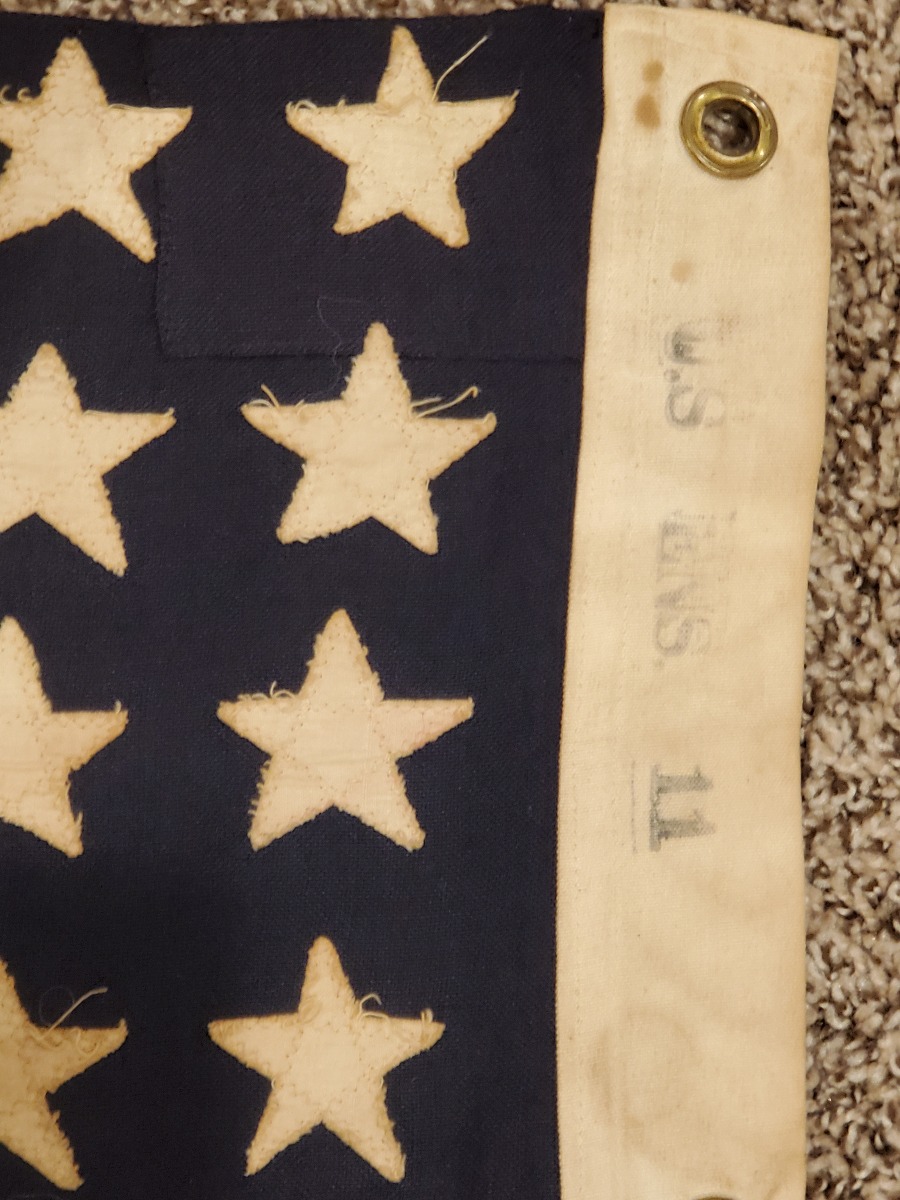5/6/20 – This is an original WW2 US naval ship flag “US No. 11 Ensign”. The number 11 designates the size of the flag, with 12 being the smallest size. This flag is 29inches x 57inches. The flag is completely in tact with some yellowing and a few very minor, light tatters. The stitching is overall excellent. The stars (48 total) are hand sown to the flag, which would indicate 1943 production. A great piece of U.S. military history.