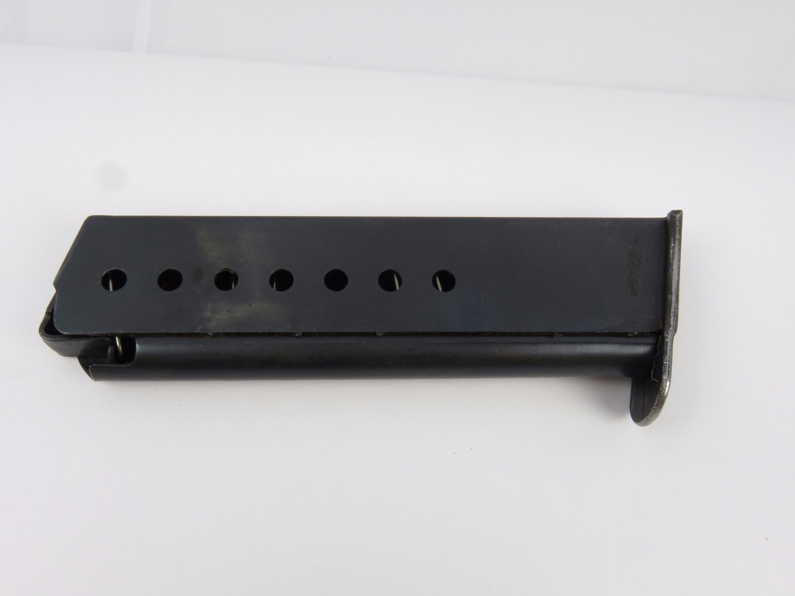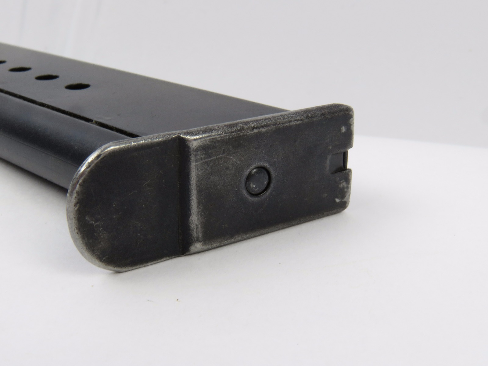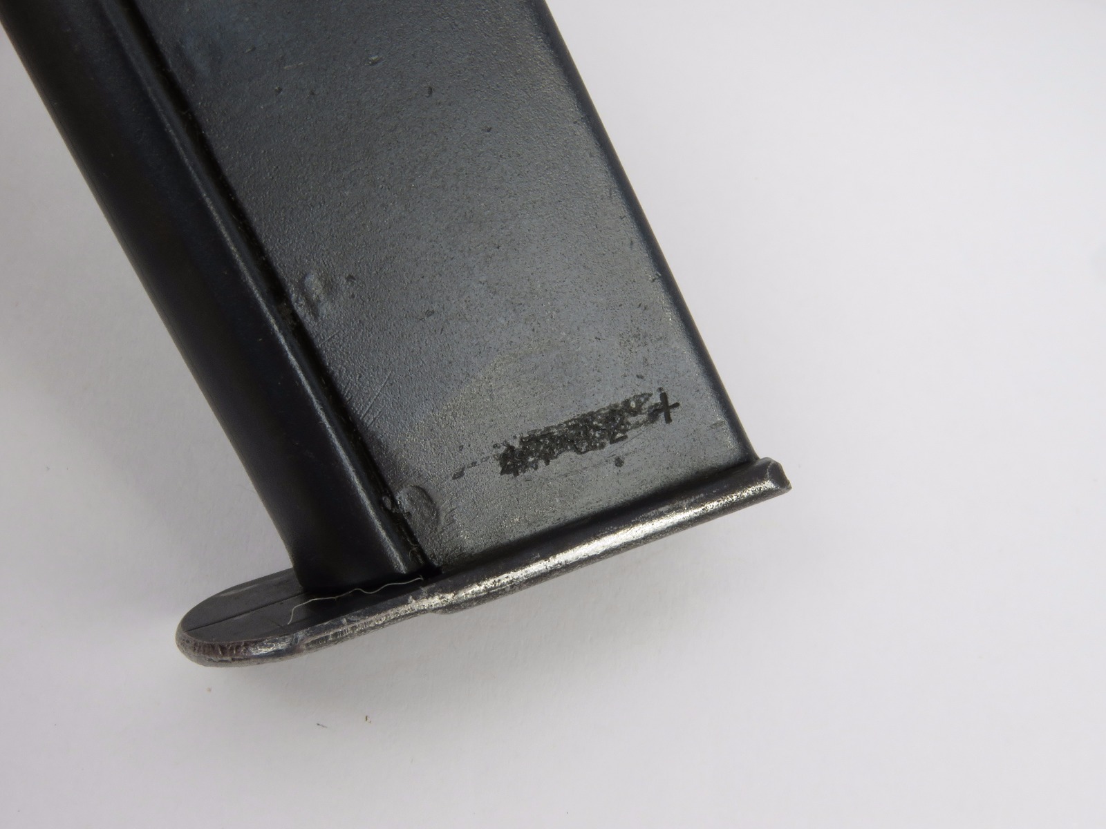 9/28/17 – This is an original early production 480 code P.38 magazine. The 480 code P.38 was the first code used by Walther in 1940. The magazines were all serial numbered on the side of the frame, and there were two eagle/359 stamps on the bottom of the spine. These stamps are all present on this magazine, but unfortunately someone tried to scratch out the serial number. Otherwise there are no flaws or issues with this magazine. Excellent condition with only some minor spots of wear on the spine. Spring is strong and fully functional. Guaranteed original.