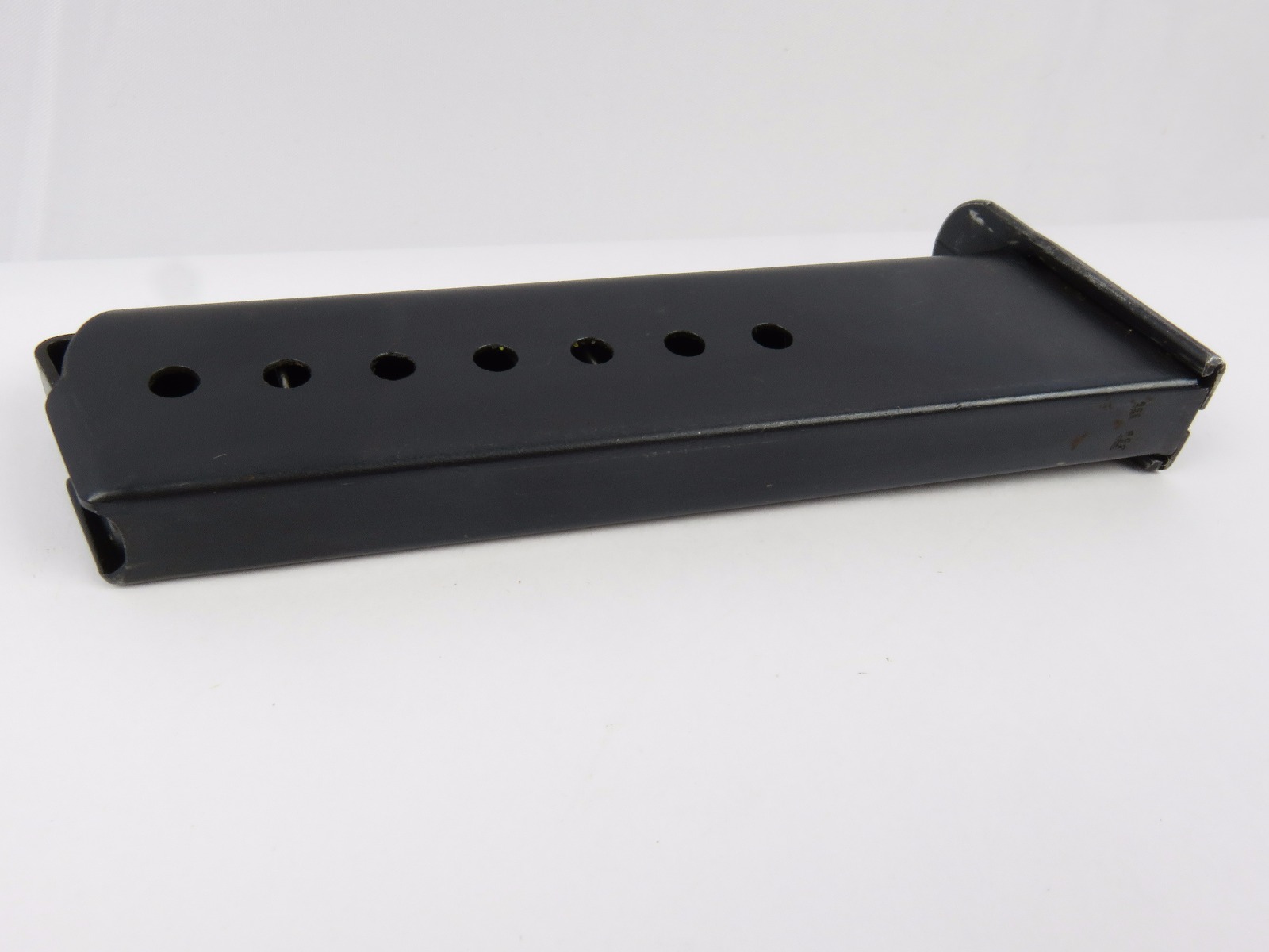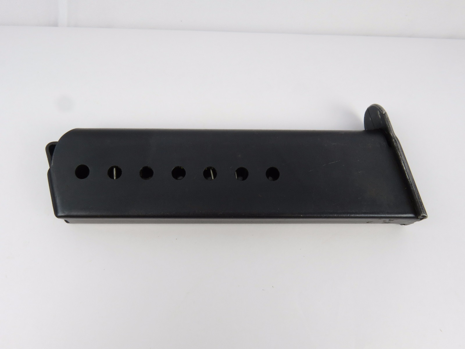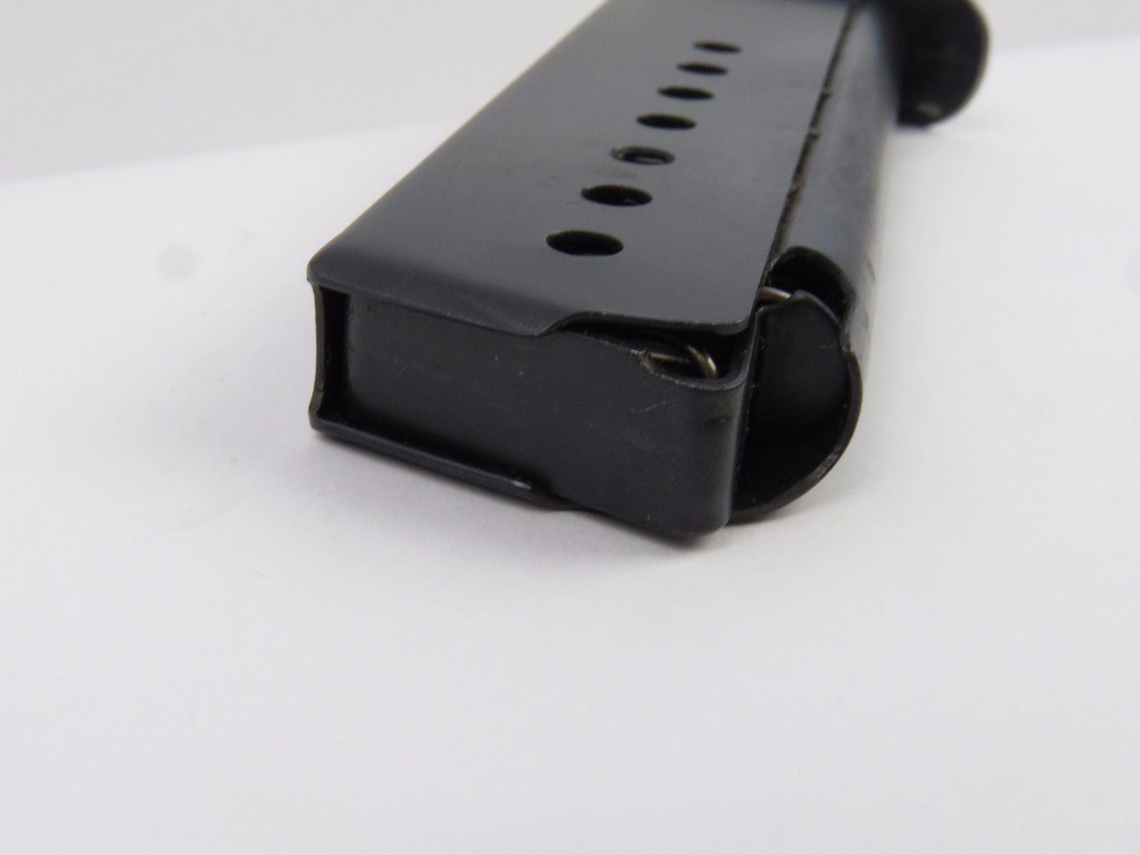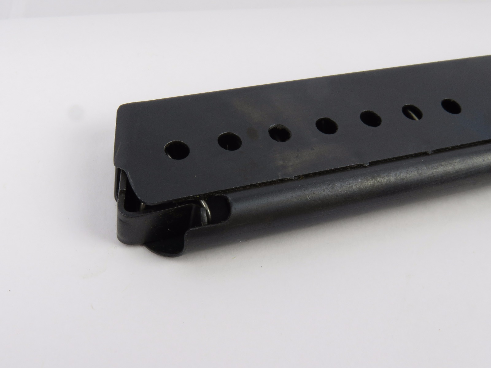 9/28/17 – This is an original early production 480 code P.38 magazine. The 480 code P.38 was the first code used by Walther in 1940. The magazines were all serial numbered on the side of the frame, and there were two eagle/359 stamps on the bottom of the spine. These stamps are all present on this magazine, but unfortunately someone tried to scratch out the serial number. Otherwise there are no flaws or issues with this magazine. Excellent condition with only some minor spots of wear on the spine. Spring is strong and fully functional. Guaranteed original.
