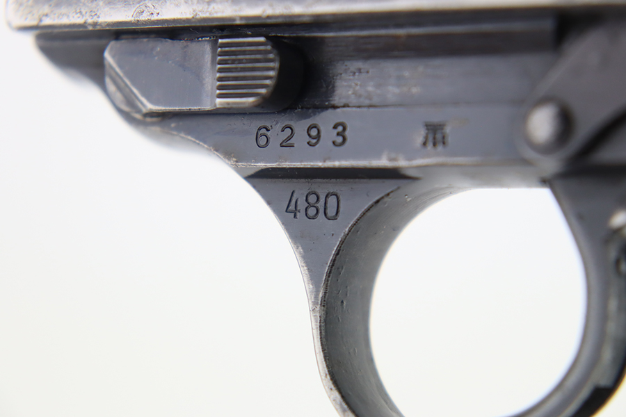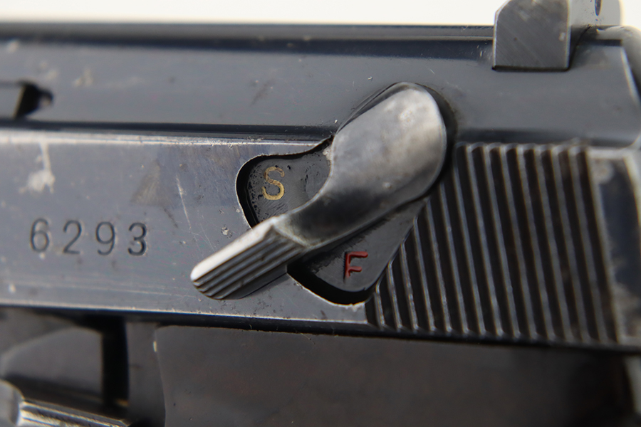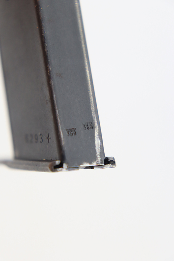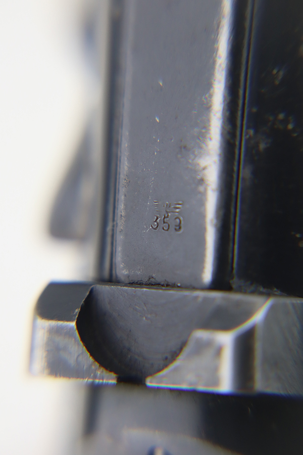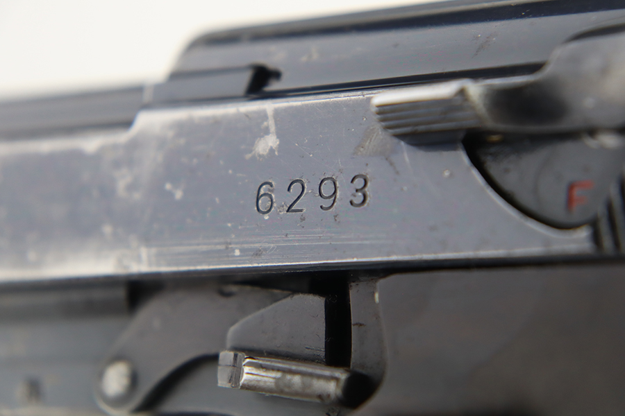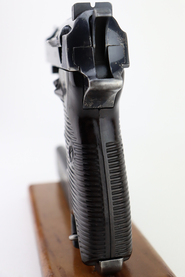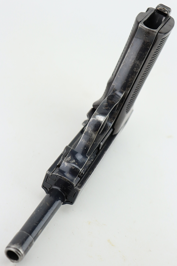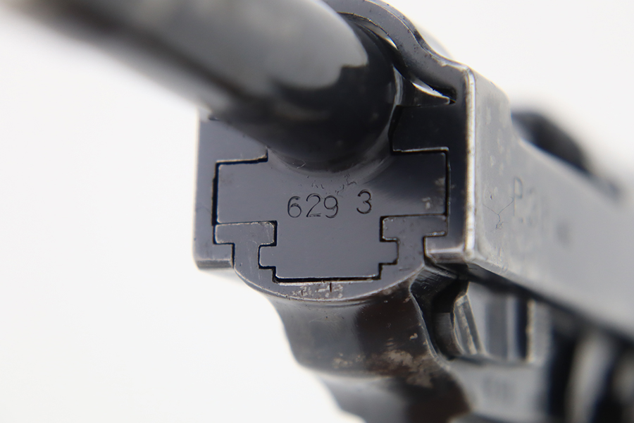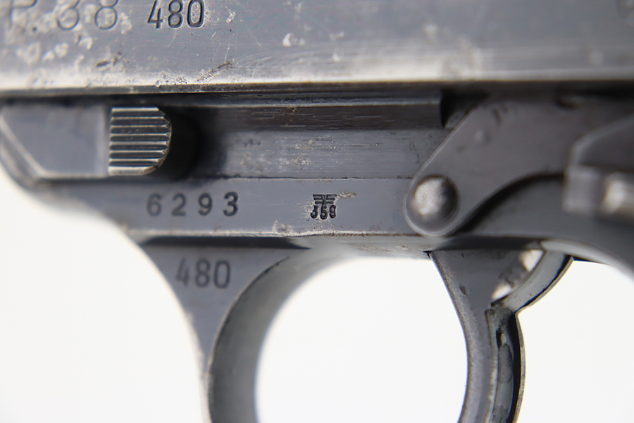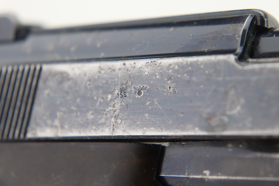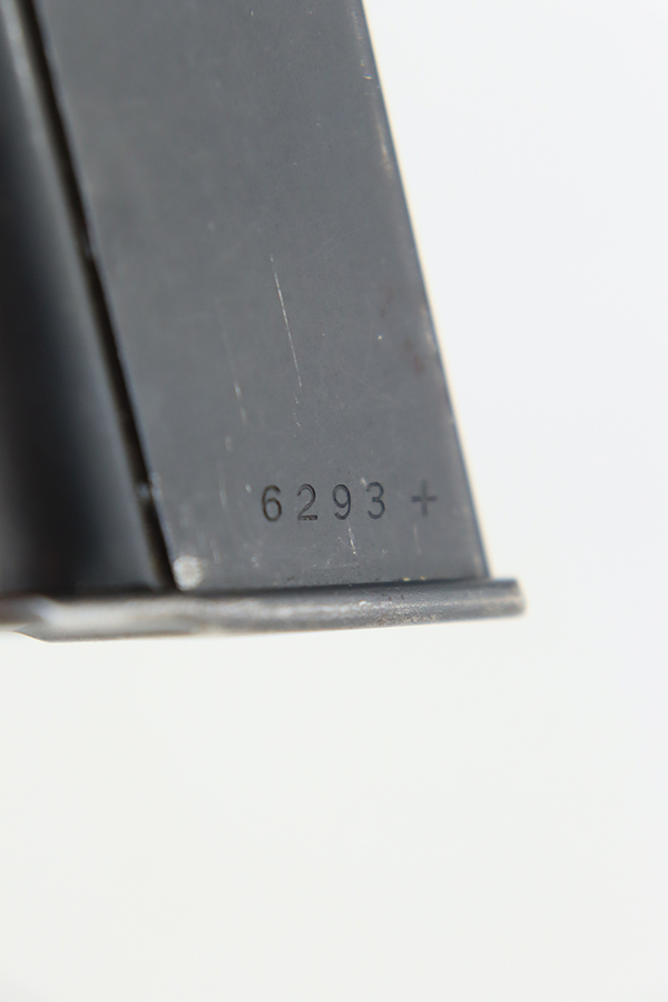 1/31/24 – This is a 480 Code Walther P.38 issued to the Nazi military in about 1940. It is all matching with the proper “Eagle 359” military acceptance proofs throughout, even on the small parts. Comes with one original matching-numbered magazine. Its original high polish finish rates roughly 75-80% with obvious spotty discoloration and very light pin-pricking covering most of the gun. Fitted with original matching-numbered and waffen-proofed bakelite grips. The bore has great rifling with some very light frosting in the grooves. De-cocker is functional.