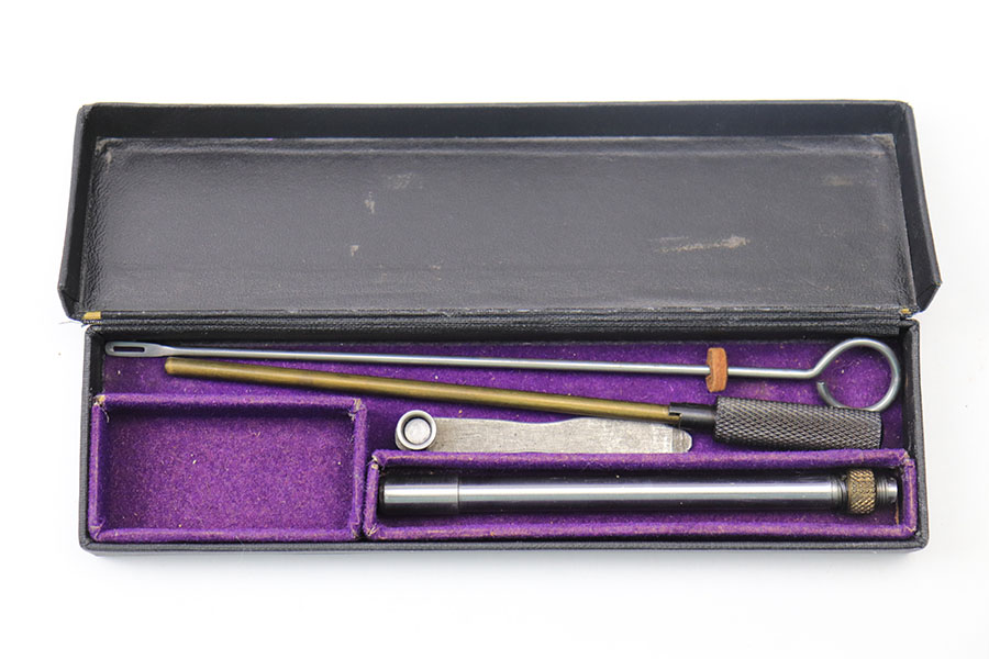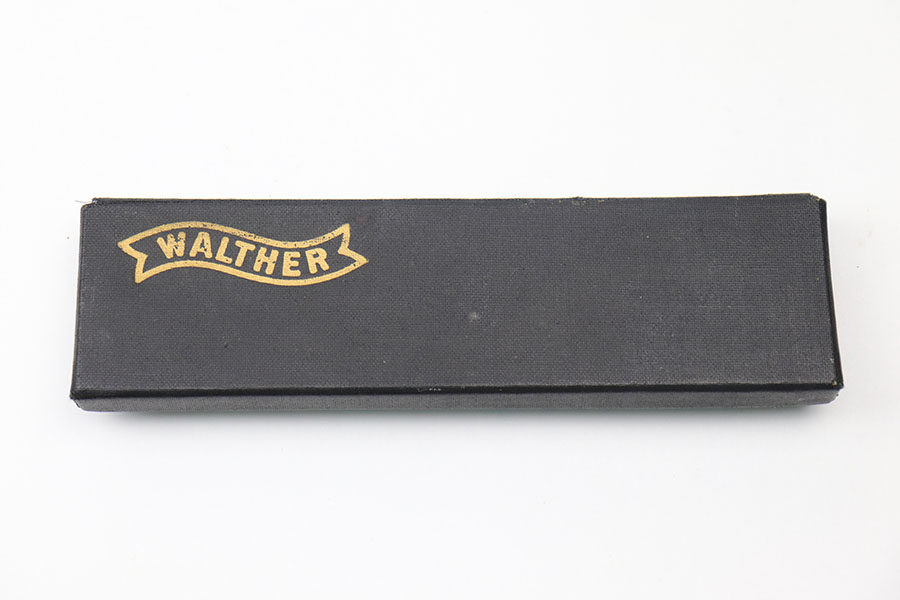 5/14/21 – This is an excellent, original Walther PP conversion kit from the 1930s. The conversion kit comes with all the parts shown in photos and all are excellent condition. The barrel has strong rifling and only some very minor residue from previous use, but 9/10 overall. The box has minimal wear and signs of aging.