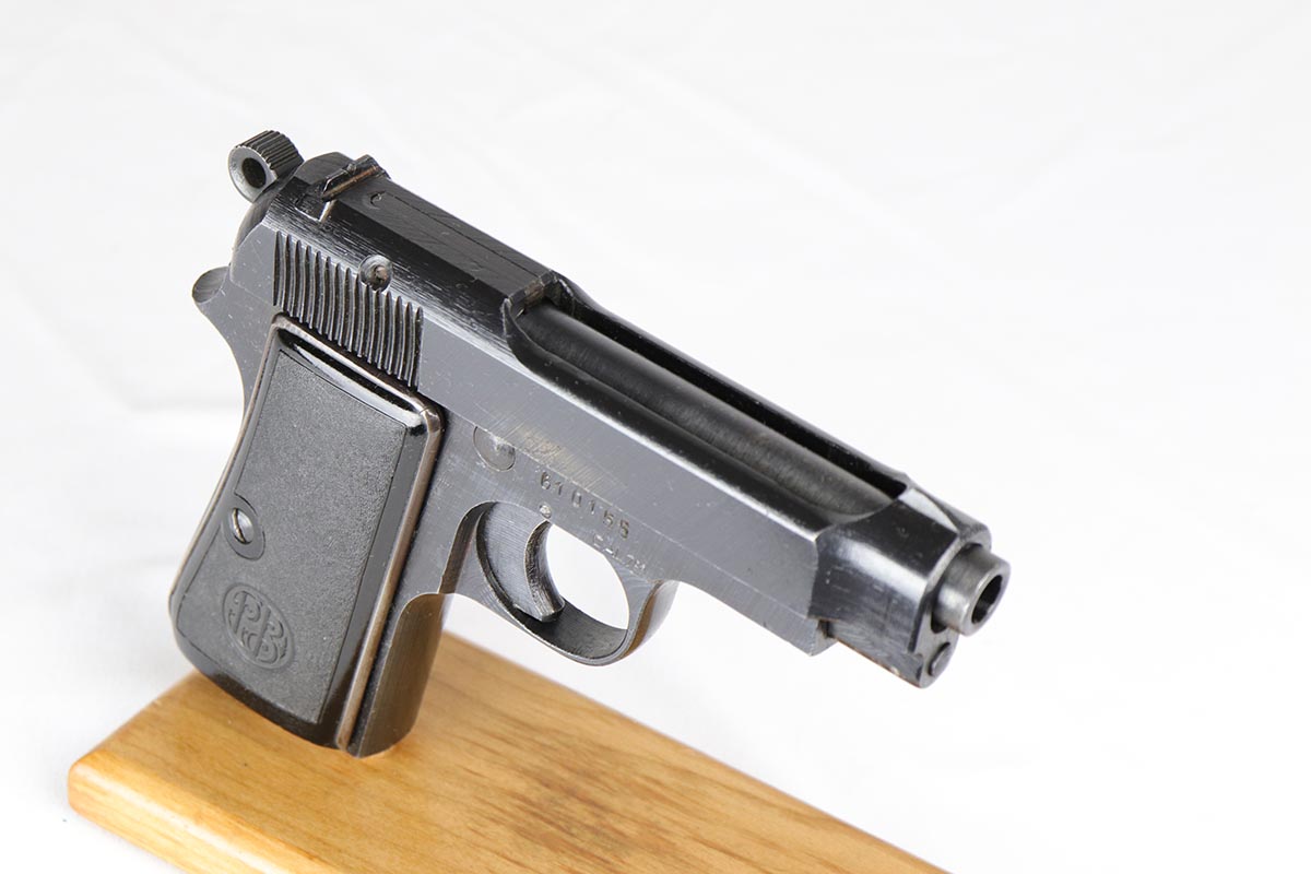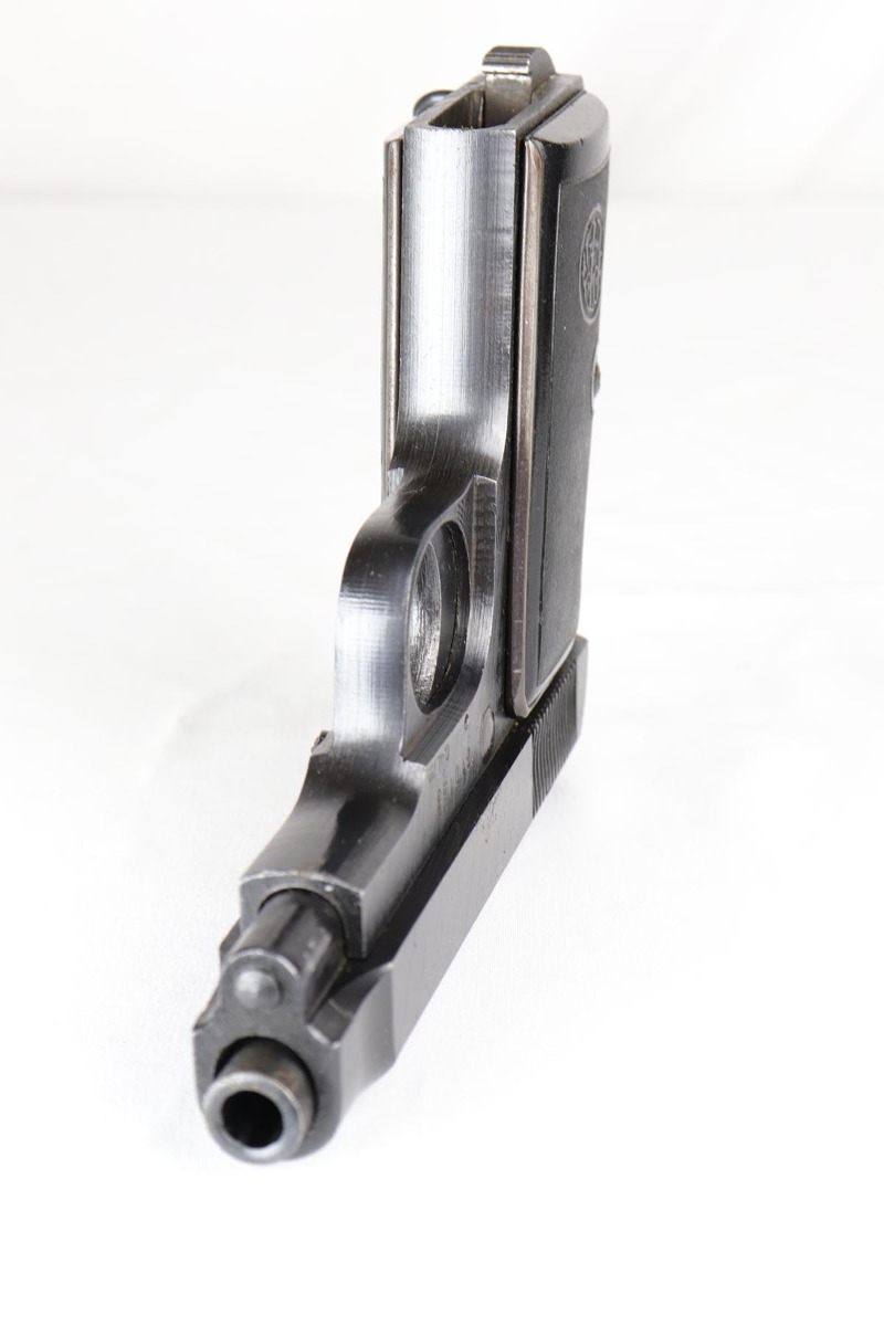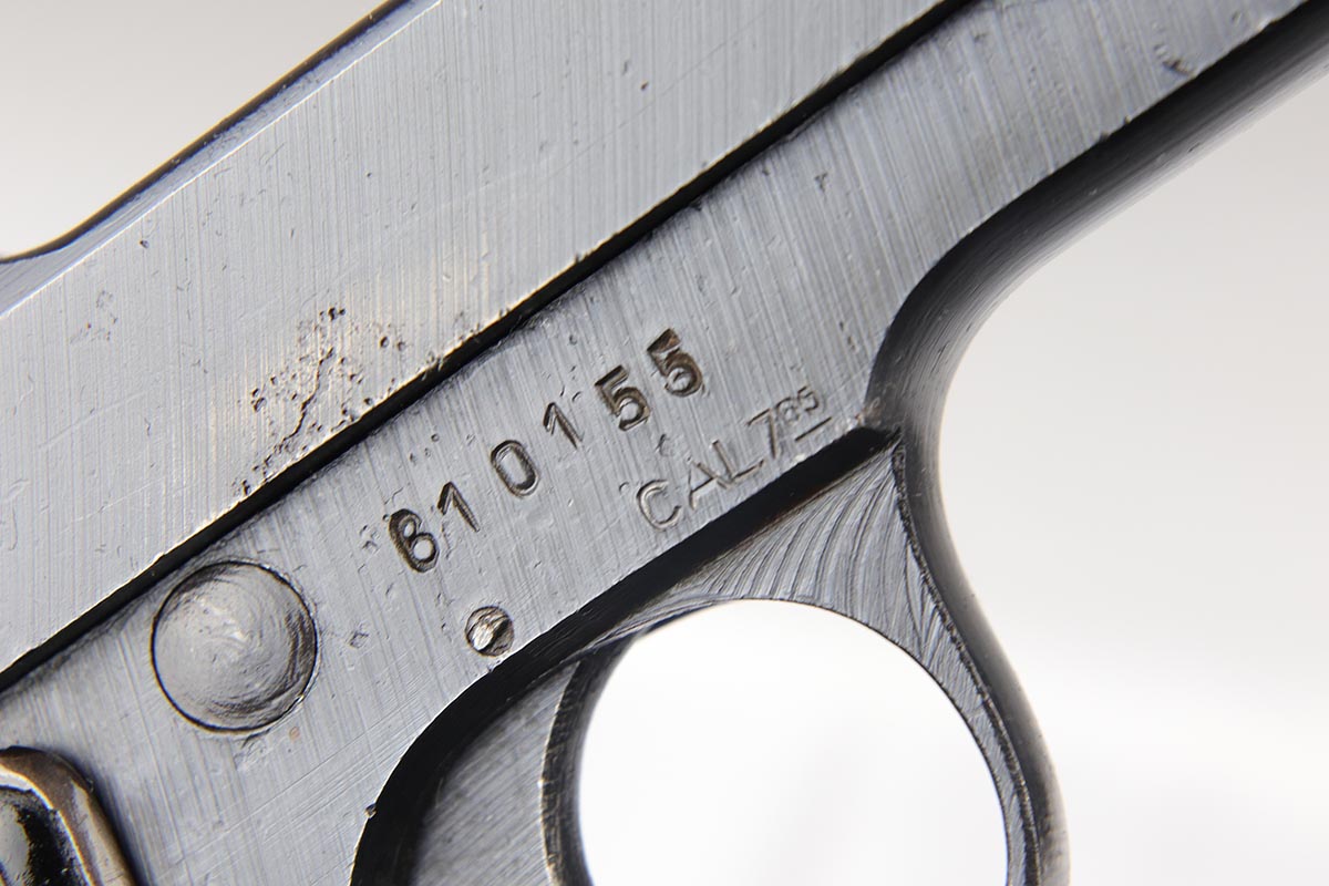 4/30/18 – This is an original Beretta model 1935 pistol, stamped “4UT” which was a designation for the Nazi military during WW2. The pistol has no slide legend, and an overall rough machined finish, telling us that this was a late or end of war production pistol. The bluing is dull throughout the pistol but still in excellent original condition. There is very minimal wear to the bluing. The right side of the slide has a small area of pitting, but otherwise most of the wear is just rough machining and small pin marks here or there. The bore is excellent with strong rifling. The magazine is original, as are the grips. Guaranteed all original and fully operational.