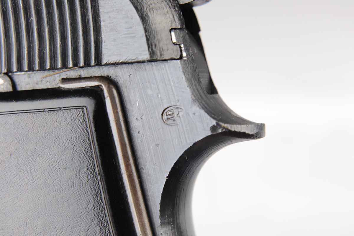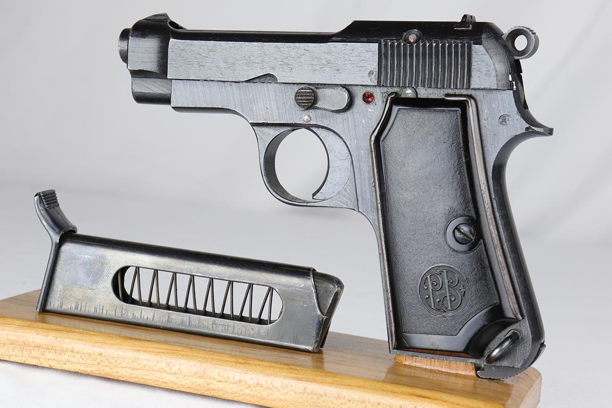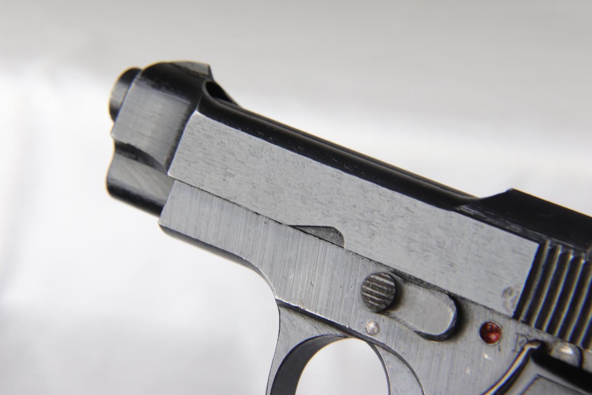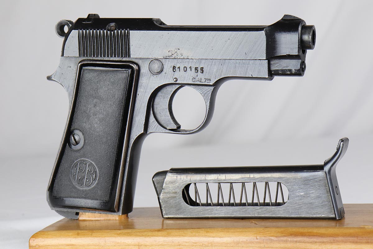 4/30/18 – This is an original Beretta model 1935 pistol, stamped “4UT” which was a designation for the Nazi military during WW2. The pistol has no slide legend, and an overall rough machined finish, telling us that this was a late or end of war production pistol. The bluing is dull throughout the pistol but still in excellent original condition. There is very minimal wear to the bluing. The right side of the slide has a small area of pitting, but otherwise most of the wear is just rough machining and small pin marks here or there. The bore is excellent with strong rifling. The magazine is original, as are the grips. Guaranteed all original and fully operational.