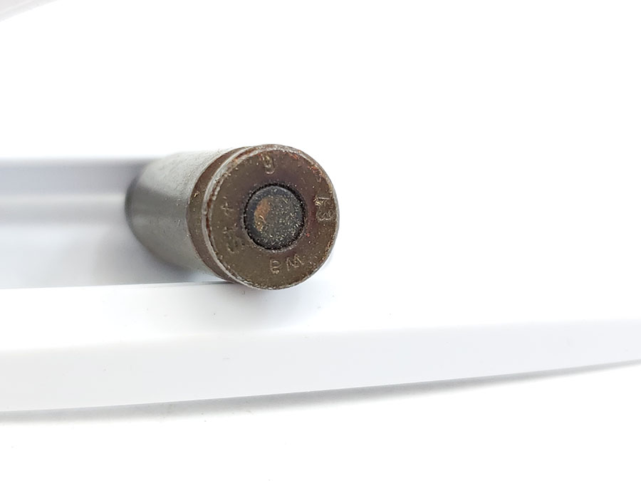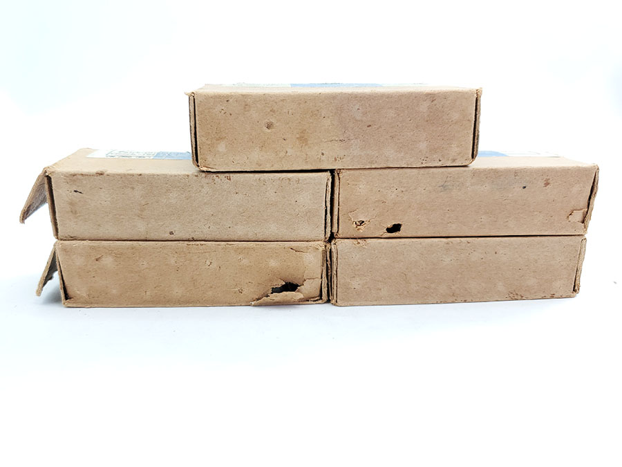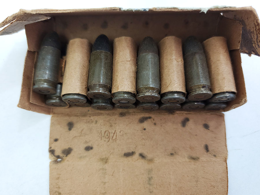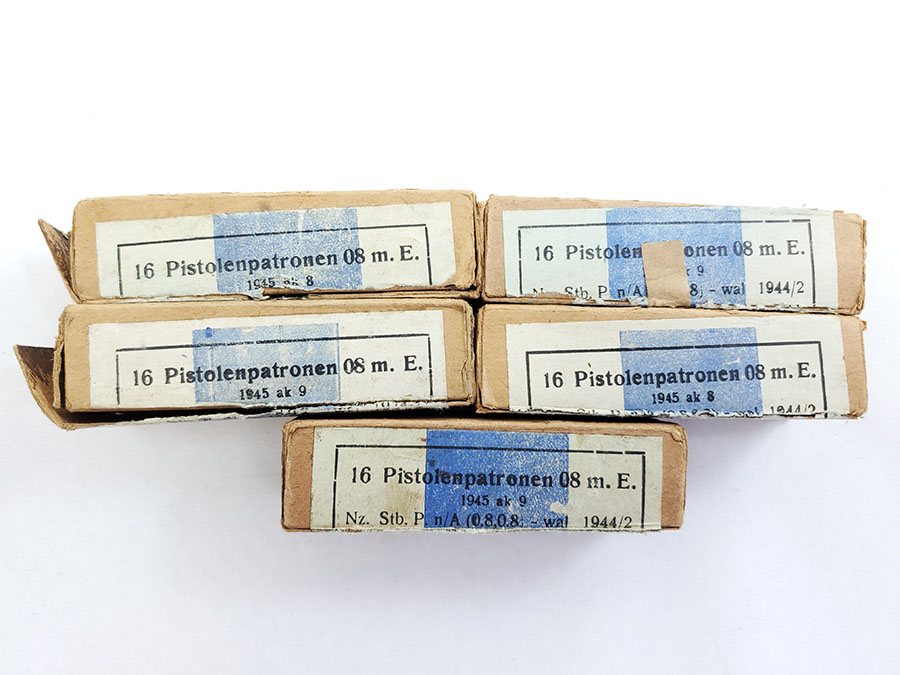 7/17/20 – We have 5 previously opened boxes of 9mm Luger ammunition from WW2. There are 16 rounds per box, so a total of 80 rounds. The headstamp of each round indicates 1943 production, and there are dates ranging from 1943-45 on the box labels. All the rounds are in excellent condition. The boxes are fairly tattered, some more than others. See photos.