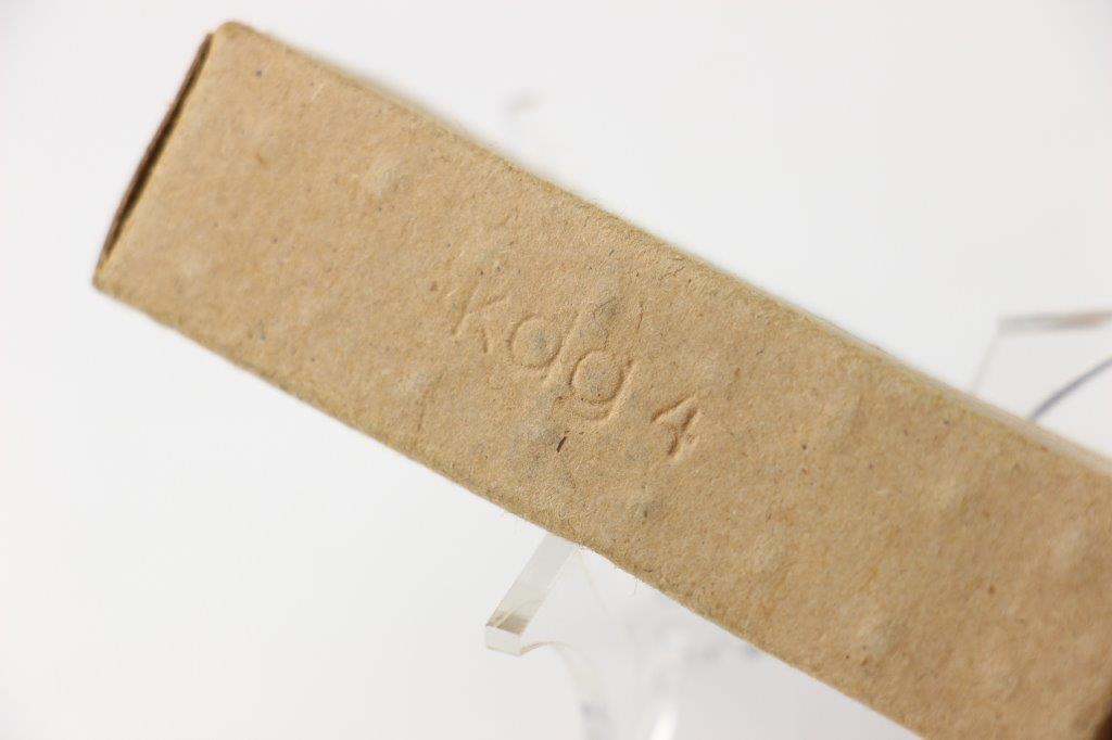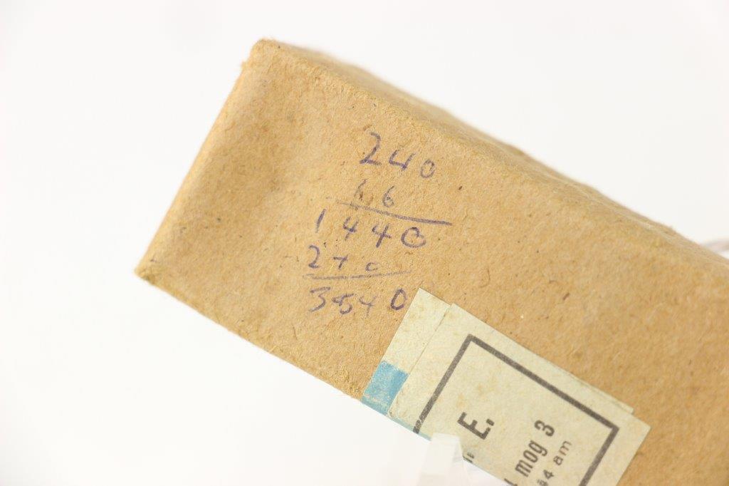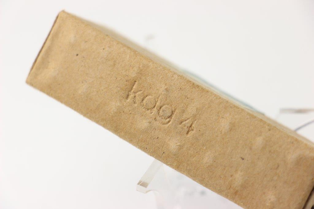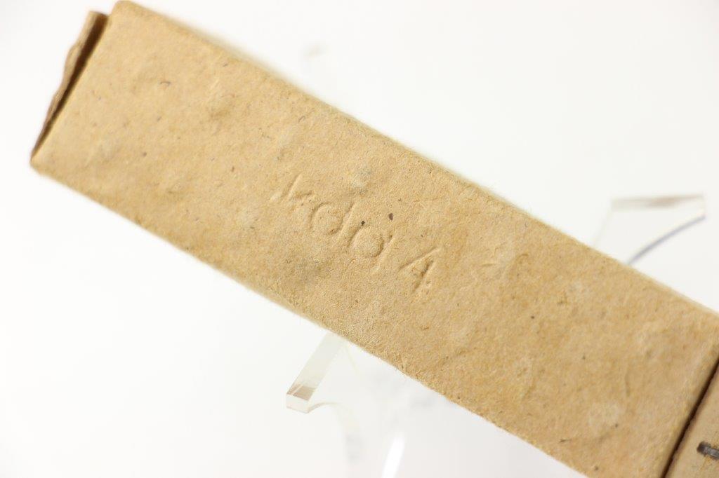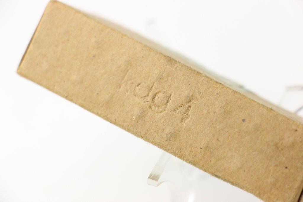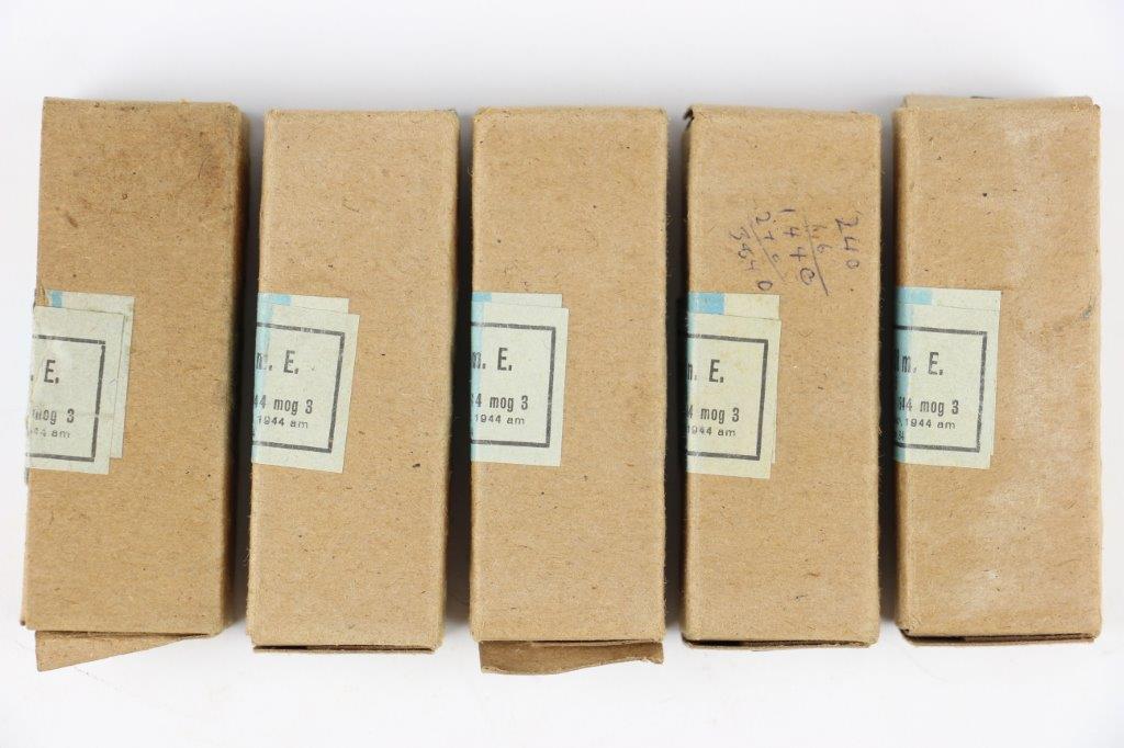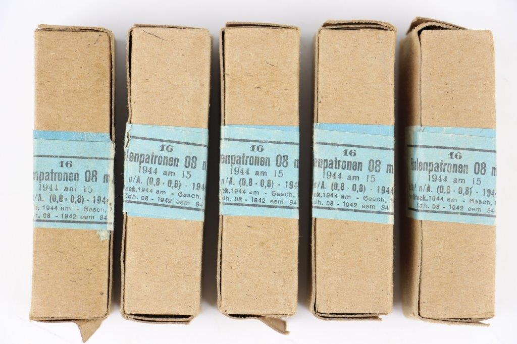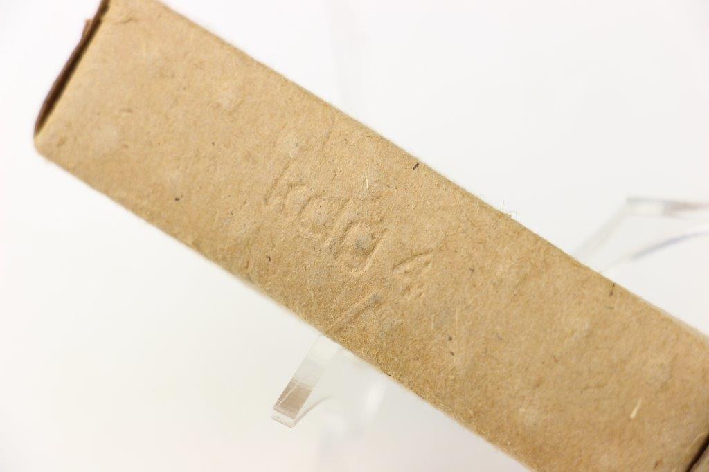 7/29/24 – These are 5 original WW2 production boxes of 9mm German ammunition. Each box is still sealed with the original label intact and unbroken. Each label shows a 1944 packaging date. The boxes are in excellent condition with original staples on each side holding the cardboard together. A few boxes have minor bends along the edges, and one box has writing on the exterior as shown in photos. Each box contains 16 rounds of 9mm ammunition often used with P.38 or Luger (P.08) pistols.