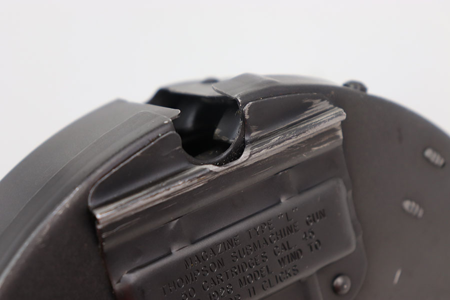 7/29/24 – This is a original 1980’s Thompson SMG type “L” drum magazine by West Hurley. The magazine holds 50 rounds and is fully functional, so please do not purchase if this is not legal in your state. The magazine is in great overall condition with one scratch to the blued finish on the frontside of the magazine. Strong spring but we recommend not winding. the magazine is marked “Type L” for the 1928 model.