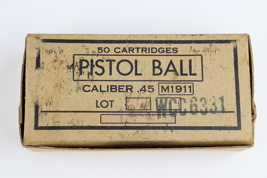 11/2/23 – This is an original box of .45 ACP pistol ammunition from 1942. The ammo is in great condition with some mild aging wear but no major issues. All rounds are head stamped “WCC 42”. Original box in great condition as well.