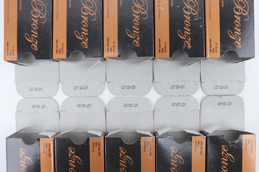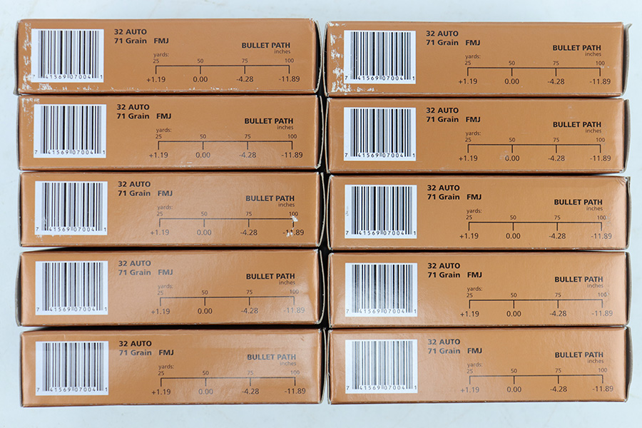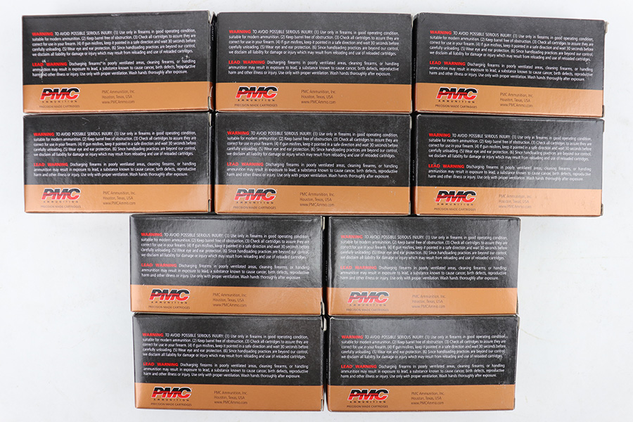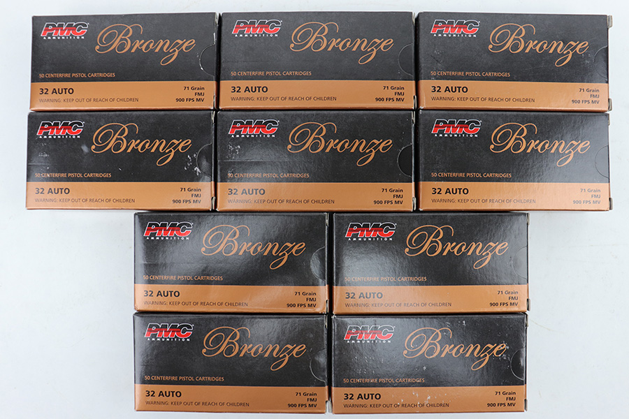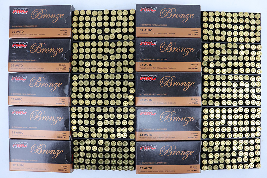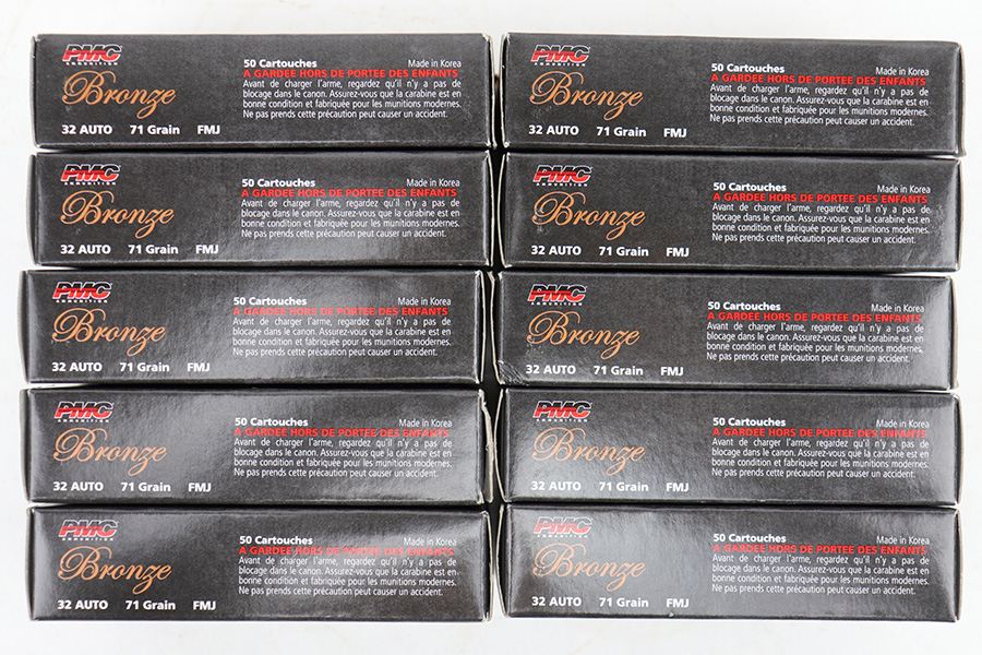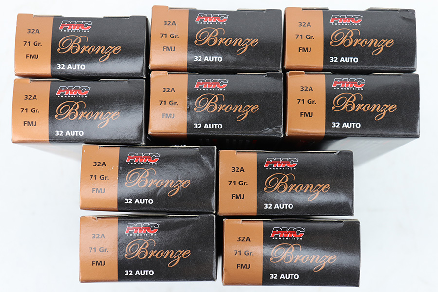 4/12/23 – This is 500 rounds of .32 Auto ammunition by PMC. This is 71 grain FMJ pistol ammunition. 10 boxes of 50 rounds each. Excellent condition in the original boxes.