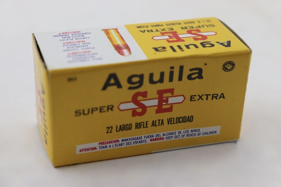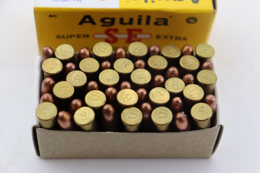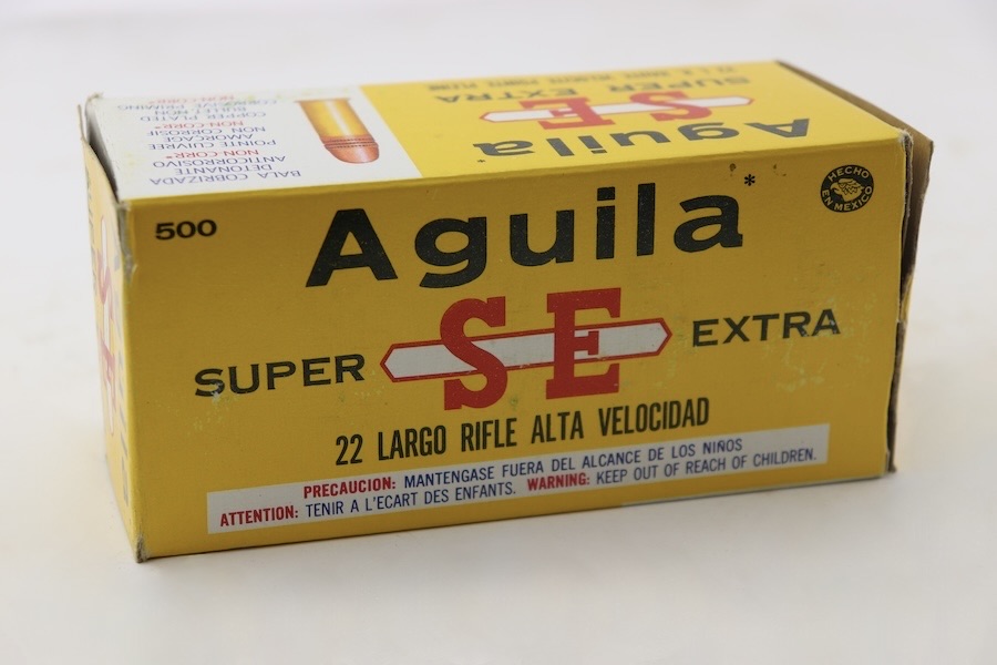 3/20/24 – This lot is for 500 rounds of Aguila .22 Long Rifle ammunition. There are ten individual boxes inside the larger box; each small box contains 50 cartridges. The projectiles are copper painted round nose likley 40 grains with a velocity around 1100 FPS.