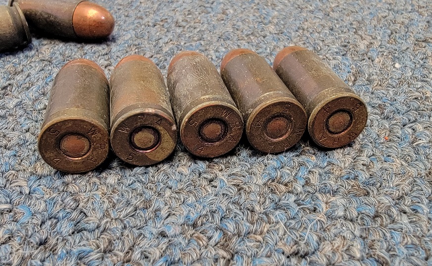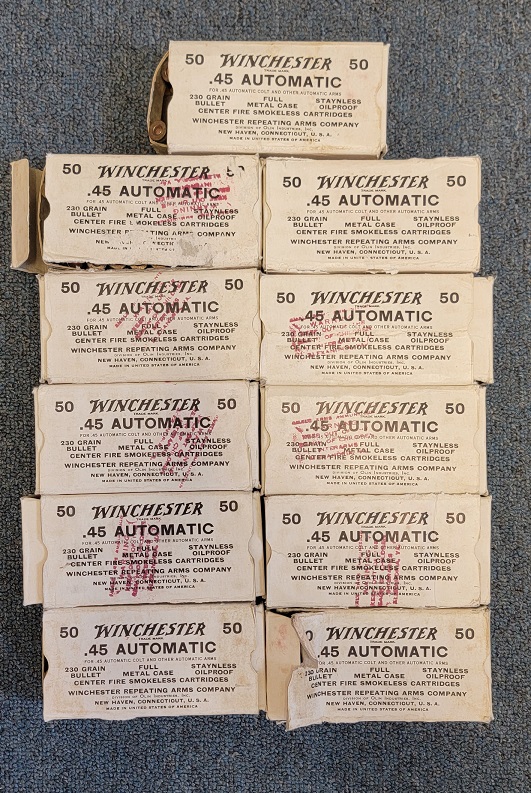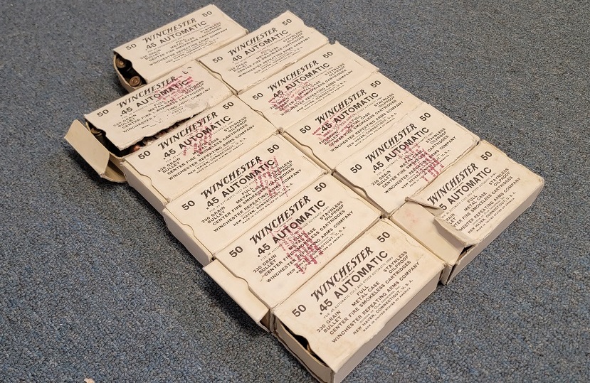 8/23/23 – This is 550 rounds of Winchester .45 Auto pistol ammunition. The ammo is FMJ 230 Grain cartridges in the original boxes. Although the boxes are torn and tattered, the ammunition is in great condition. Head stamped “WRA 54”.