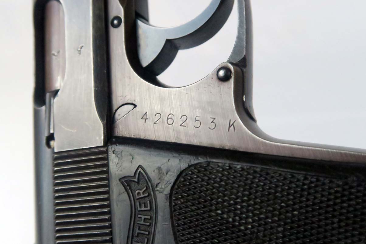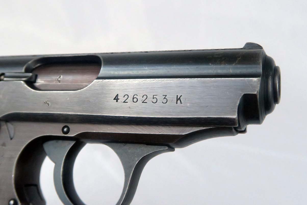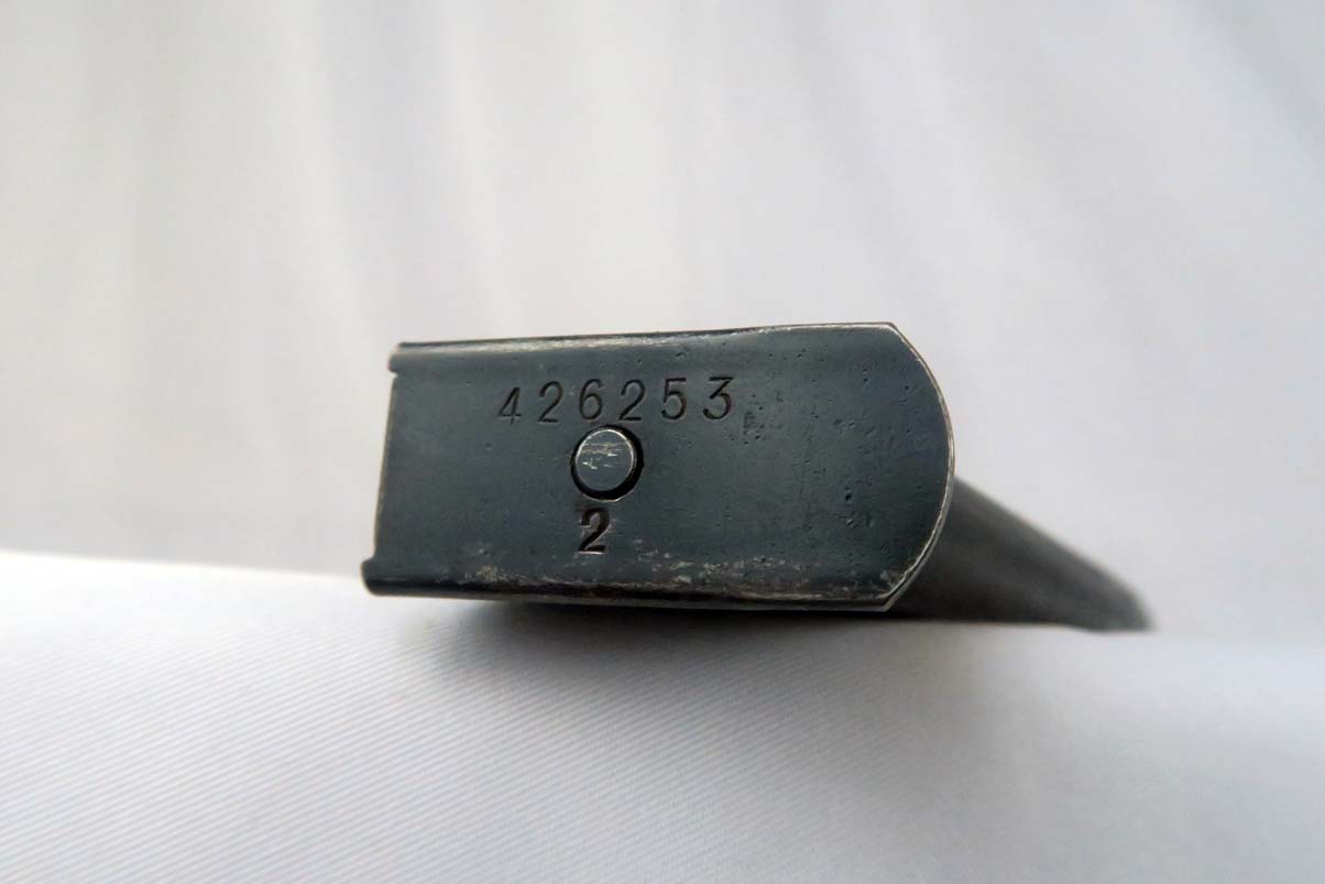 1/6/17 – This is the last variation of SS guns, also referred to in the “Gold Book” on SS PPK’s as the 6th variation. They are late war guns with black grips and a matching magazine – numbered on the bottom.  This one has about 95% of its original finish, with only very minor scratches on the slide but a thinning finish on the front strap.  The grip has some nicks and dings but no major chips or cracks.  Near mint bore.