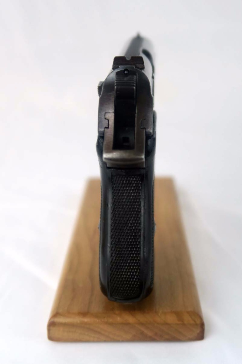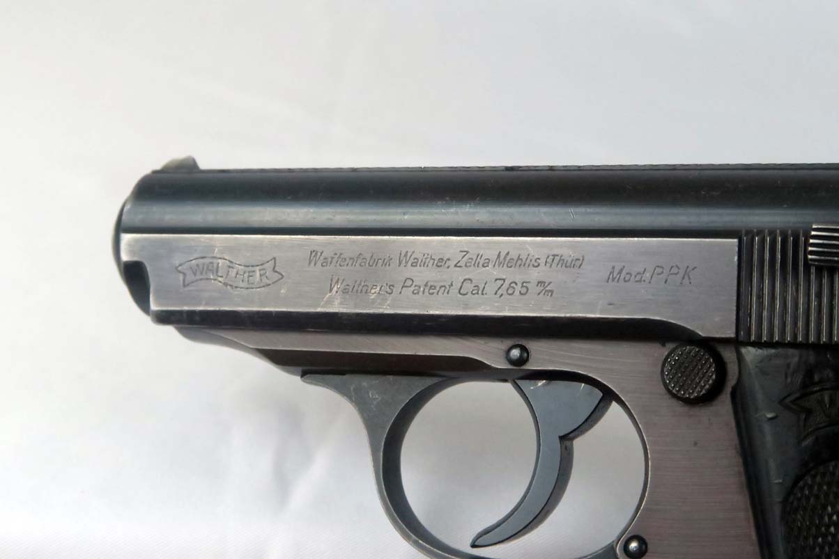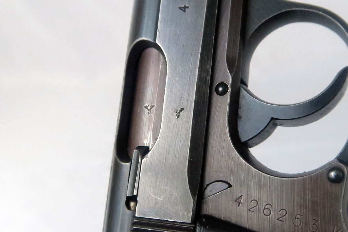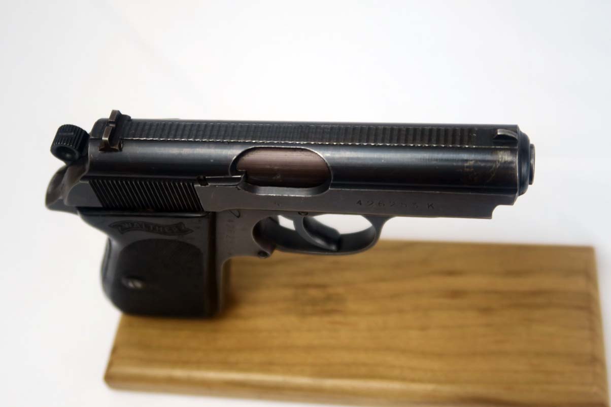 1/6/17 – This is the last variation of SS guns, also referred to in the “Gold Book” on SS PPK’s as the 6th variation. They are late war guns with black grips and a matching magazine – numbered on the bottom.  This one has about 95% of its original finish, with only very minor scratches on the slide but a thinning finish on the front strap.  The grip has some nicks and dings but no major chips or cracks.  Near mint bore.