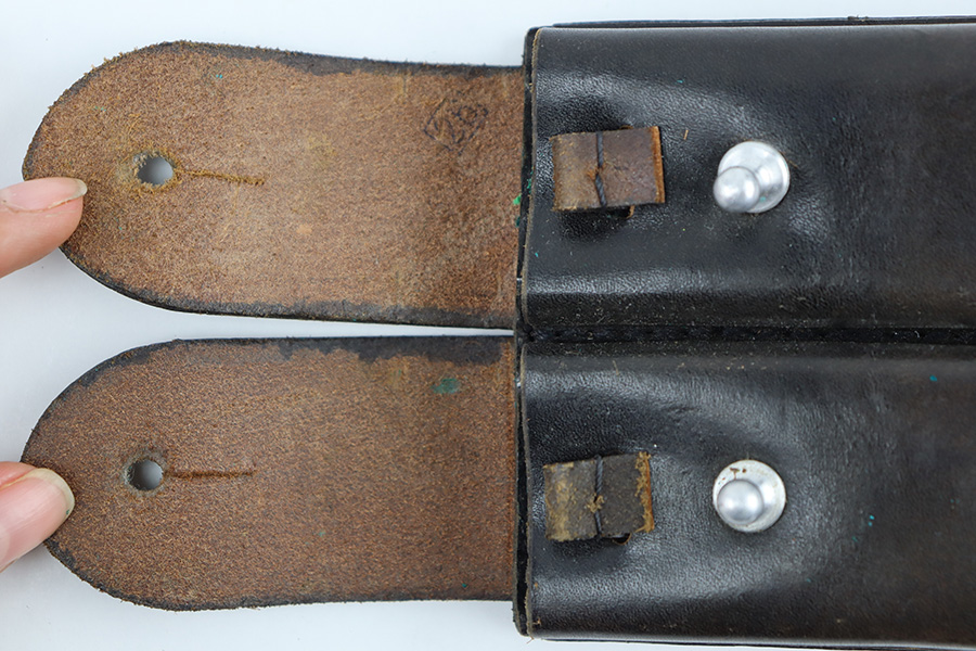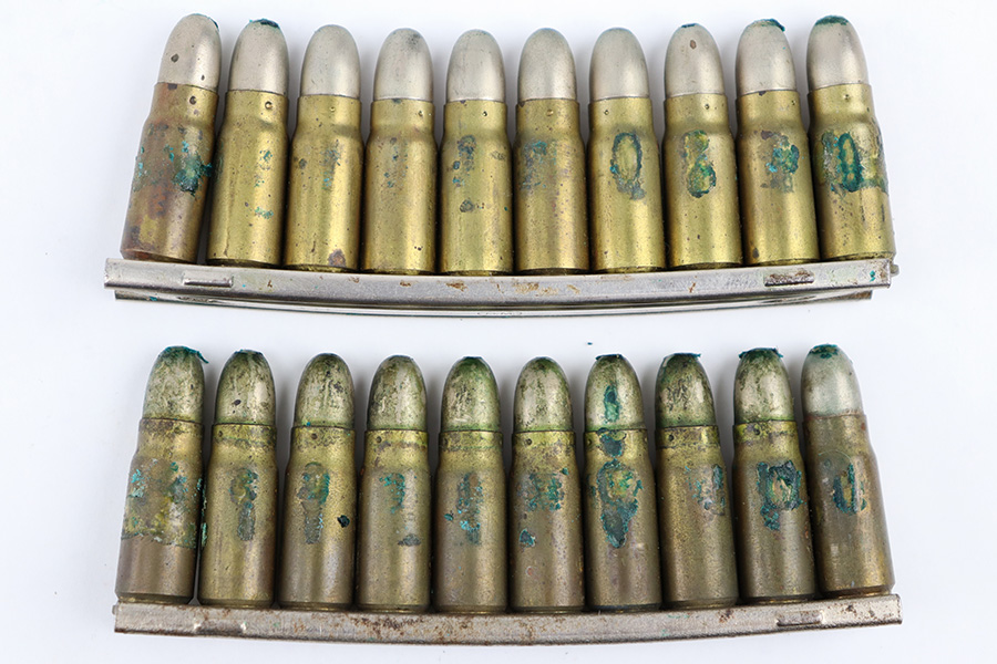 8/22/23 – This is an original pair of commercial Mauser C96 stripper clips with rare WW1 era “DWM” 7.63mm commercial Mauser ammunition. The stripper clips come inside a leather pouch that’s unmarked, but in excellent condition with aluminum metal fixtures (closure knobs, rivets). Also comes with an unmarked C96 cleaning rod. The ammo is aged but in great shape overall with no major issues. The cleaning rod is 28cm long overall, with a wood handle and some light surface patina on the metal. Everything shown in photos is included.