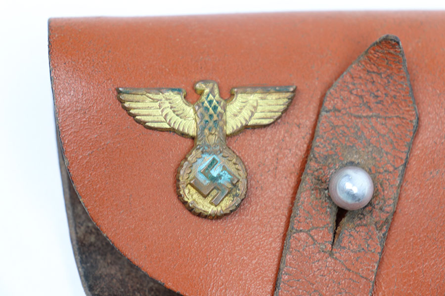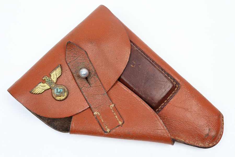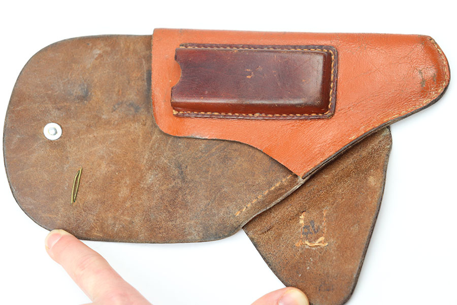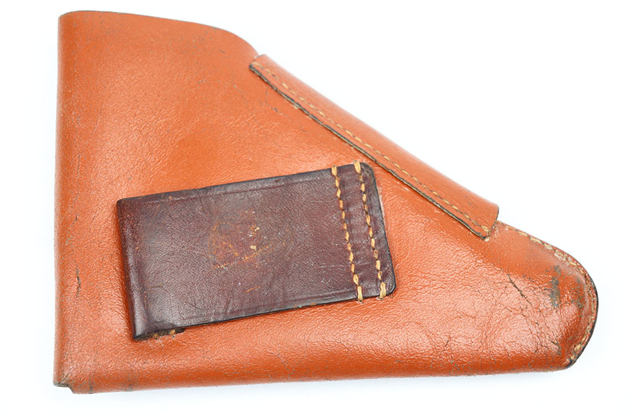 4/8/21 – This is a 7.65mm holster appropriate for a Mauser HSC, Sauer 38h, or similar sized pistol. The brown leather has some mild surface cracking throughout, but is completely in tact. All original stitching in tact as well. No markings or stamps, except for what appears to be a police eagle affixed to the front of the holster.