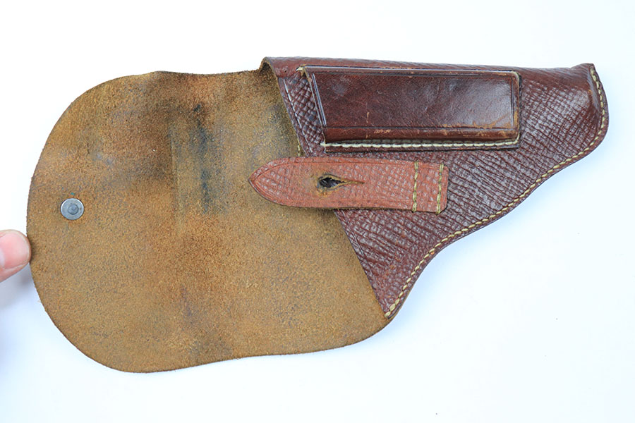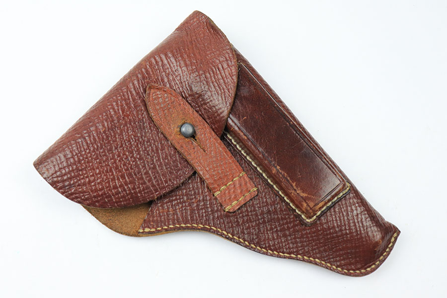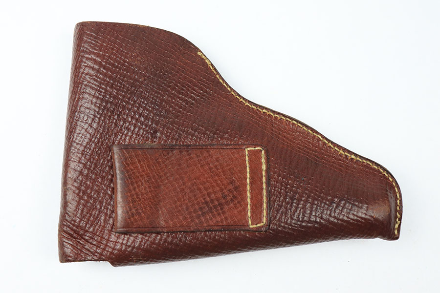 9/3/21 – This is a very nice brown leather unmarked holster from the WW2 era. The holster would be a good fit with a French Unique, but would also work with most 7.65mm Axis pistols. Clean brown leather and excellent stitching throughout.