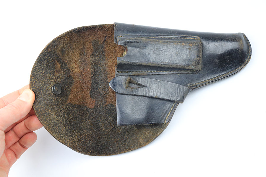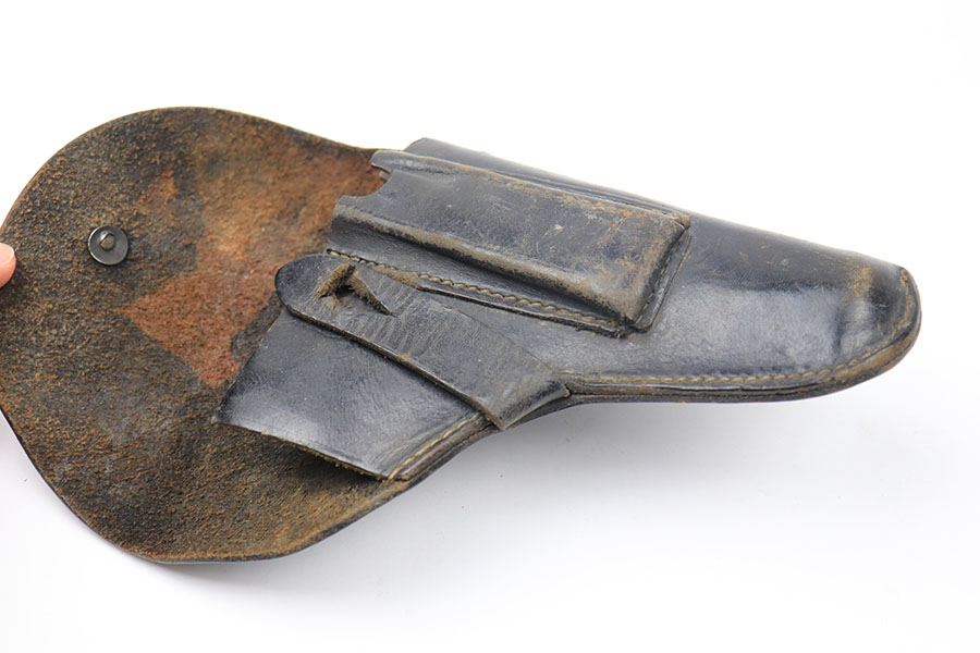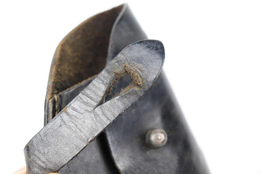 11/11/21 – This is an unmarked holster for a 7.65mm pistol. The holster is similar style to others we’ve seen paired with French MAB and French Unique pistols. The leather is in tact and in great shape. No stitching issues. Some typical signs of aging and previous use.