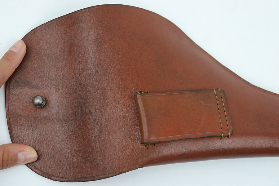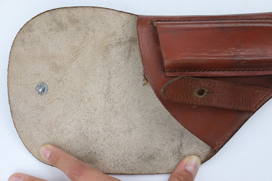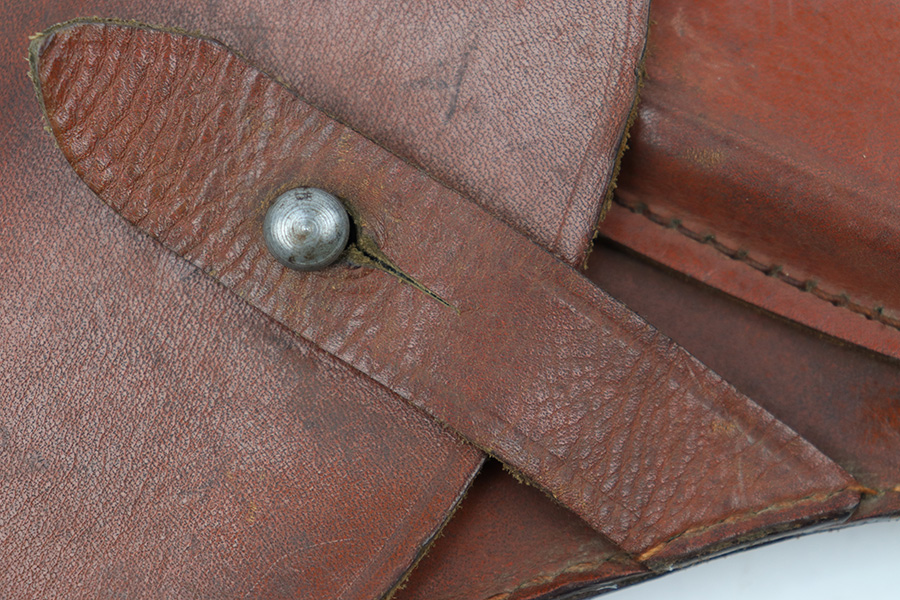 4/7/23 – This is an unmarked 7.65mm holster from WW2. The holster is a similar style to most Kriegsmarine Mauser holsters, although the size is slightly larger. We’ve seen examples of this style that were “PDM” (Munich Police) stamped, but this example has no such markings. The leather is aged and has normal pliability but a very clean interior. All original stitching is tight and intact. Steel closure knob. Measures about 7 inches long when closed, and 5.5 inches wide at the top of the holster. Fits most 7.65mm Axis pistols.