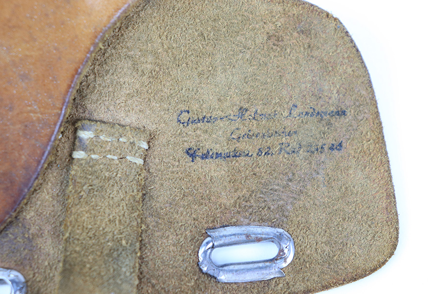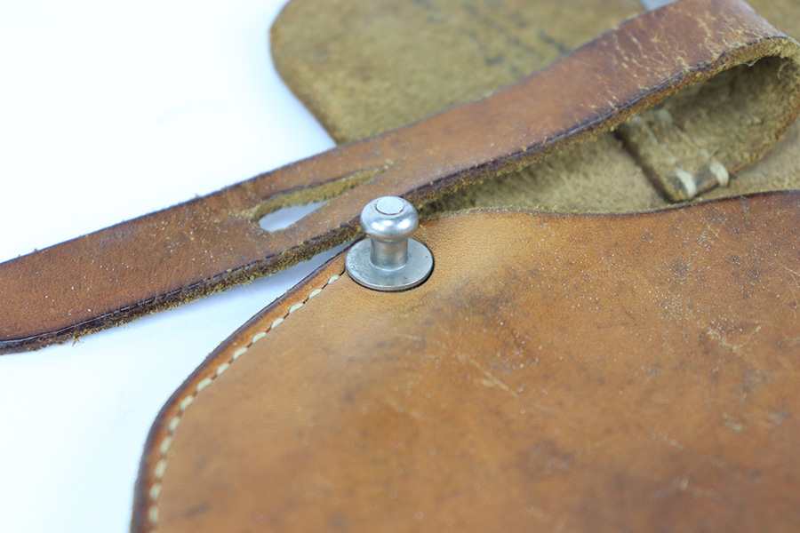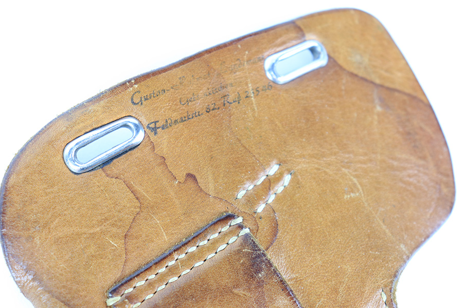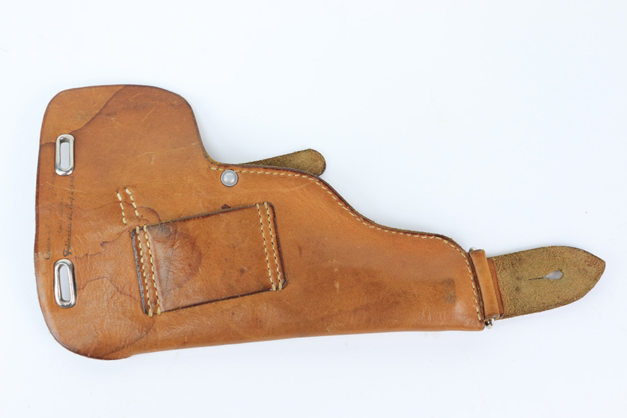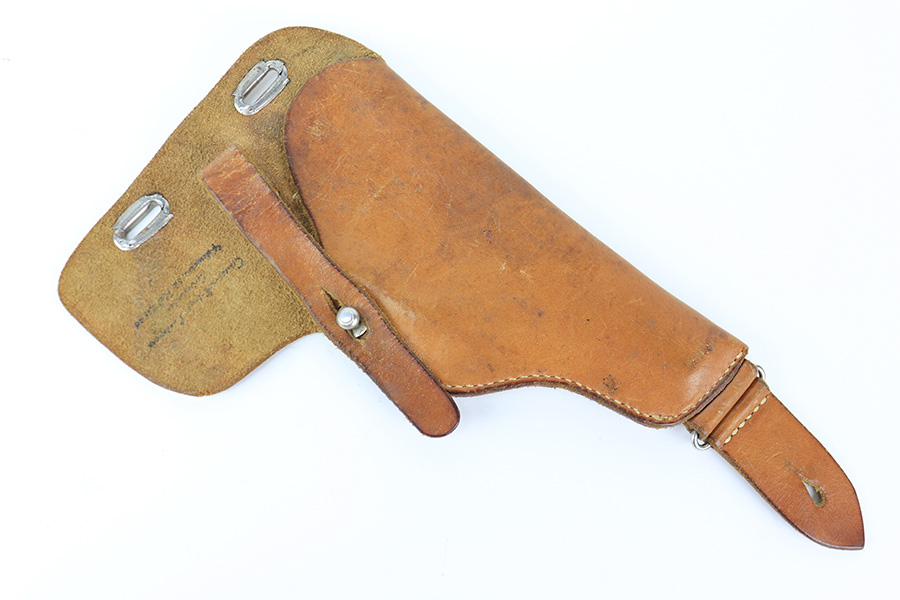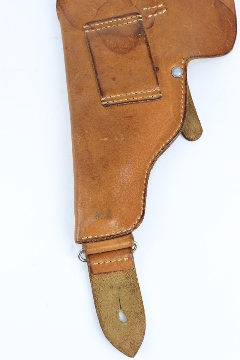 3/23/22 – This is an interesting, fairly scarce variation shoulder holster for a Walther model 4 or similar sized 7.65mm pistol. We’ve seen this style before with AKAH DRGM maker stamps, but this holster has no stamps or markings. The size is also a little larger than other AKAH made shoulder holsters from WW2. The holster measures about 8 inches from the top to the toe, and about 5.5 inches wide at the widest point. The leather style and stitching are similar to other WW2 era production holsters, but the knob is a slightly unusual shape, so we aren’t sure exactly when this was made. Regardless, we believe this is a scarce shoulder holster, most likely for a Walther model 4.