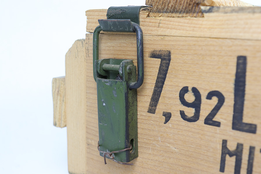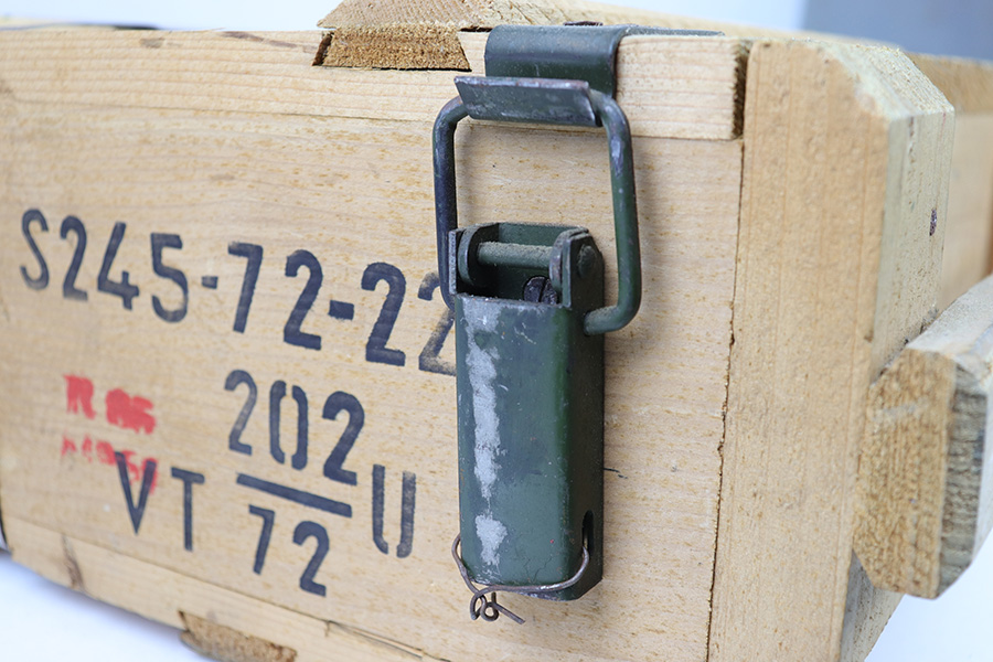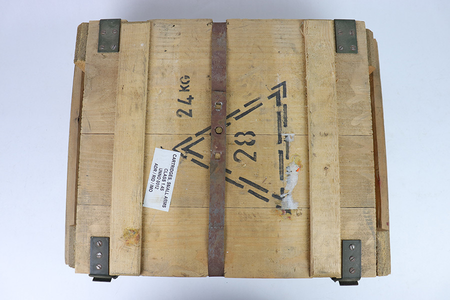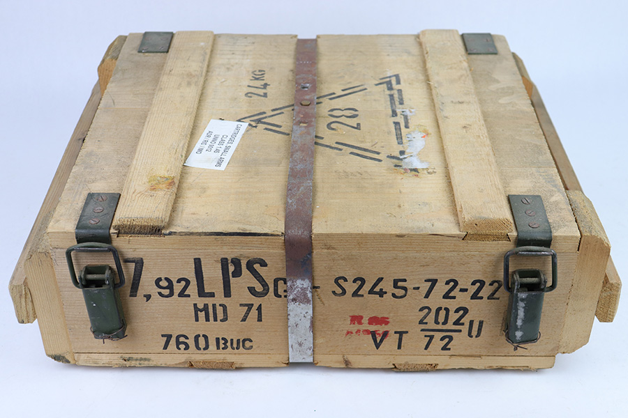 10/9/23 – This is an unopened wooden crate of 1972 production 7.92x57mm ammunition. From our research we found this to be Romanian surplus ammo, with each crate holding 760 rounds. See the last photo of what an opened crate looks like inside (note that this is a sealed crate, never opened). The crate is in excellent condition so we assume the rounds inside are also excellent.