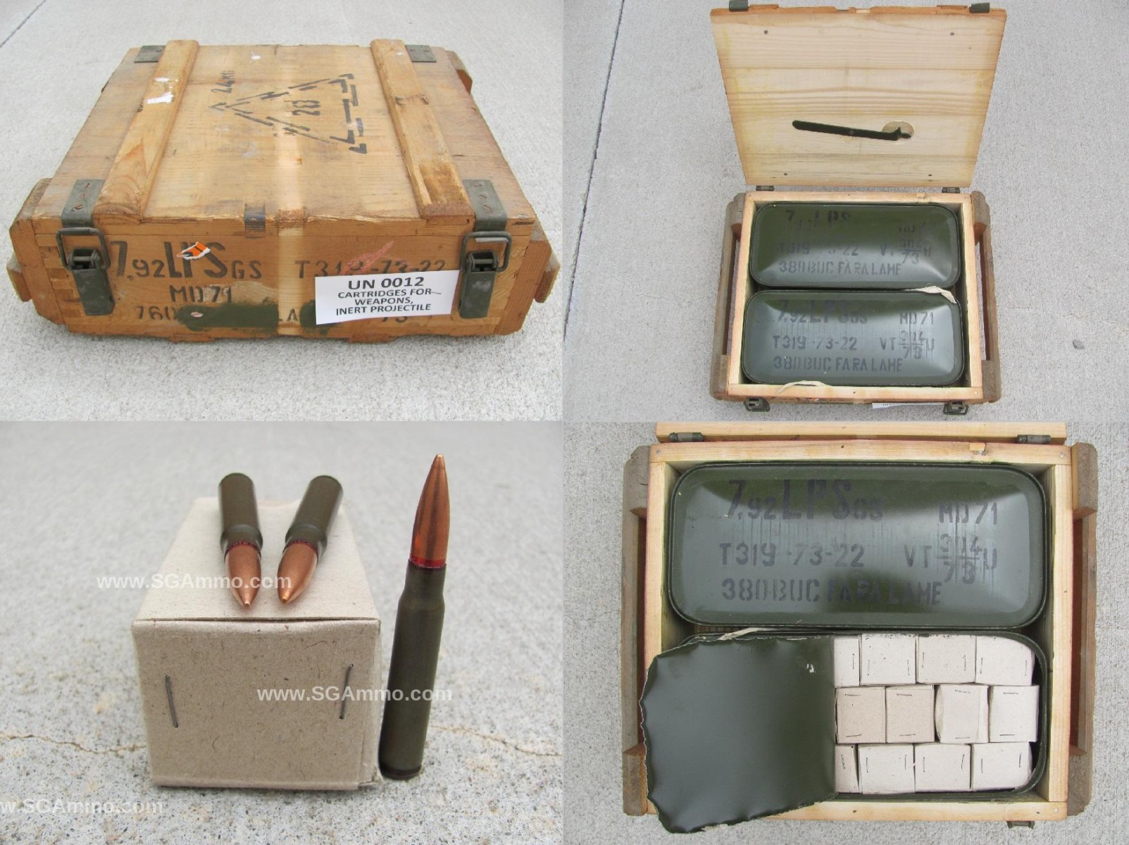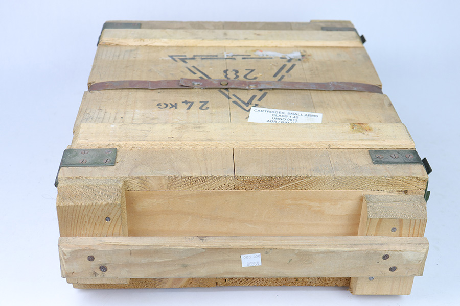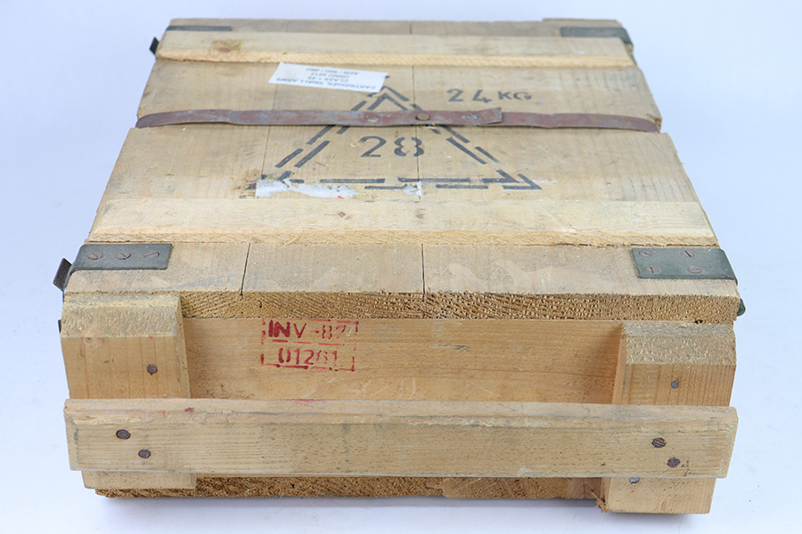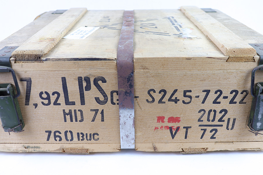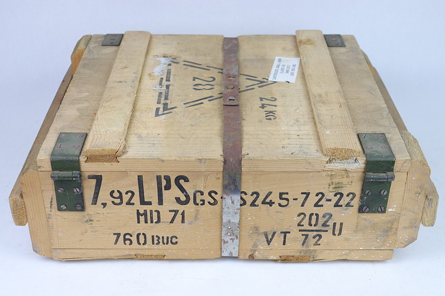 3/27/23 – This is an unopened wooden crate of 1972 production 7.92x57mm ammunition. From our research we found this to be Romanian surplus ammo, with each crate holding 760 rounds. See the last photo of what an opened crate looks like inside (note that this is a sealed crate, never opened). The crate is in excellent condition so we assume the rounds inside are also excellent.