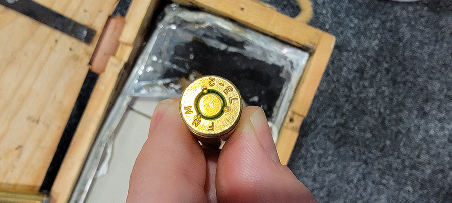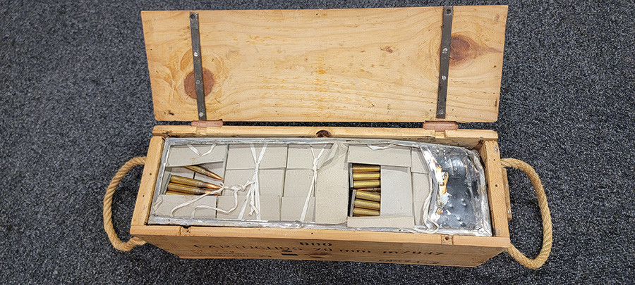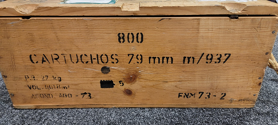 11/17/23 – This is a wood crate of 8mm Mauser rifle ammunition. Spanish production from the 1970’s. The ammunition comes on stripper clips as shown, and inside the original wood crate.