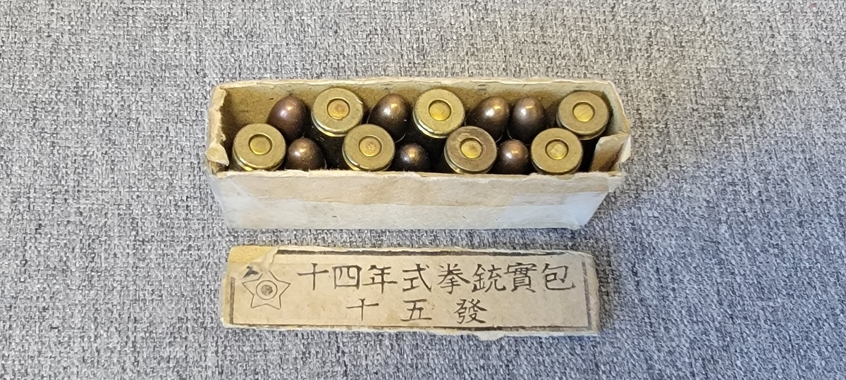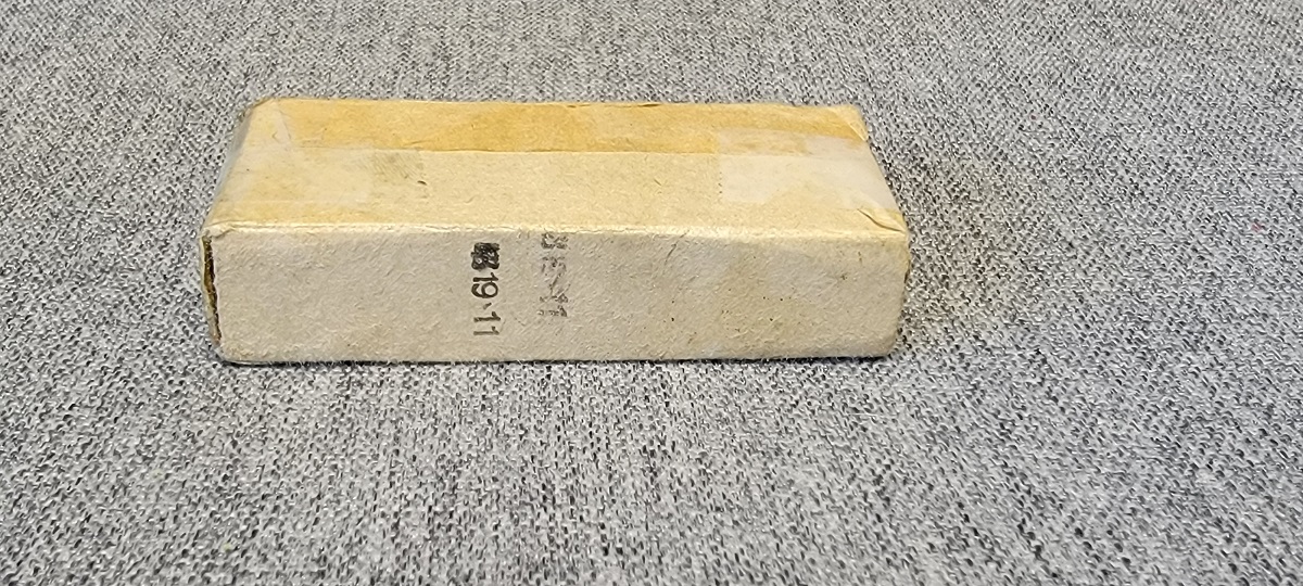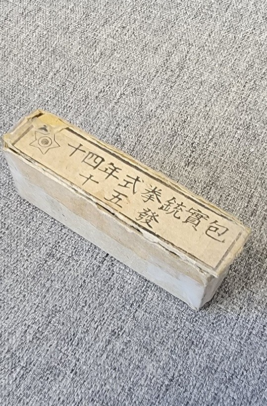5/8/23 – This is an original box of 1944 dated Japanese Type 14 / Type 94 8mm pistol ammunition. The ammo comes in the original box as shown. There are only 14 total rounds (2 rounds missing), and all are unmarked and in great condition. The box lid is detached, but still included. The underside of the box is date stamped in ink as shown.