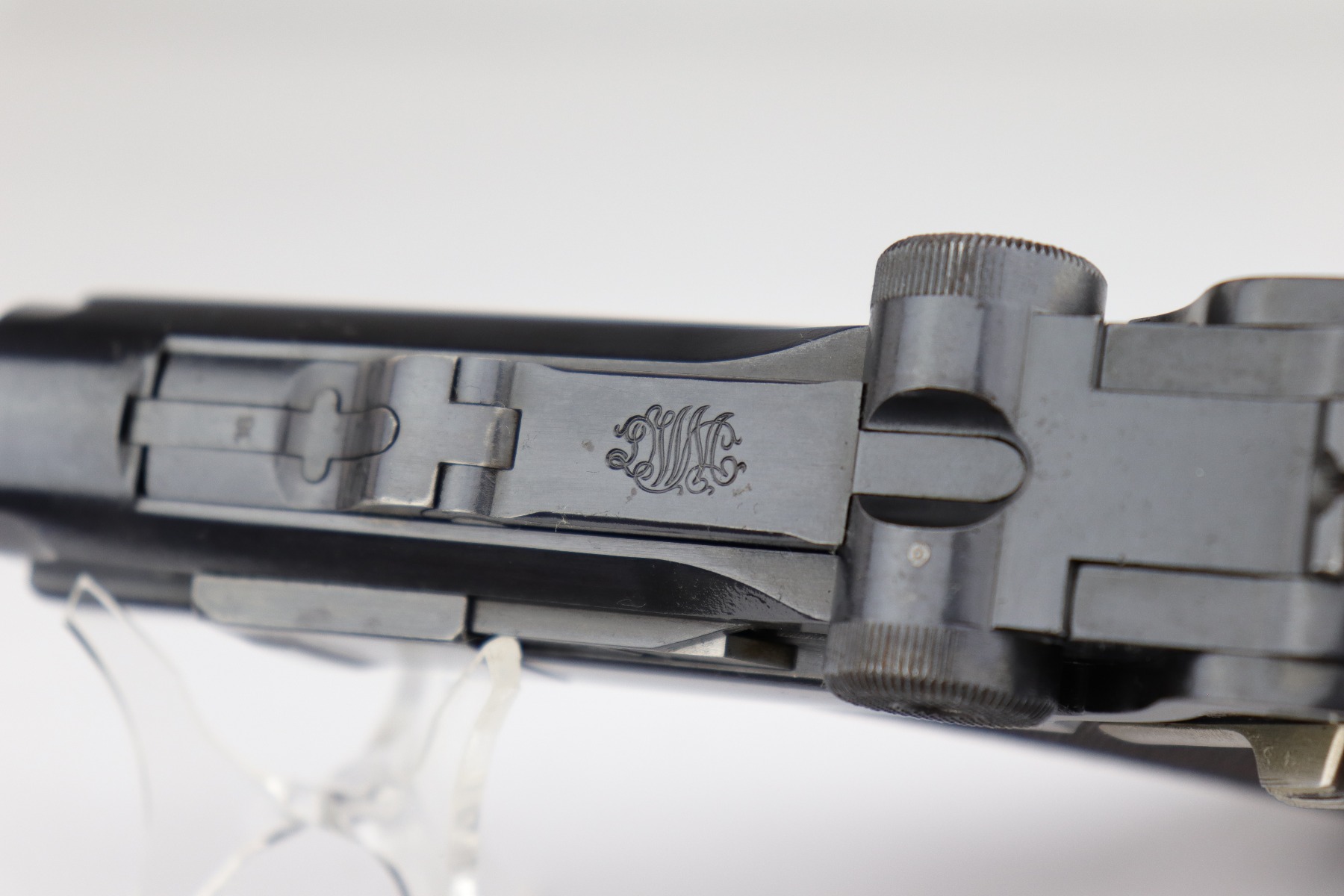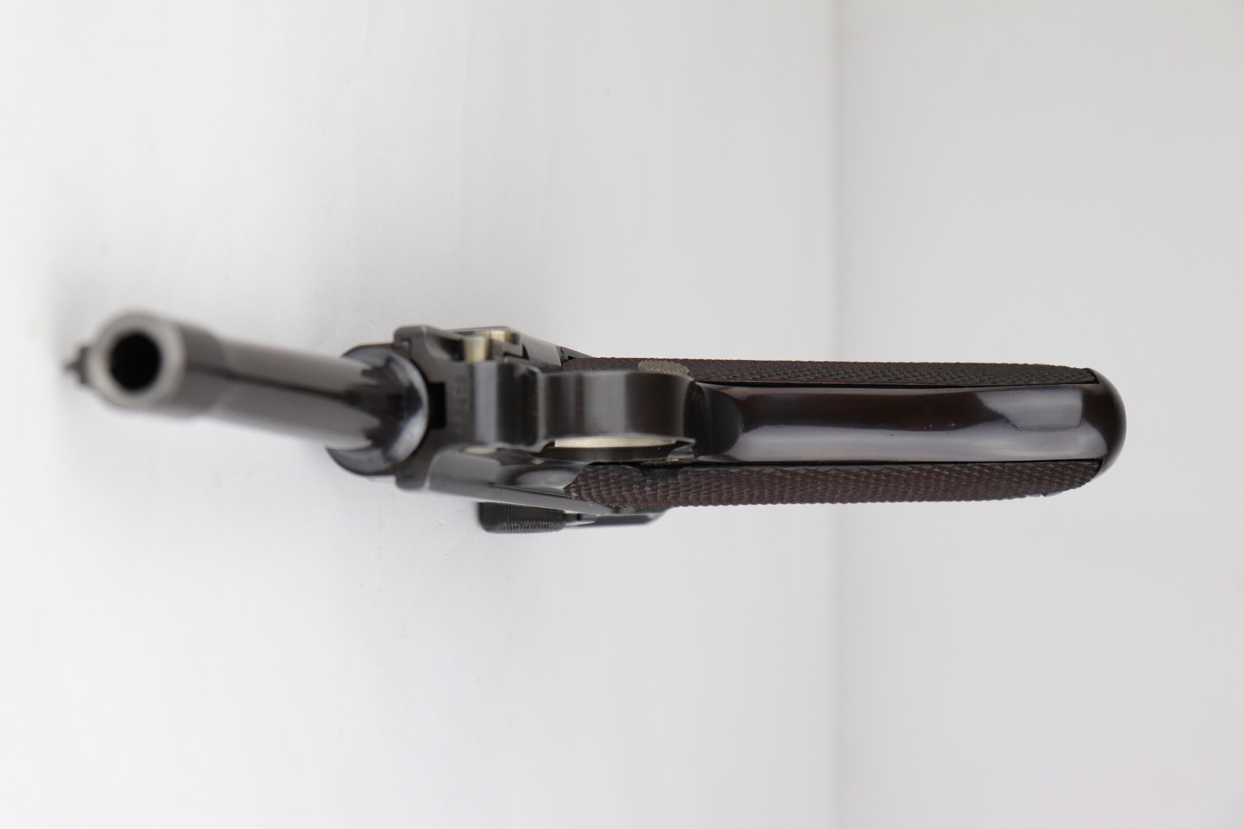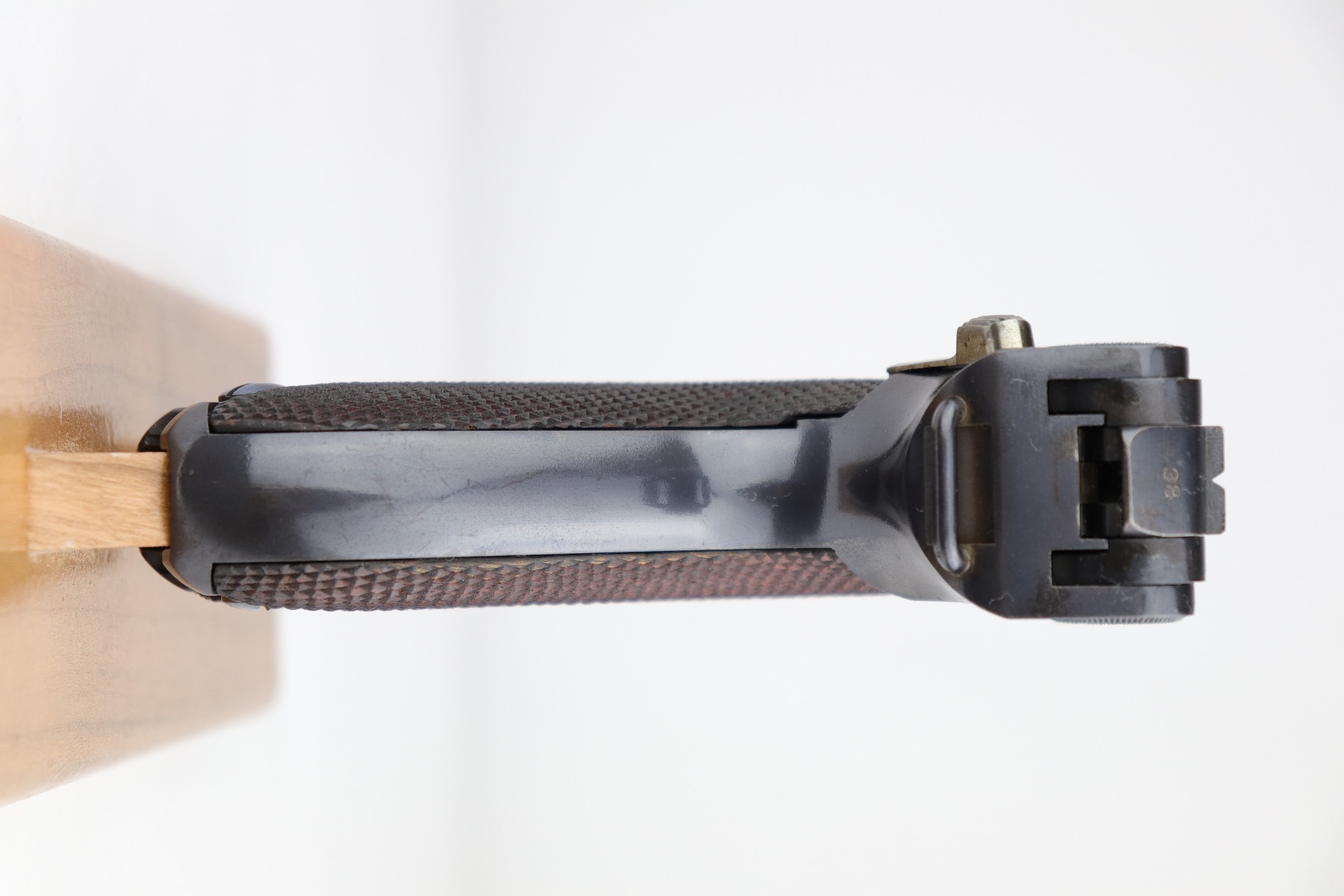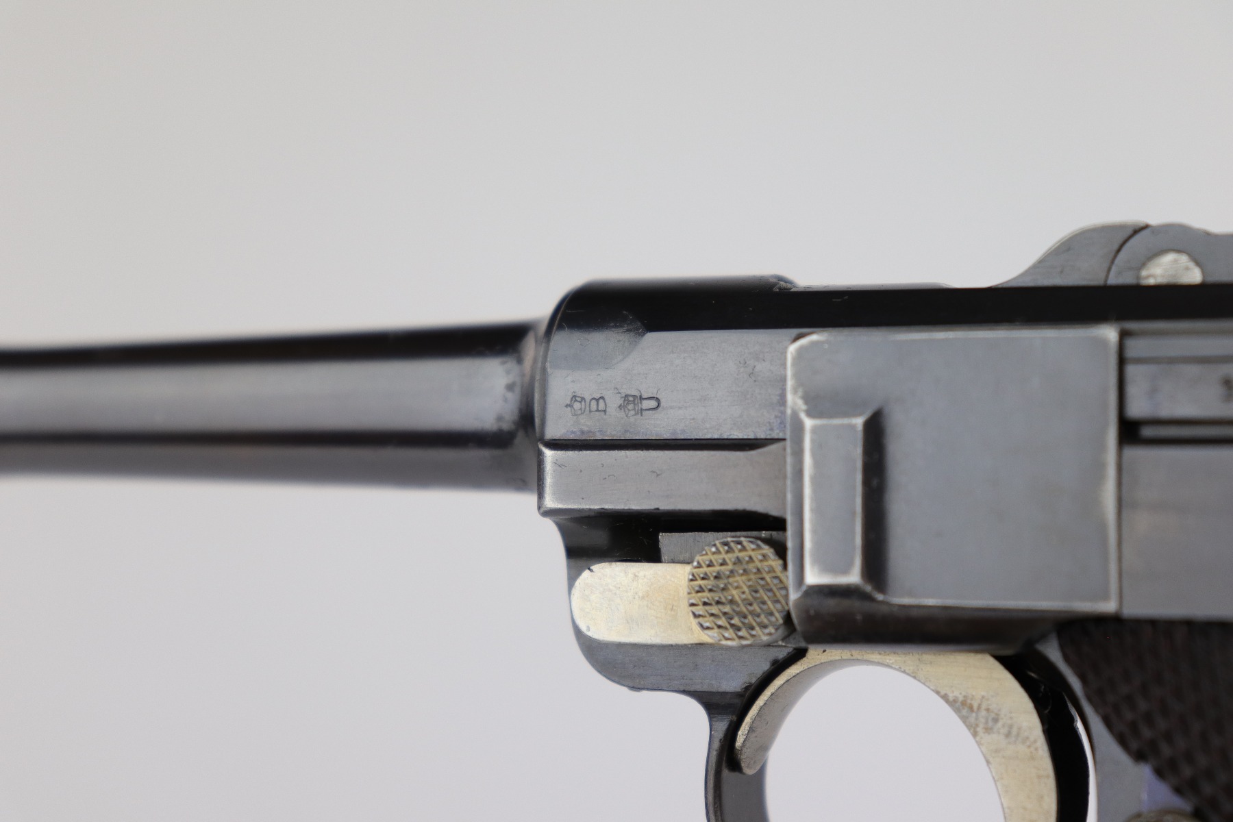 6/11/19 – This is an original Commercial DWM Luger in 9mm. The pistol has “BUG” proofs, which are the three different commercial proof stamps, all on the same gun. Interestingly, the “G” is missing from the frame, but is evident on the barrel. This is likely due to some type of human error as the “G” inspector missed the frame somehow. The pistol is all matching with non-numbered grips and non-numbered magazine. Very sharp diamond pattern on the grips. The condition is hard to rate (roughly 95%) due to the evidence of refinish on ONLY the front strap and barrel. The front strap and barrel have browning coloration evident under strong light. This is only evident on the front strap and barrel – we added photos of the front strap to give a better idea. The other wear on the gun is basically on the straw parts. The finish looks excellent everywhere else. Clean, strong bore is shiny and 9/10 overall. Priced to SELL based our suspicion of the touch up on the front strap and barrel.