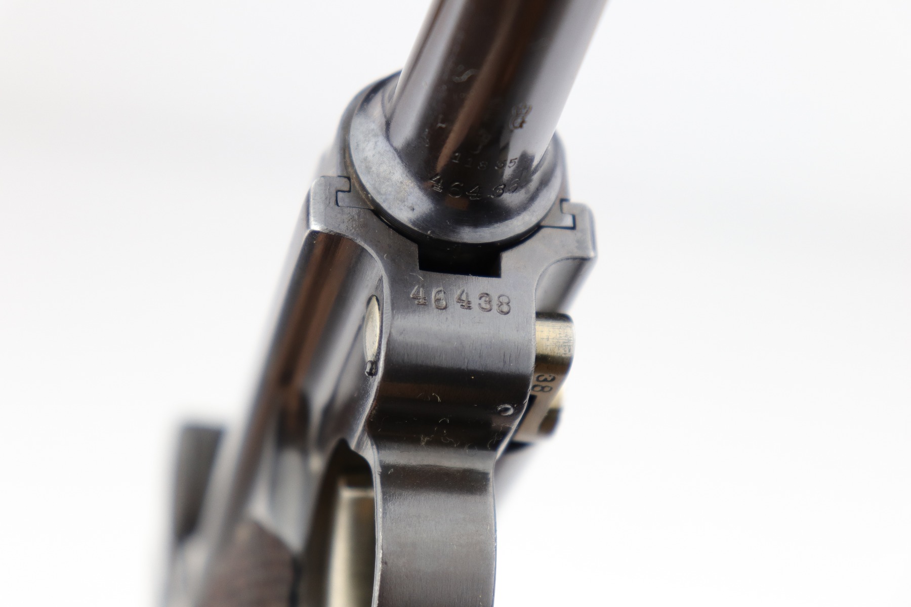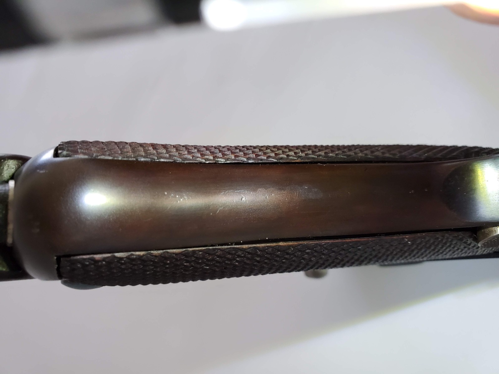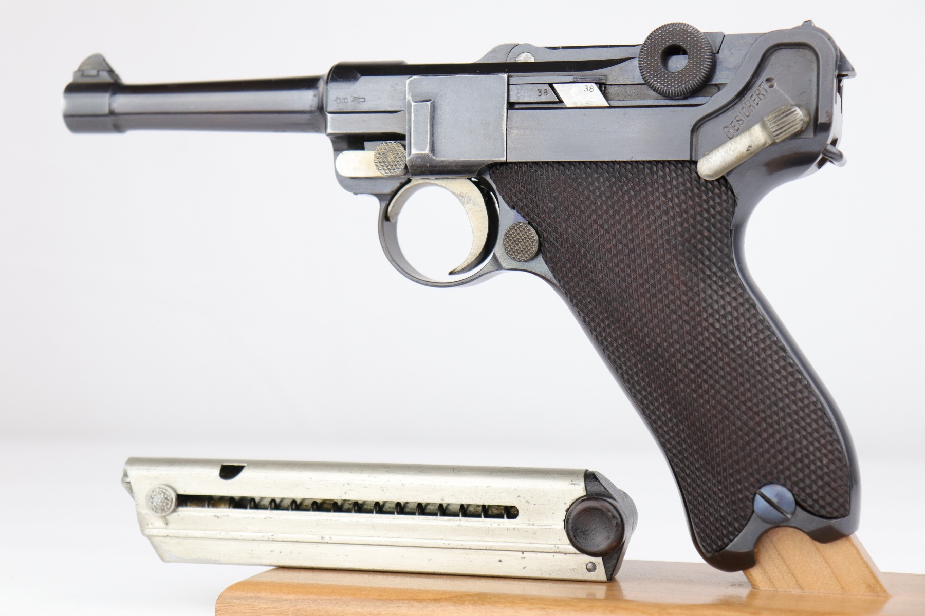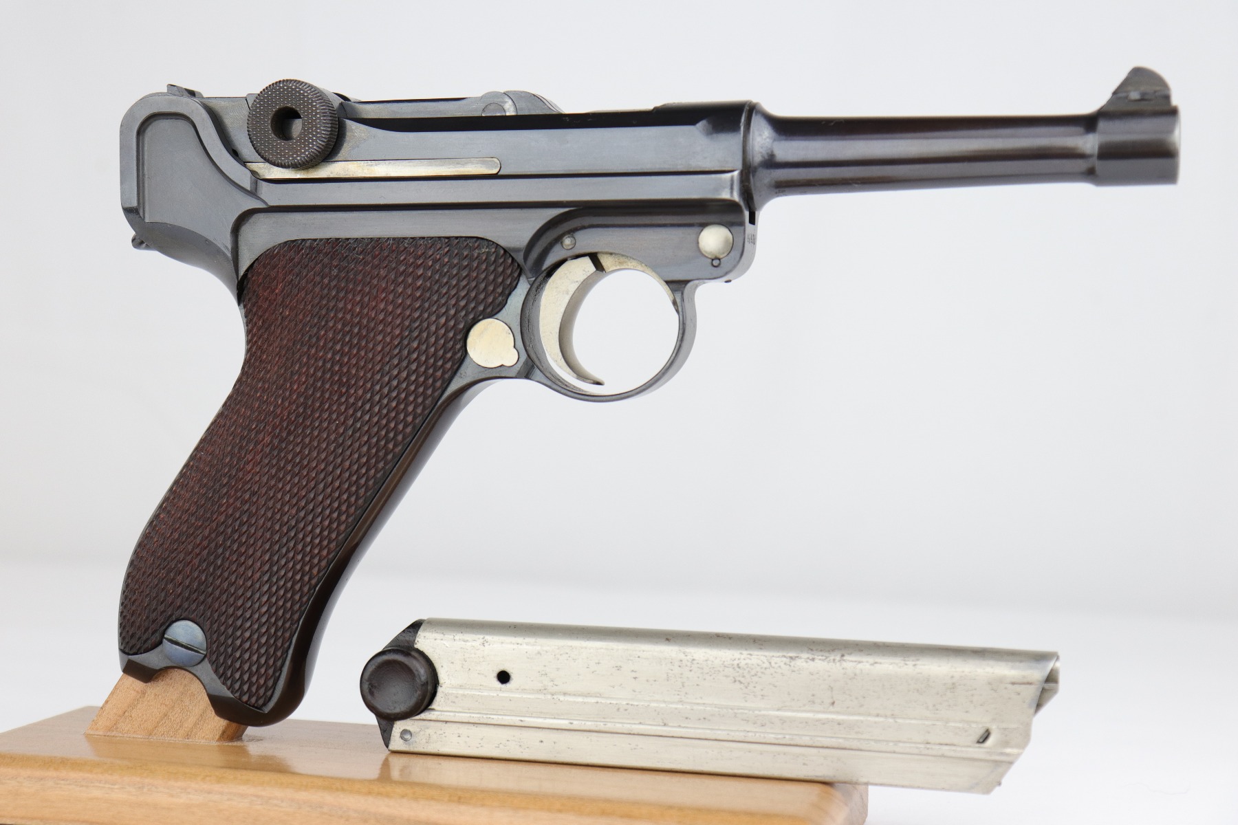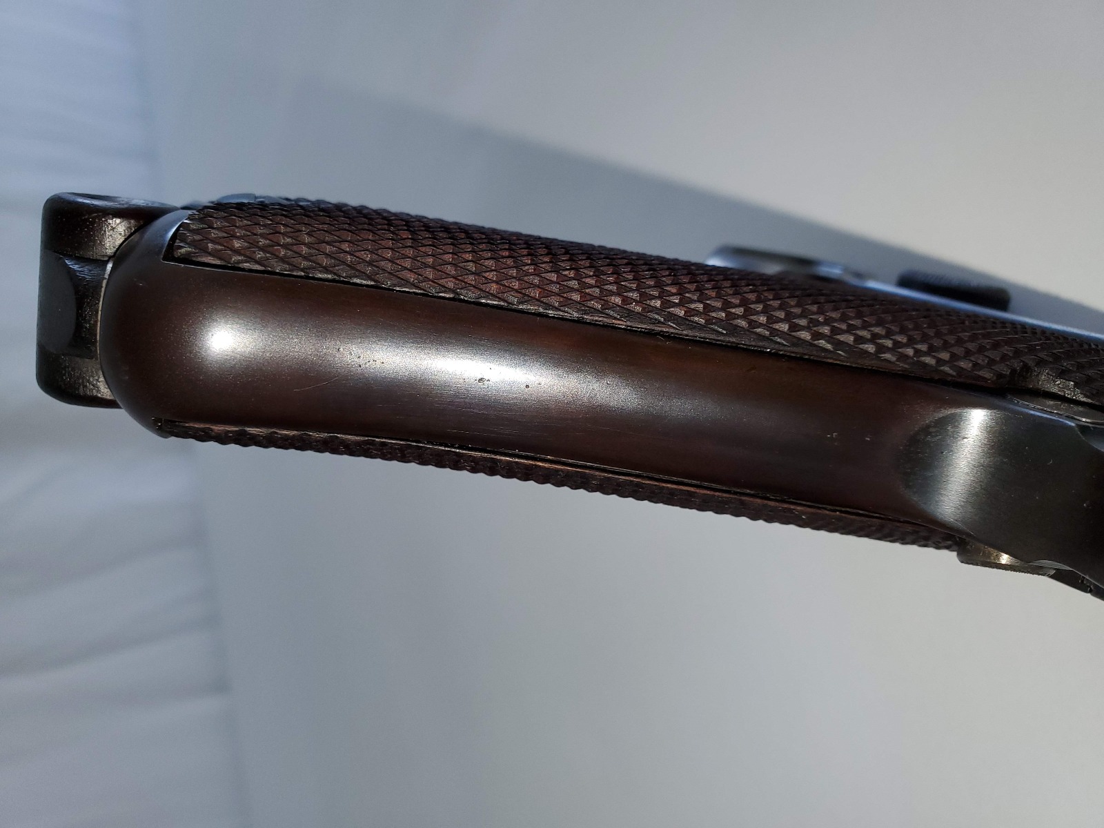 6/11/19 – This is an original Commercial DWM Luger in 9mm. The pistol has “BUG” proofs, which are the three different commercial proof stamps, all on the same gun. Interestingly, the “G” is missing from the frame, but is evident on the barrel. This is likely due to some type of human error as the “G” inspector missed the frame somehow. The pistol is all matching with non-numbered grips and non-numbered magazine. Very sharp diamond pattern on the grips. The condition is hard to rate (roughly 95%) due to the evidence of refinish on ONLY the front strap and barrel. The front strap and barrel have browning coloration evident under strong light. This is only evident on the front strap and barrel – we added photos of the front strap to give a better idea. The other wear on the gun is basically on the straw parts. The finish looks excellent everywhere else. Clean, strong bore is shiny and 9/10 overall. Priced to SELL based our suspicion of the touch up on the front strap and barrel.