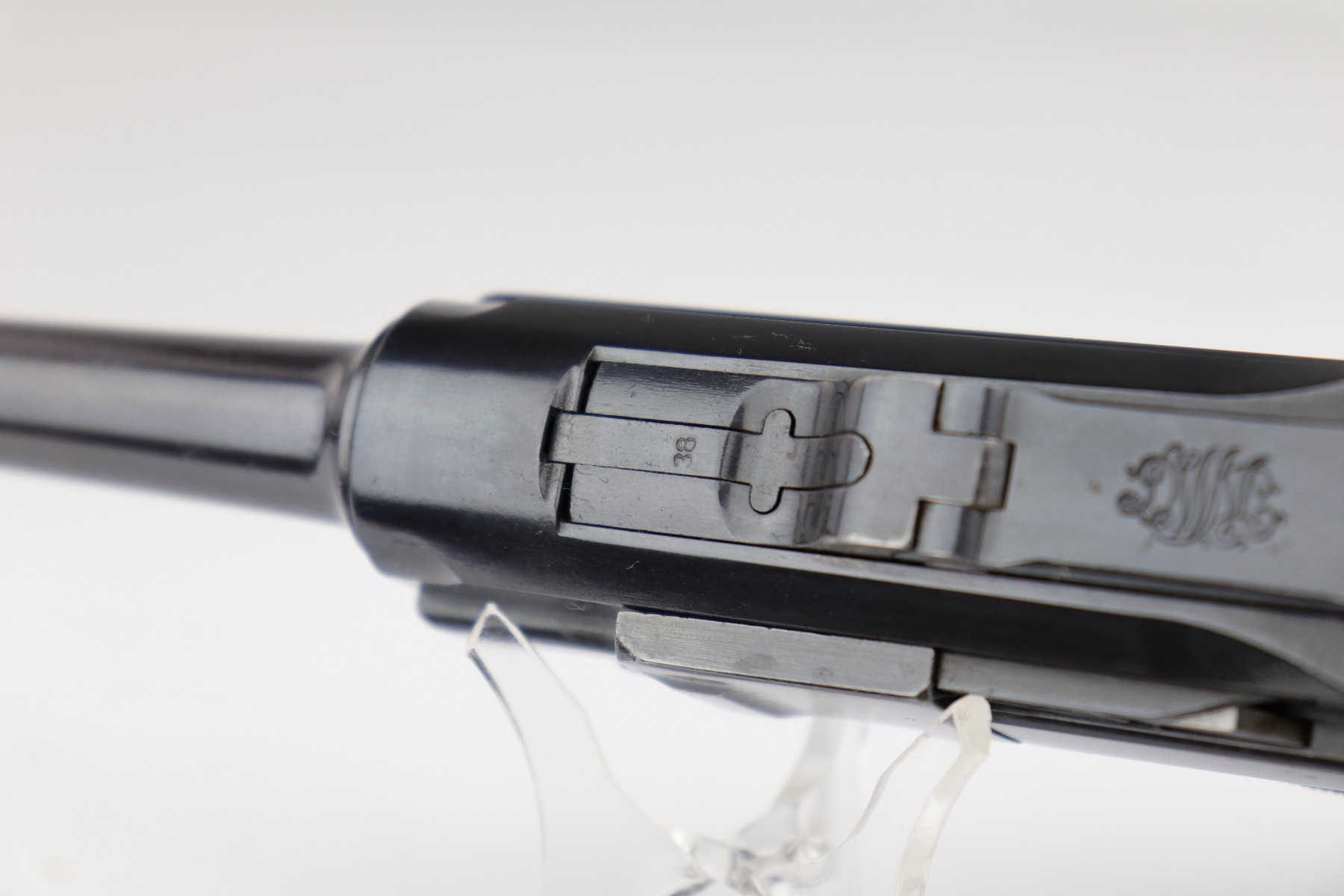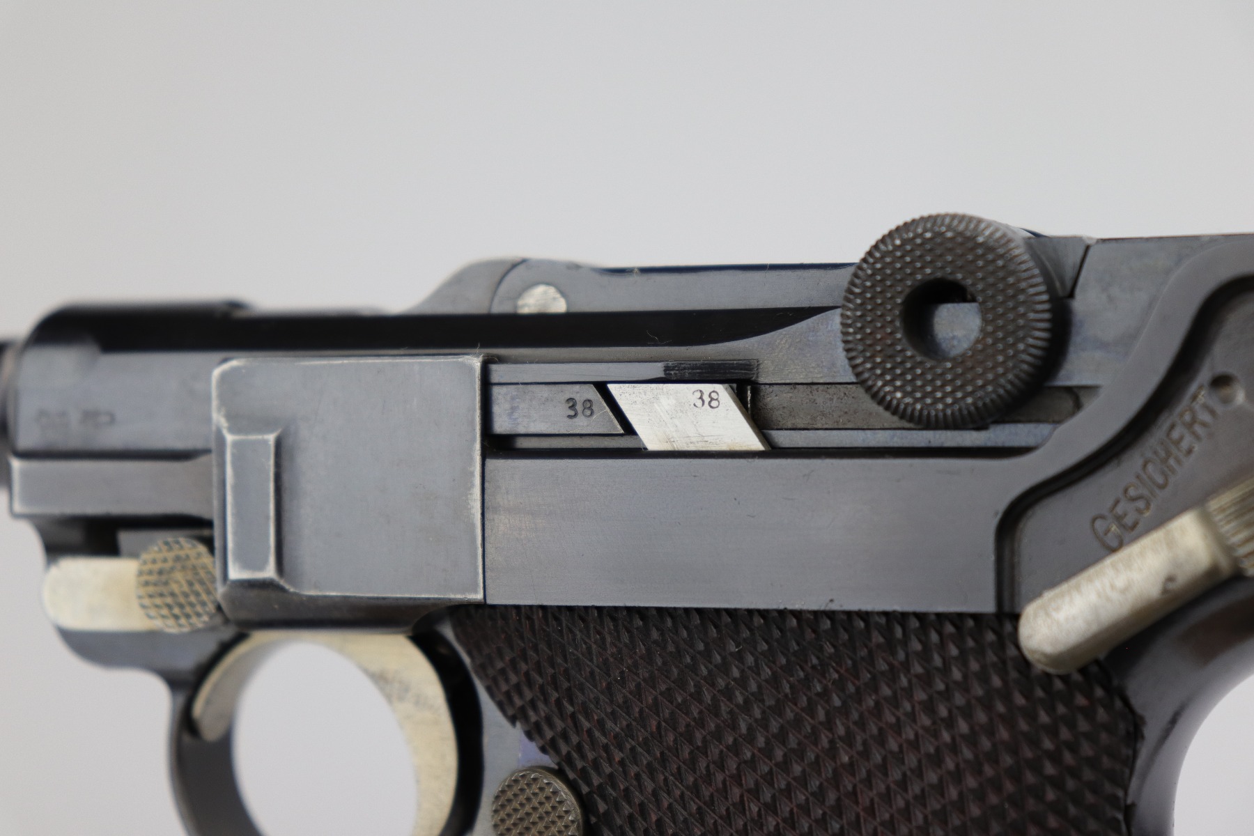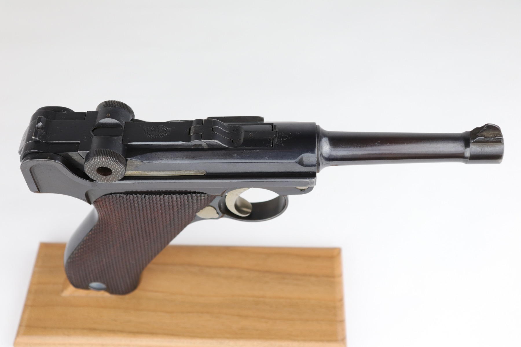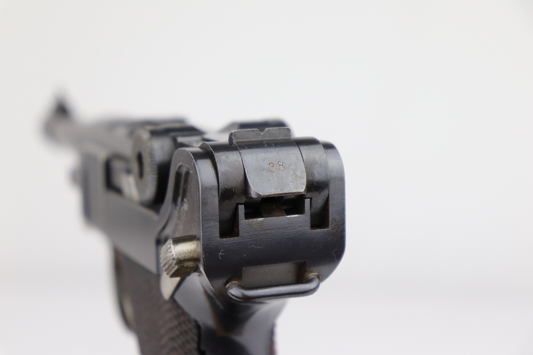6/11/19 – This is an original Commercial DWM Luger in 9mm. The pistol has “BUG” proofs, which are the three different commercial proof stamps, all on the same gun. Interestingly, the “G” is missing from the frame, but is evident on the barrel. This is likely due to some type of human error as the “G” inspector missed the frame somehow. The pistol is all matching with non-numbered grips and non-numbered magazine. Very sharp diamond pattern on the grips. The condition is hard to rate (roughly 95%) due to the evidence of refinish on ONLY the front strap and barrel. The front strap and barrel have browning coloration evident under strong light. This is only evident on the front strap and barrel – we added photos of the front strap to give a better idea. The other wear on the gun is basically on the straw parts. The finish looks excellent everywhere else. Clean, strong bore is shiny and 9/10 overall. Priced to SELL based our suspicion of the touch up on the front strap and barrel.