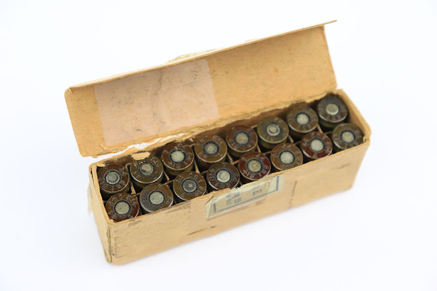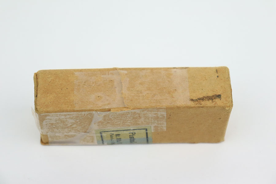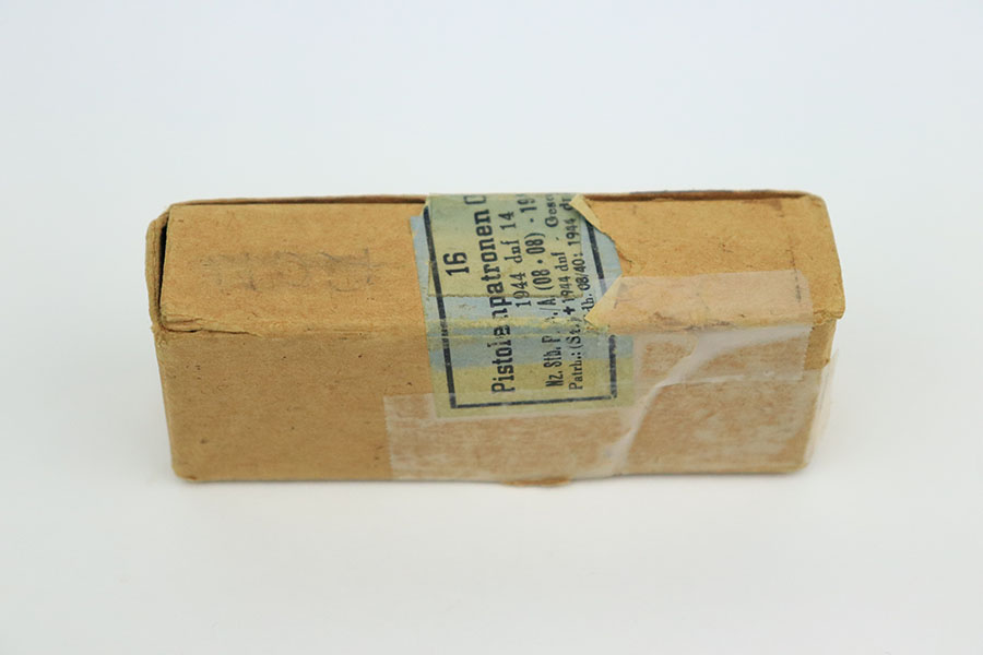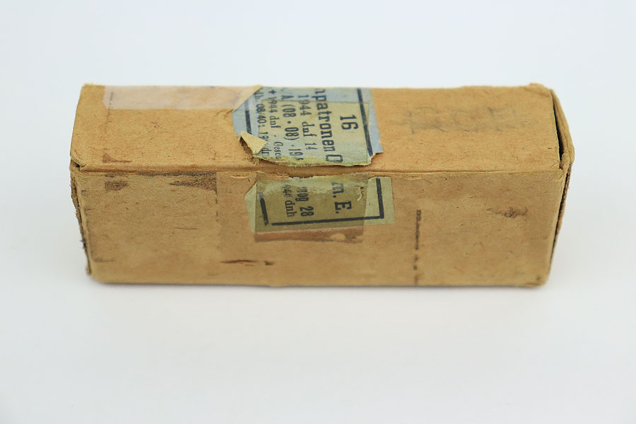 10/10/22 – This is a box of 9mm Luger ammunition from WW2. The box is original and 1944 dated on the original label. The box is currently held together with tape, but still holds all 16 rounds without issue. All rounds are original and in great condition.