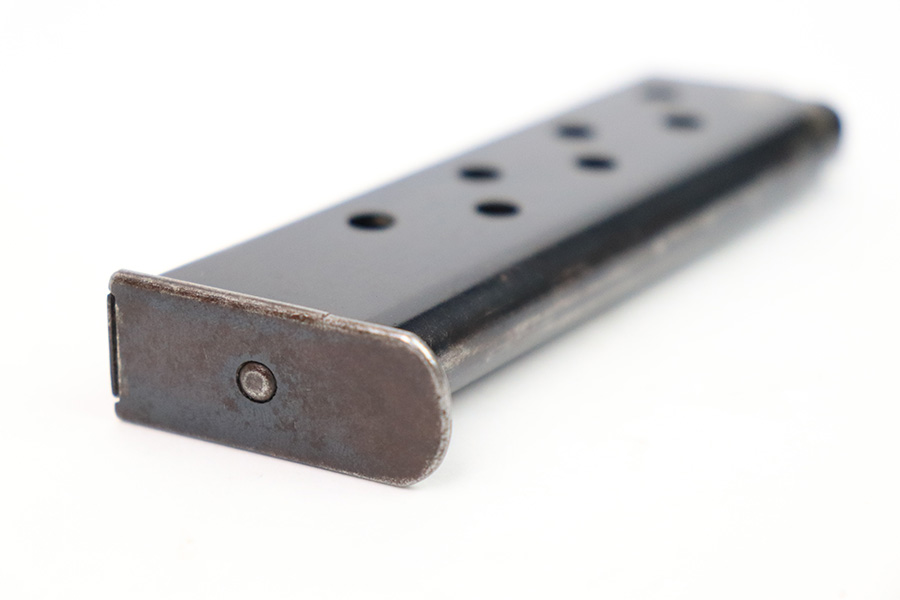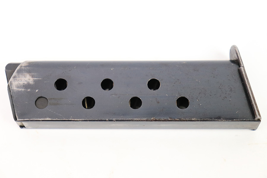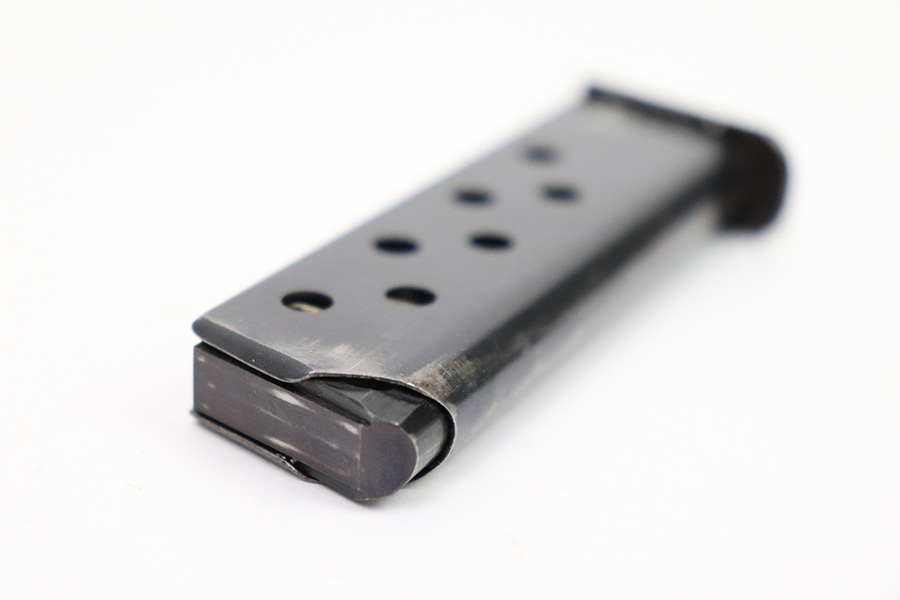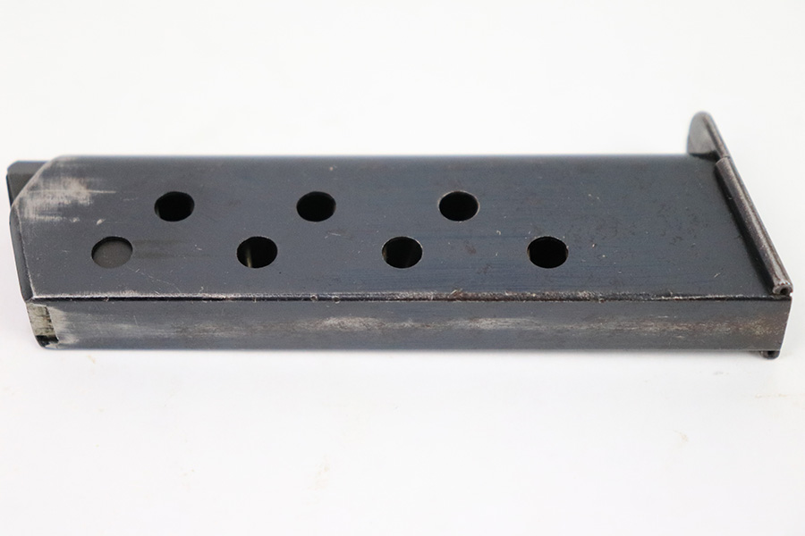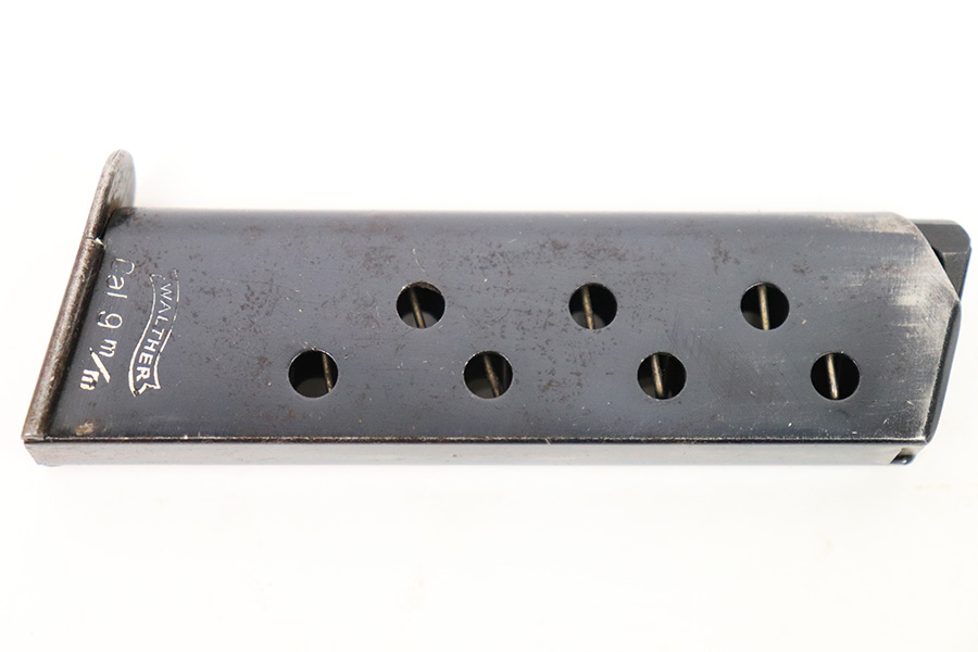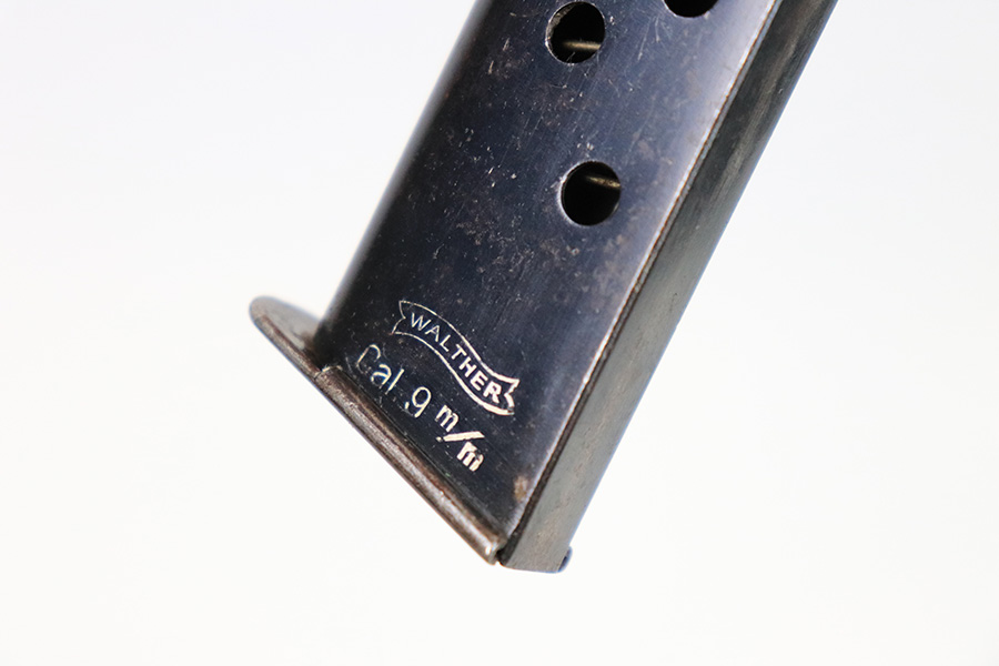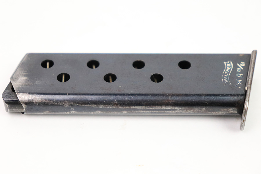 12/19/22 – This is an original early WW2 production 9mm Walther PP magazine. Rare variation with the “step” feature on the sides of the follower. This is an early feature and doesn’t affect functionality. The magazine has high polish finish and is in excellent overall condition. There’s some mild thinning and surface patina but no rust or pitting. Maker and caliber stamped on one side of the tube. The spring is strong and fully functional.