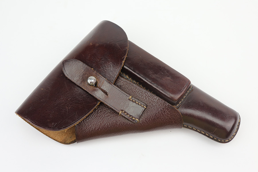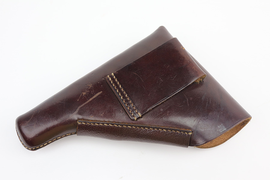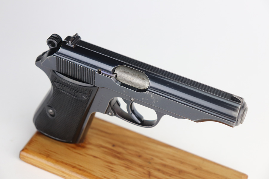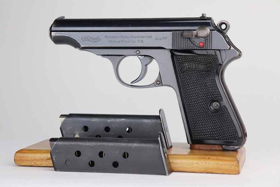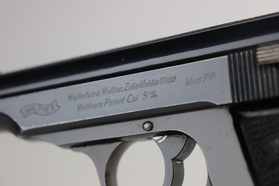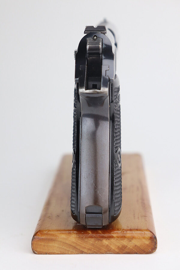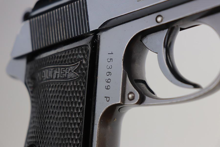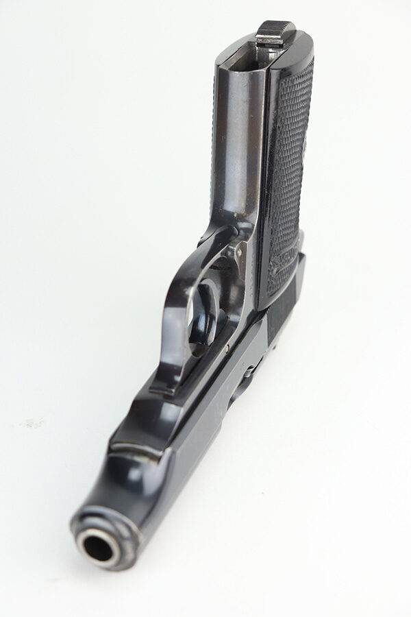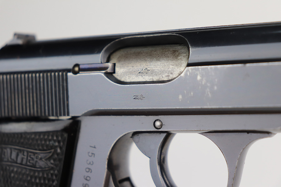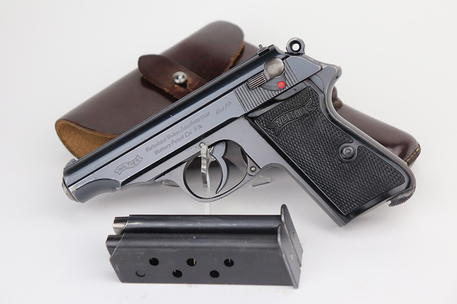 8/4/21 – This is a very nice example of a scarce 9mm Walther PP Rig sold in the commercial market in 1939-40. It is all matching and has “Crown N” proofs. It comes with two period-correct flat-bottom 9mm magazines and a near-mint Akah holster. The gun has retained about 93% of its bluing. Generally, there is minor high edge wear on the slide and around the muzzle. Some minor spotty wear on the right side of slide. Brown patina and minor pin-pricking on the straps. A few very light scratches on the top of the slide. Comes with excellent grips. The bore is shiny with great rifling but there is a noticeable bulge in the barrel.