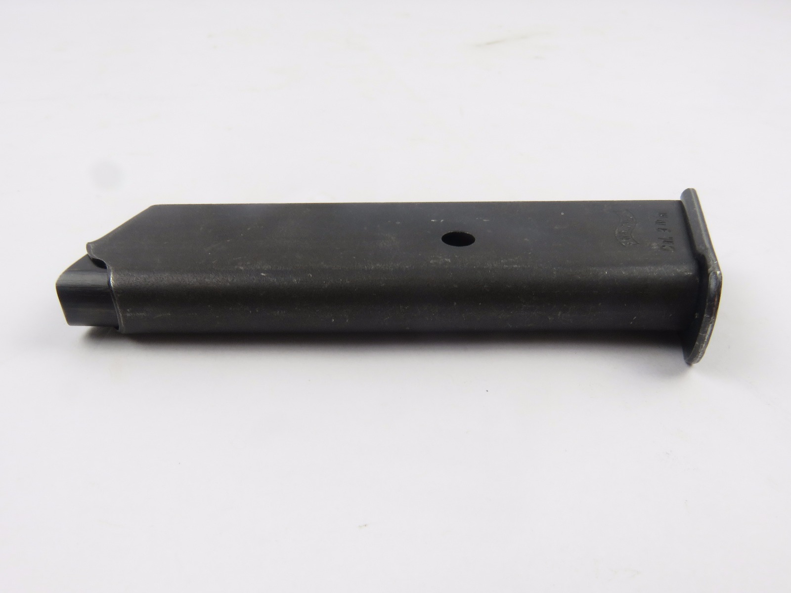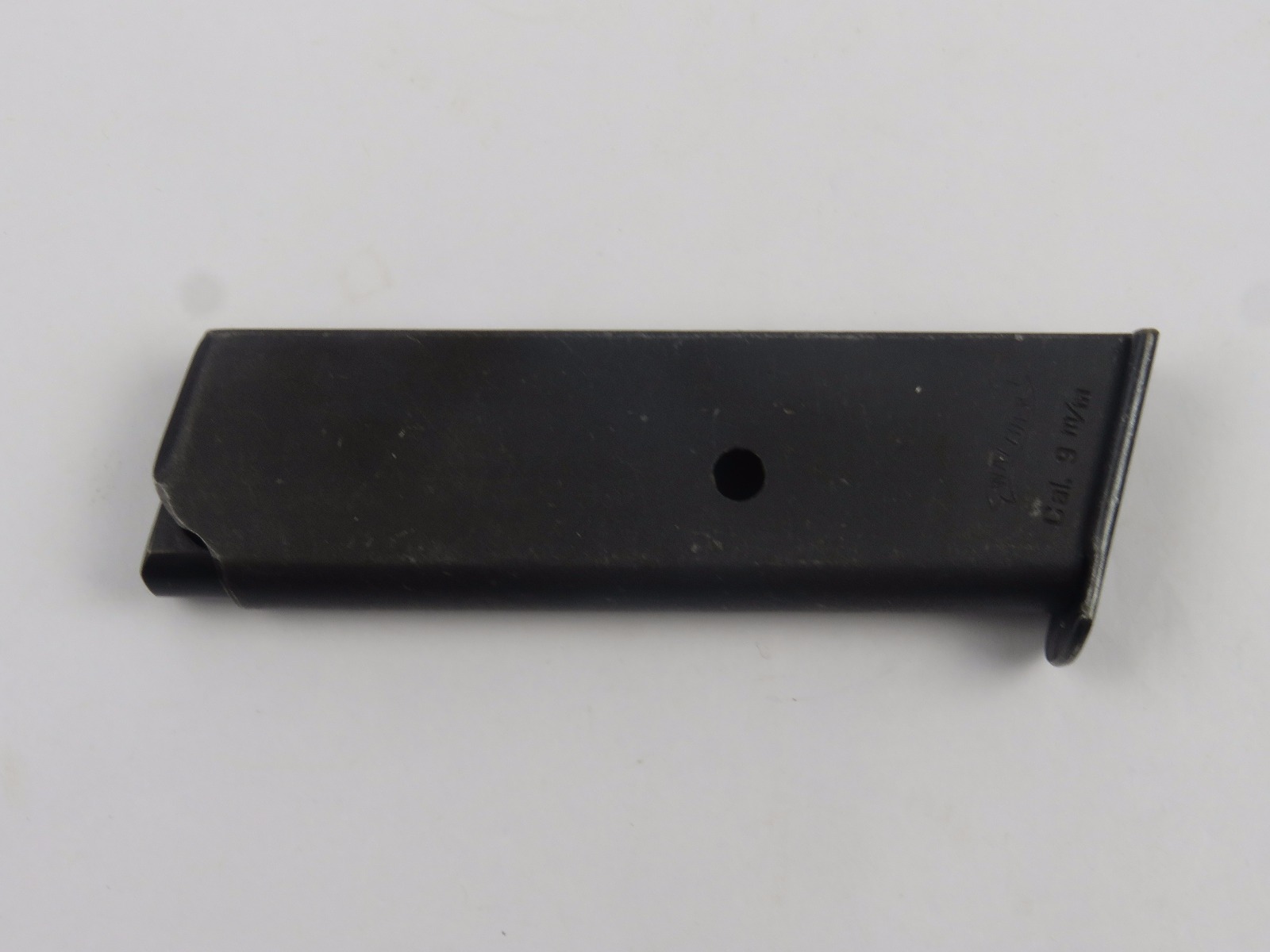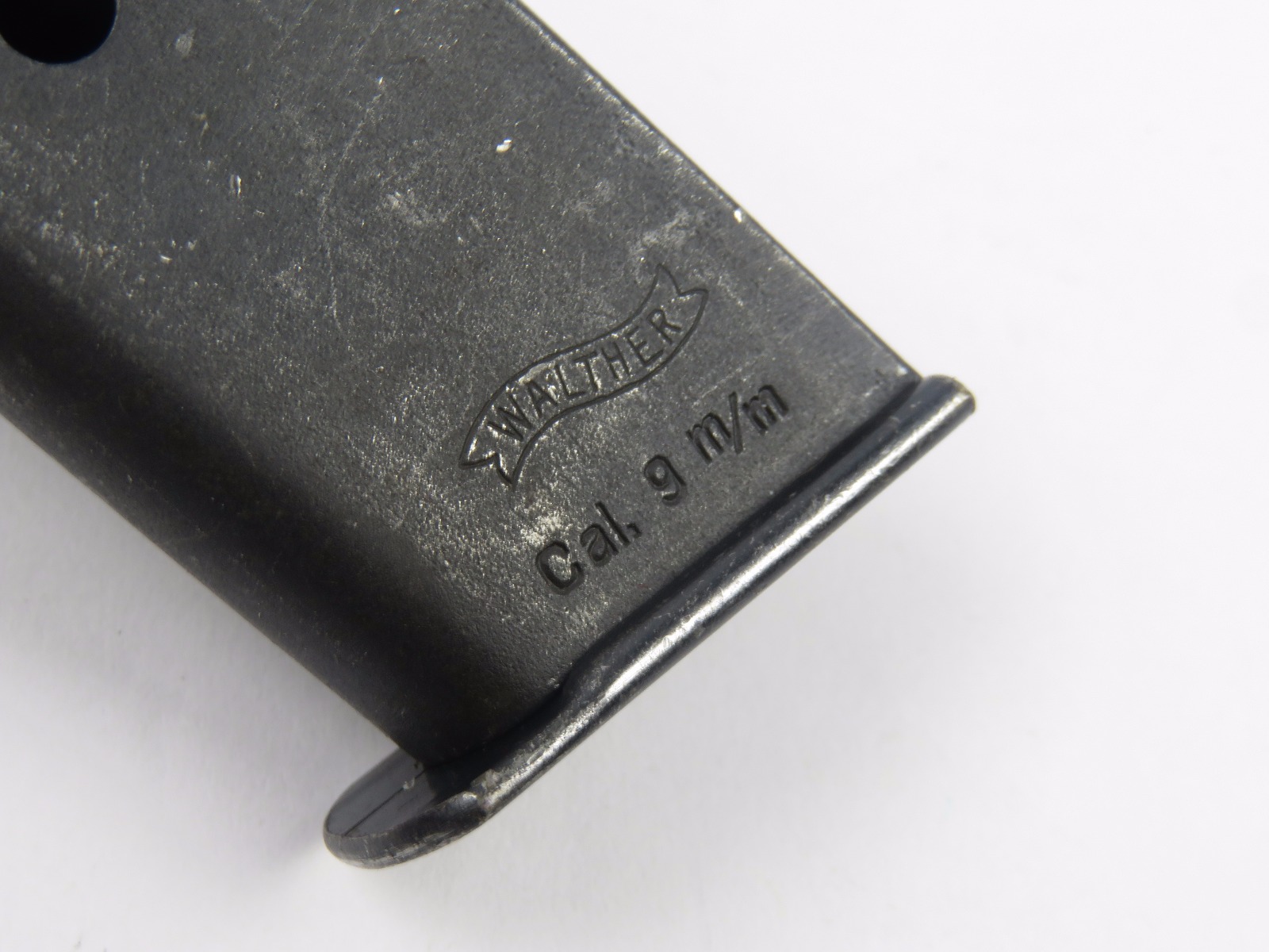 10/26/17 – This is an original WW2 wartime production Walther PPK magazine in 9mm. The magazine is stamped on one side with a Walther banner and “Cal. 9m/m” underneath. The finish on the frame is a dull bluing, and overall the finish is excellent with no rust or pitting. The base is unmarked and original. The spring is strong and fully functional. Guaranteed all original!