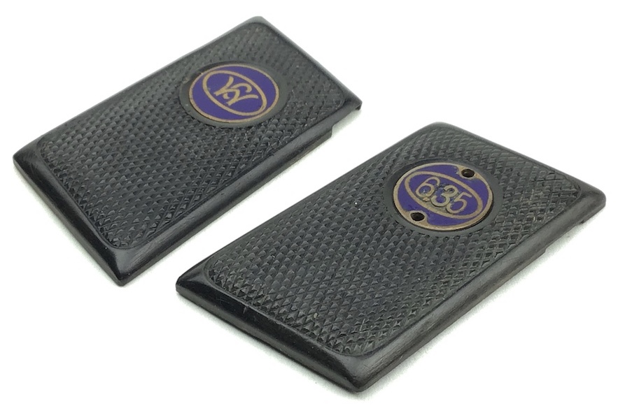 4/7/20 – Excellent and original pair of Walther Model 9 grip panels and attachment hardware. Grips have distinct checkering and no chips or cracks. Medallions are colorful and in excellent condition. Hard to upgrade.