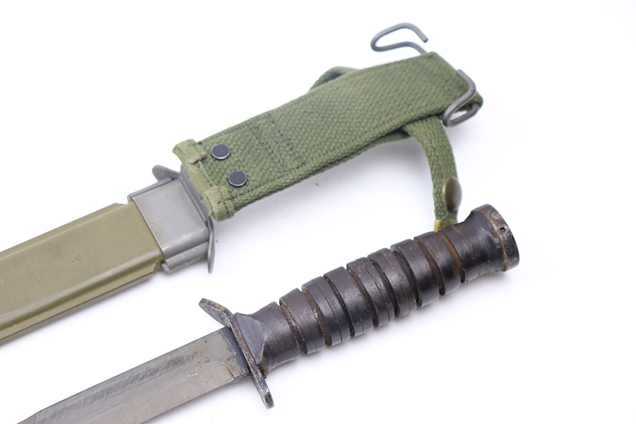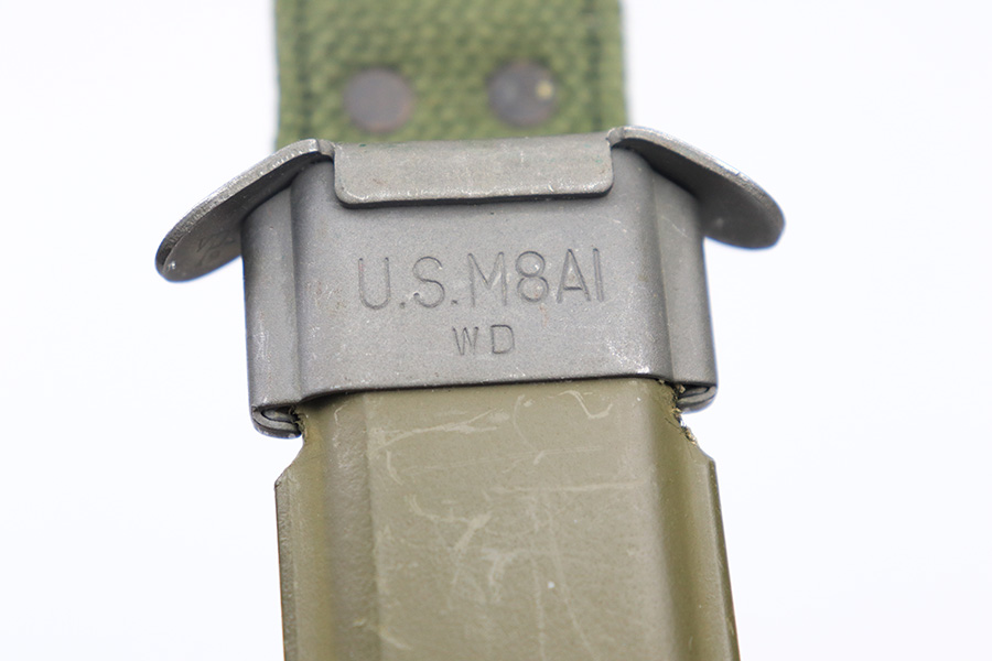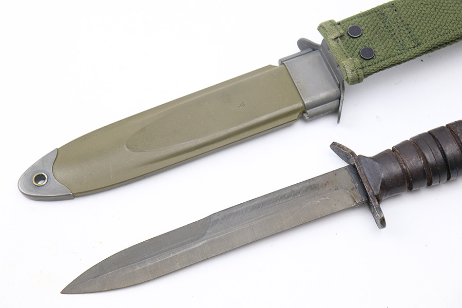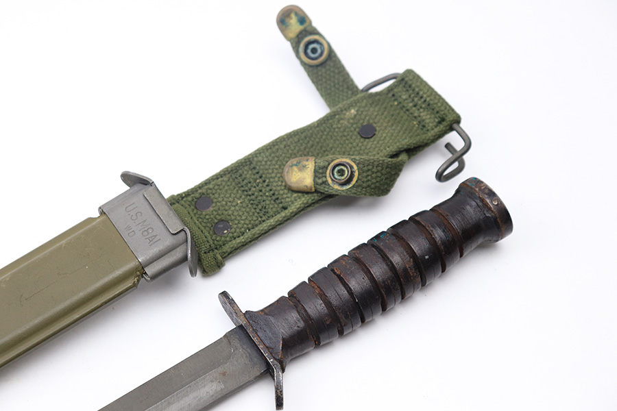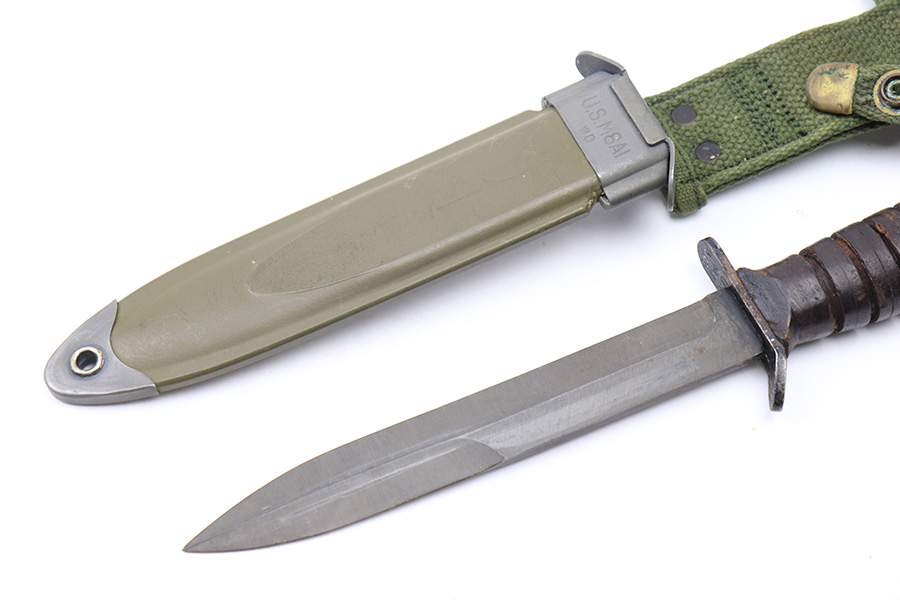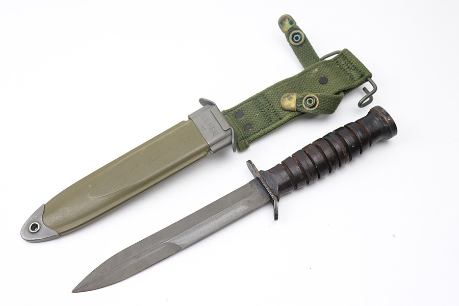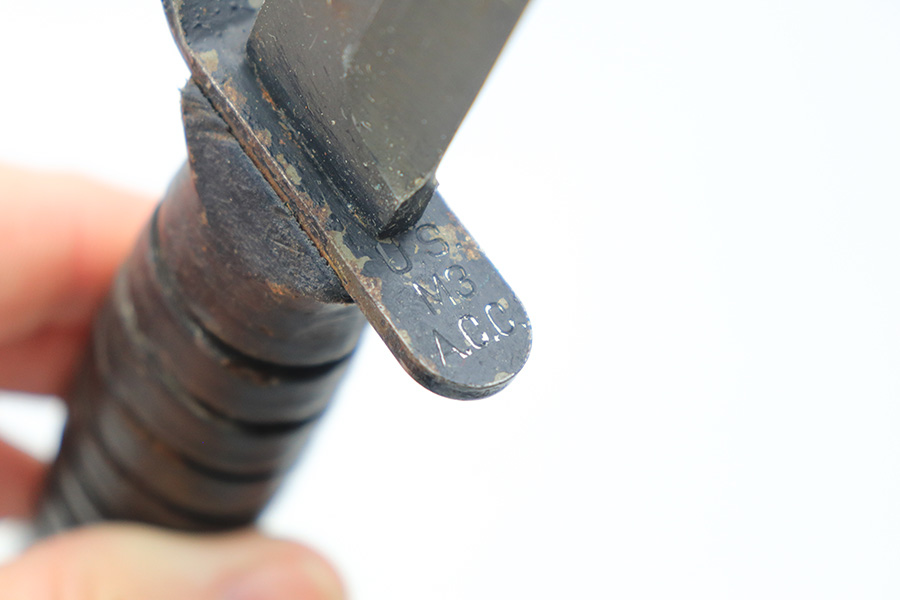 5/31/22 – This is an original US M3 Fighting knife by A.C.Co. The knife comes with a post WW2 production M8A1 scabbard. The blade is unmarked and in great overall condition with no notable discolorations or signs of sharpening. The hand guard is maker stamped and the pommel is ordnance proof stamped. The leather handle has no major issues and nice tight leather throughout. The scabbard is in excellent condition.