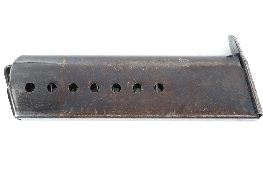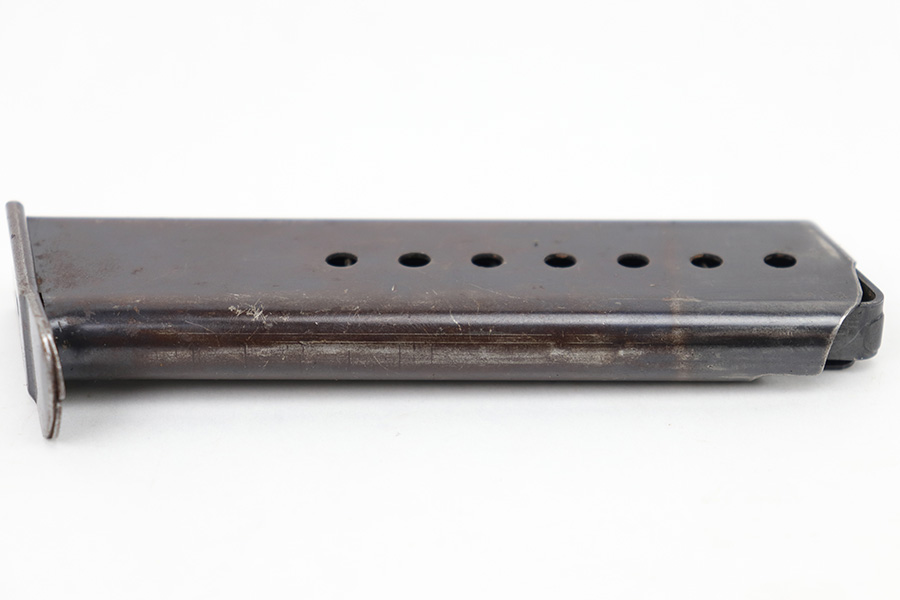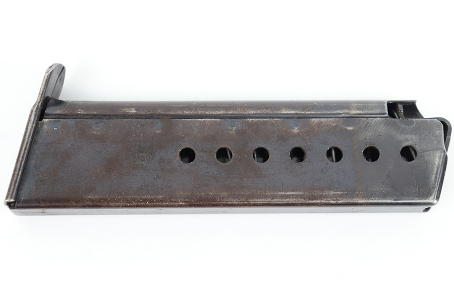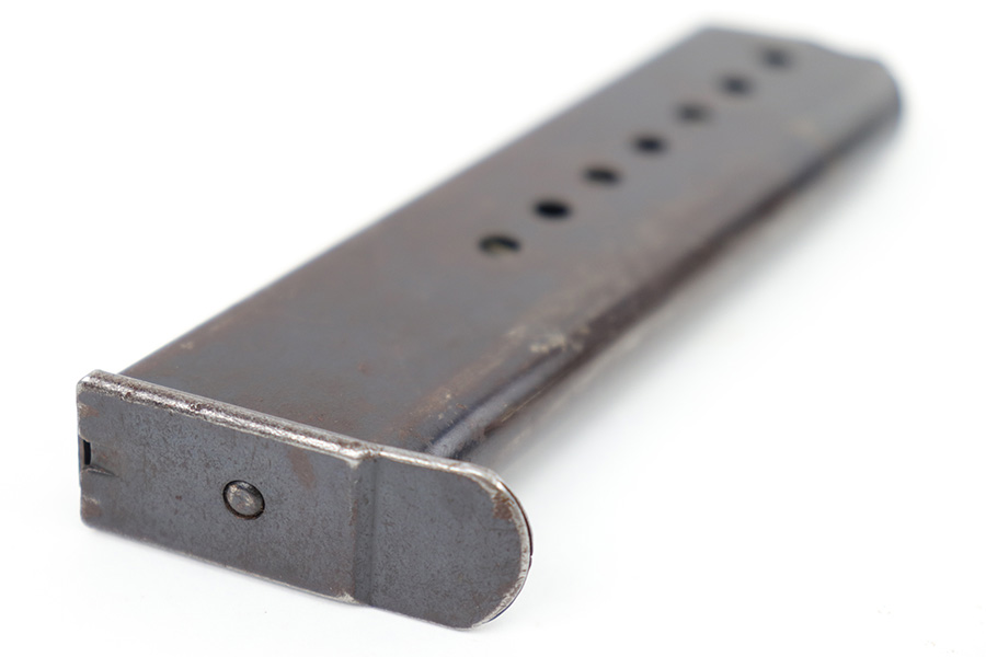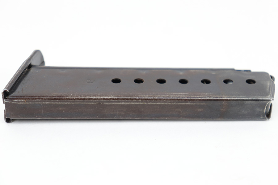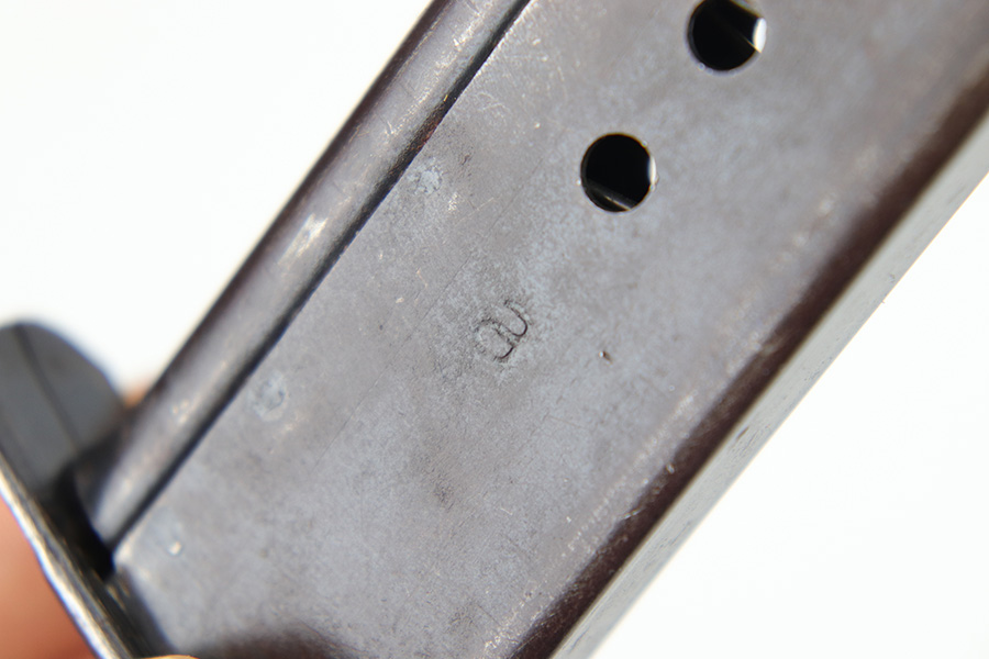 4/11/23 – This is an original, rare variation P.38 magazine for a Spreewerk (CYQ) P.38. The magazine is stamped on the tube with an “a” which we believe corresponds to the late-war production A-prefix CYQ pistols. The spine of the magazine is stamped with an eagle/88 military proof stamp. The magazine is in good condition with dark surface patina throughout the blued finish. Natural aging and patina but no rust or pitting. Strong, functional spring.