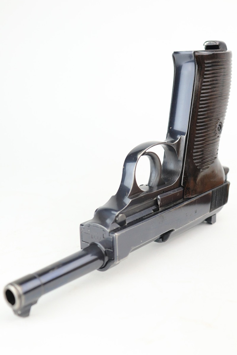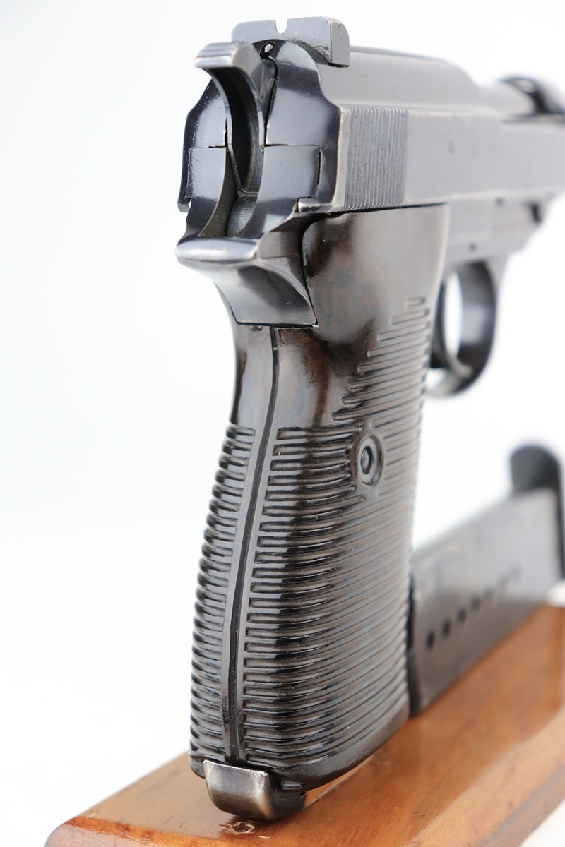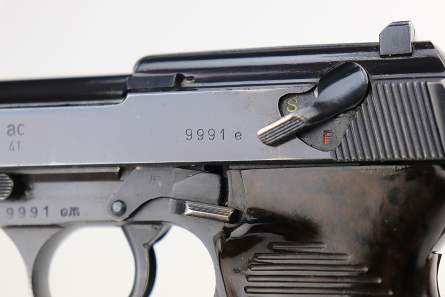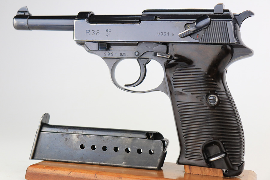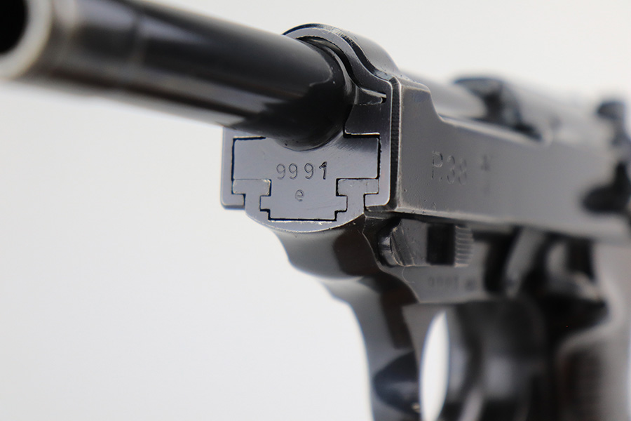 5/23/22 – This is an excellent example of an AC 41 Walther P.38 issued to the Nazi military in 1941. It is all matching and has the proper “Eagle 359” military acceptance proofs throughout, even on the small parts. This is a second-variation example characterized by its high polish finish and no “ac” on the trigger guard. It has retained about 94-95% of its original bluing. There is minor wear concentrated around the high edges of the slide and around the muzzle. A small spot of wear and some tiny pits on the left side of the slide next to the safety lever. Comes with excellent bakelite grips (waffen-proofed but not numbered) and a proper magazine that is numbered but not matching to the gun. Excellent, shiny bore. De-cocker is functional.