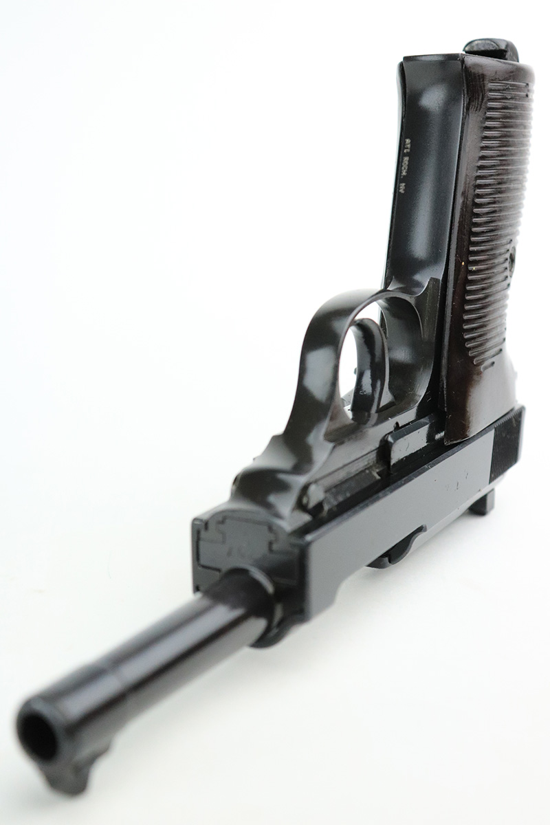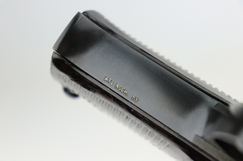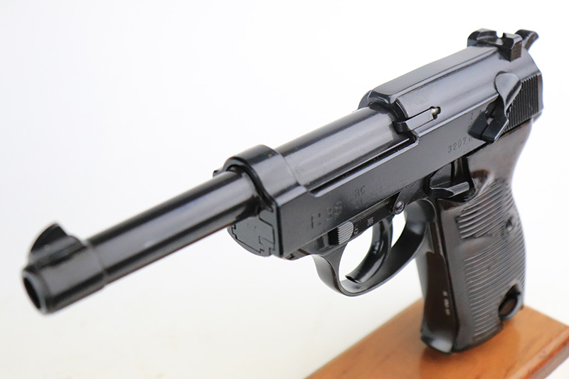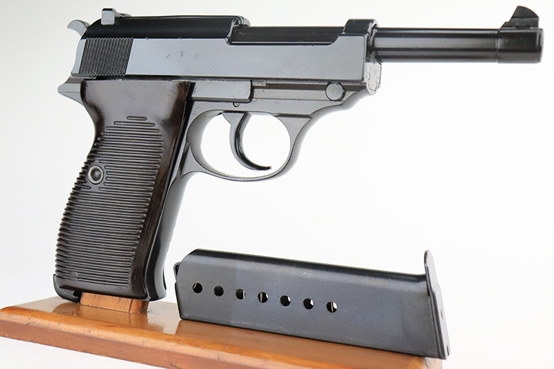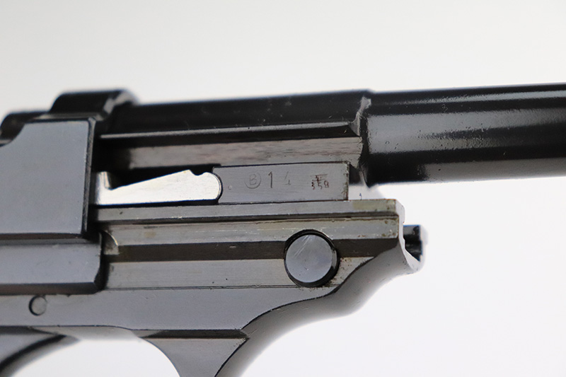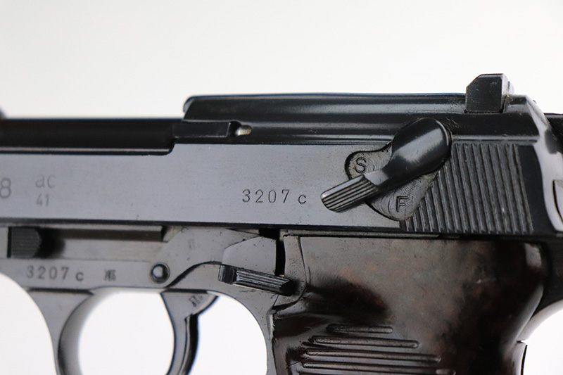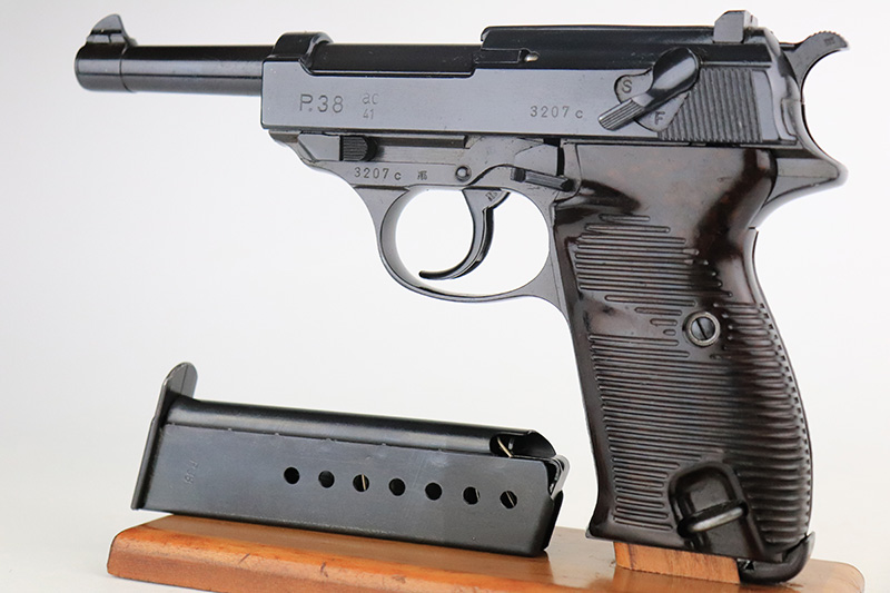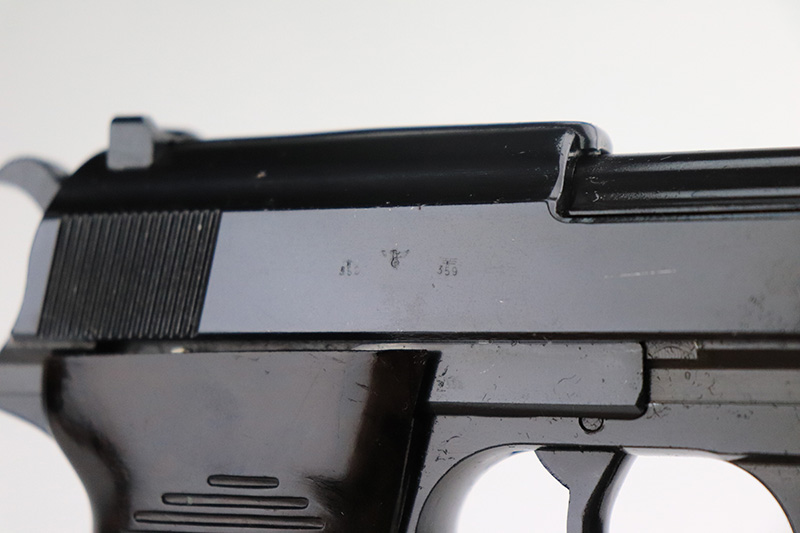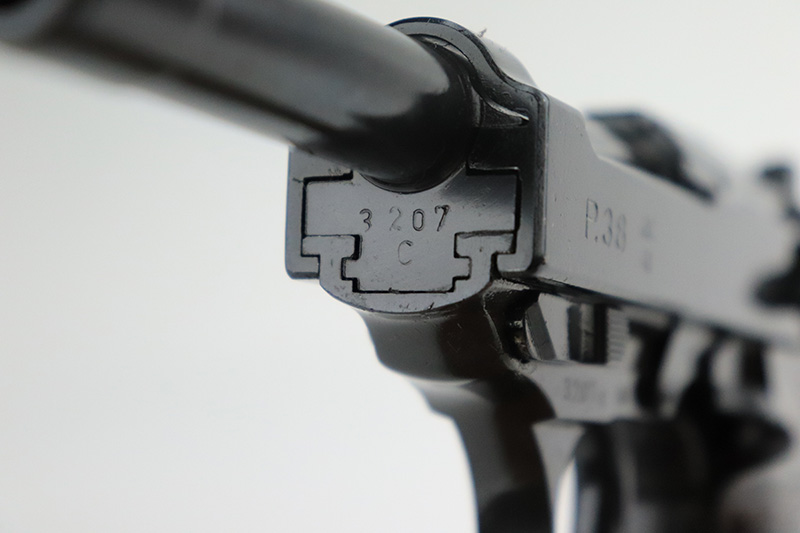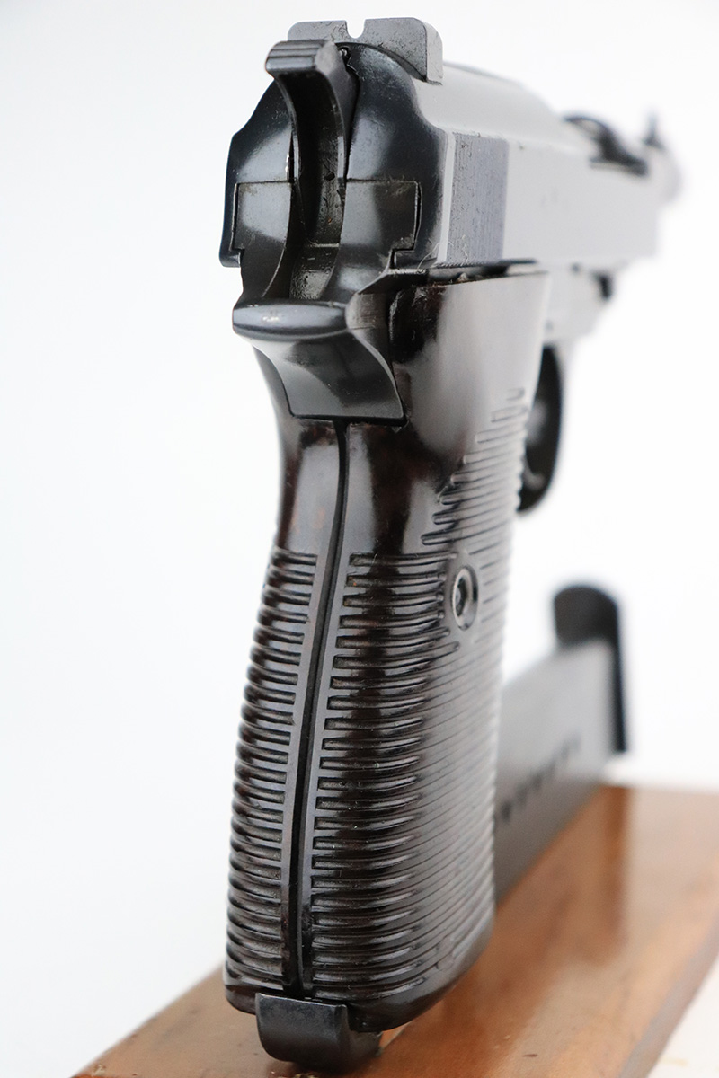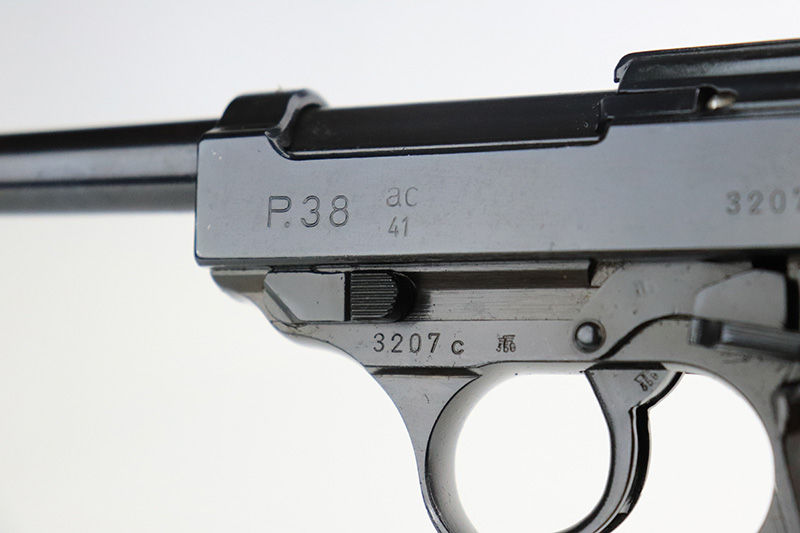 8/26/22 – This is an excellent example of an AC 41 Walther P.38 issued to the Nazi military in 1941. The gun is all matching and has the proper “Eagle 359” military proofs throughout. The entire gun has dark finish and has been “Russian dipped”. Import mark on the front strap. There is virtually no actual finish loss, but there are a couple of tiny scratches on the right side of the slide and some areas of pin-pricking visible under the finish here and there. Comes with excellent Walther grips that are “Eagle 359” proofed but not numbered. Also comes with an un-numbered Walther magazine. The bore has decent rifling, but there is minor pitting throughout. De-cocker is not functional.