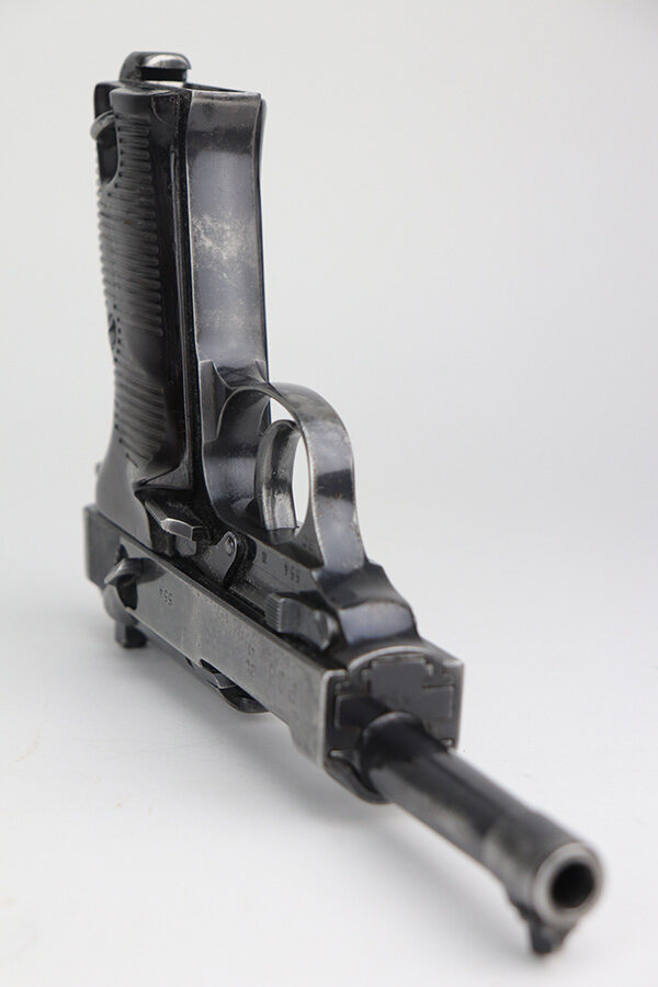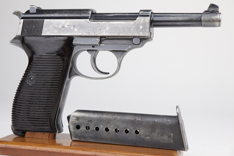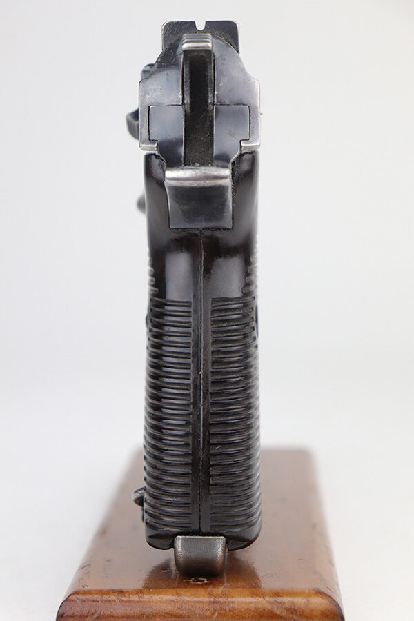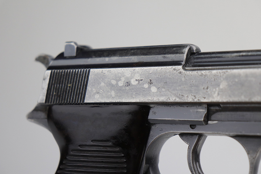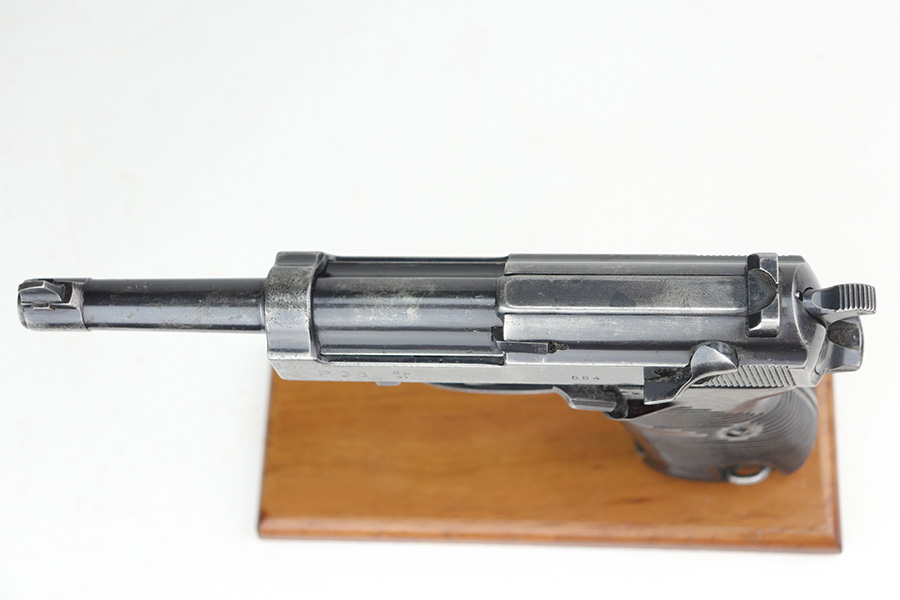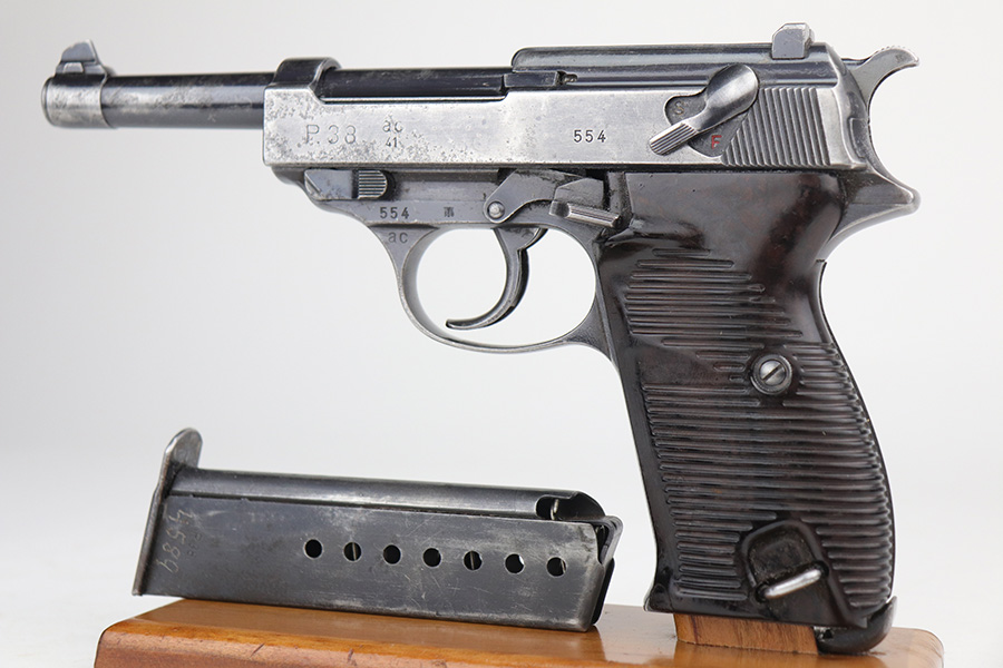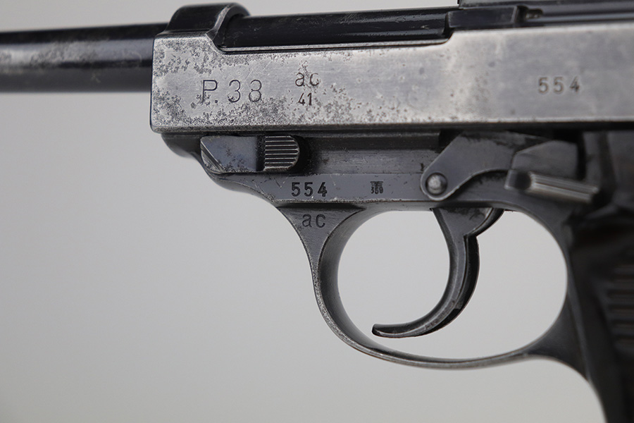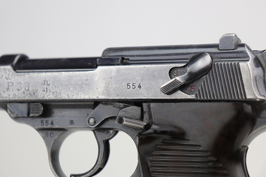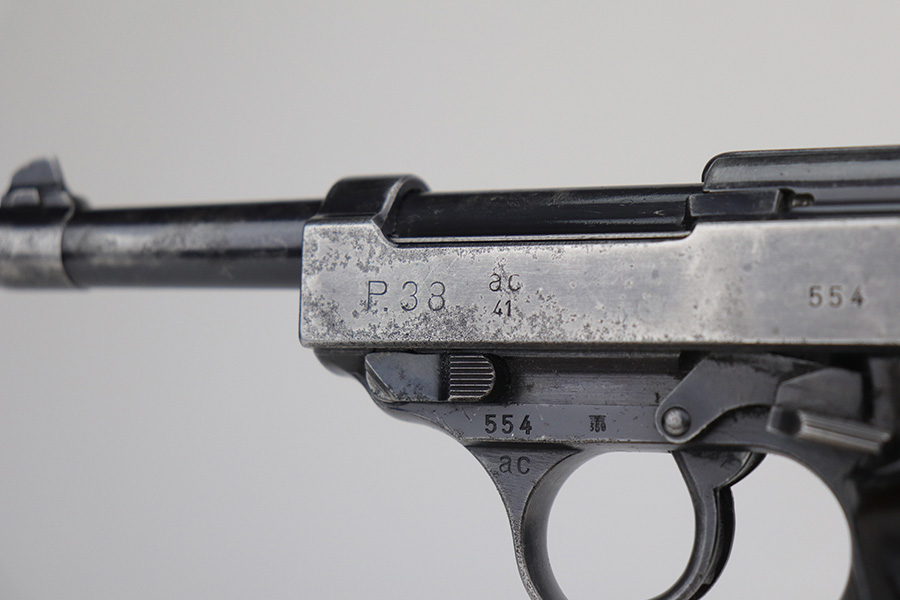 11/5/21 – This is a nice example of an AC 41 Walther P.38 issued to the Nazi military in 1941. This is a first variation AC 41 and has an early serial number, “ac” on the trigger guard. The gun is all matching and has the proper “Eagle 359” Nazi military acceptance proofs throughout, even on the small parts. The gun has retained roughly half of its original high polish finish. There is spotty scratchy wear throughout, but most of the finish loss is on both sides of the slide. There are areas of minor pitting on both sides of the slide, the barrel, and on the underside of the frame. It comes with very nice matching-numbered waffen-proofed grips – there is a small chip in the bottom left corner of the left grip panel. It comes with an early Walther magazine that is not factory-numbered but does have post-war electro-pencil numbering on the left side of the tube. The rifling in the bore is a bit worn with minor pitting throughout. The de-cocker is not functional.