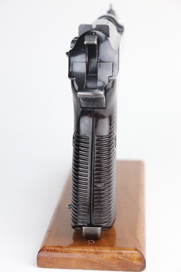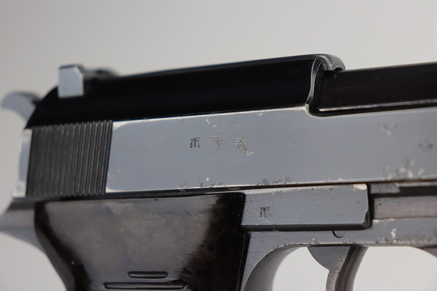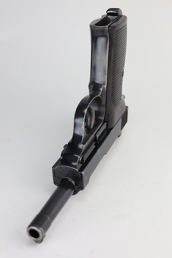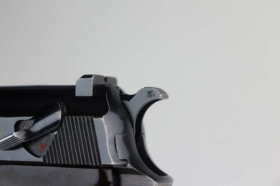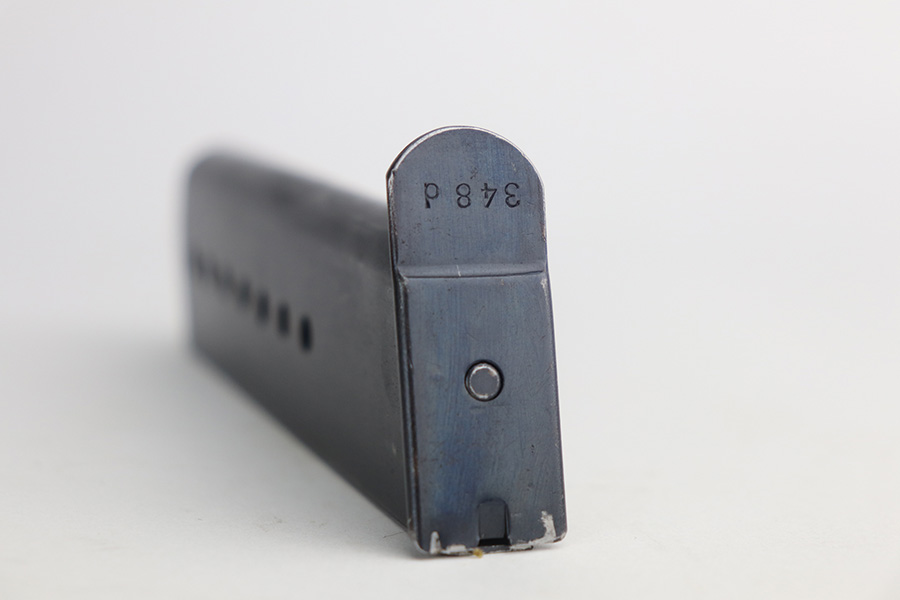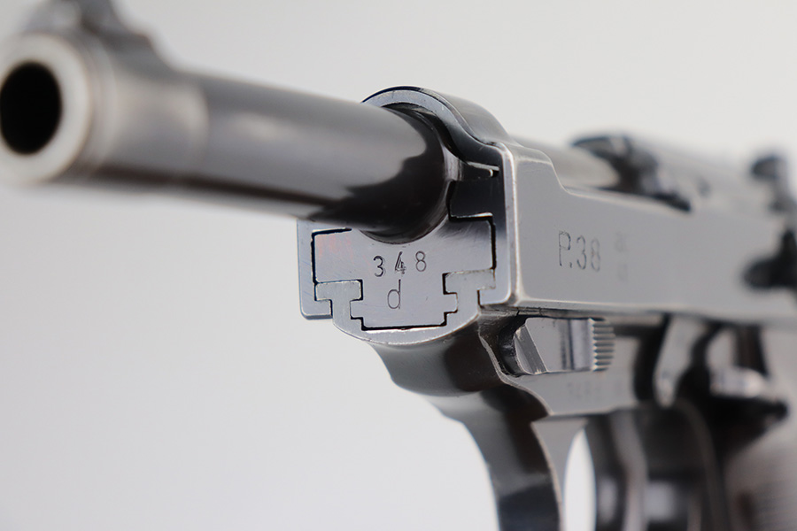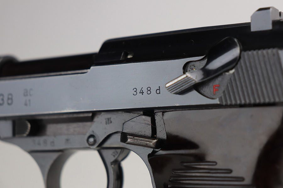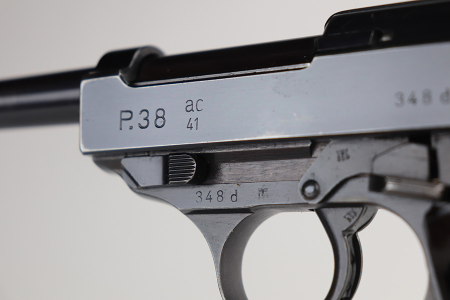 8/2/21 – This is a nice example of a Walther P.38 issued to the Nazi military in 1941. It is all matching and has the proper “Eagle 359” military proofs throughout, even on the small parts. It also comes with one original matching magazine. It has retained roughly 85% of its original high polish finish. Most of the finish loss is on the front strap, but there is also wear on the high edges of the slide, the barrel, and around the muzzle. Areas of splotchy discoloration and minor pitting on the right side of the slide. Comes with excellent waffen-proofed grips. The bore has good rifling with spotty freckling throughout. De-cocker is functional.