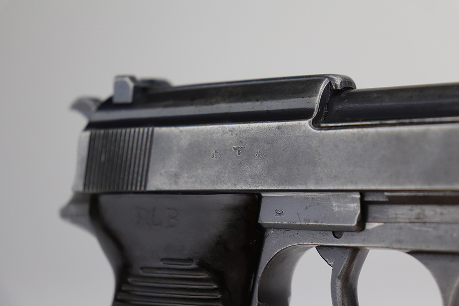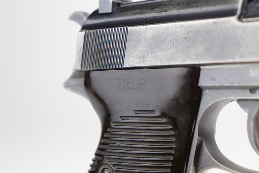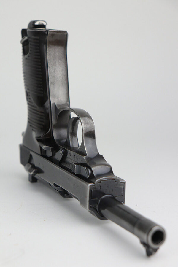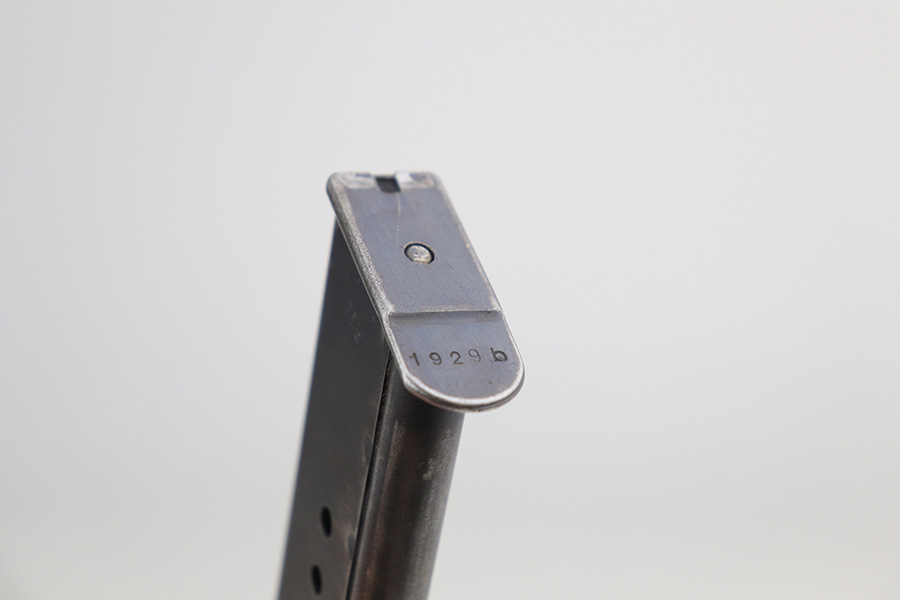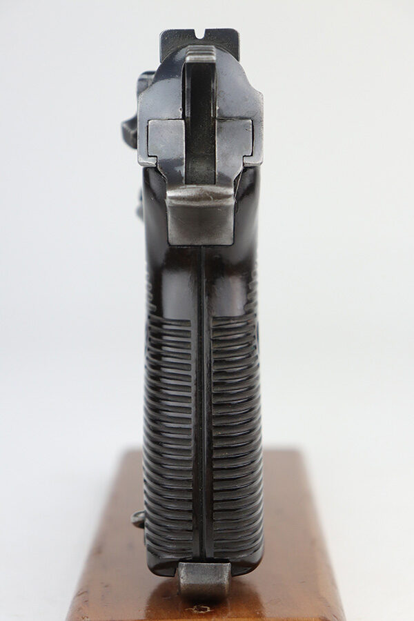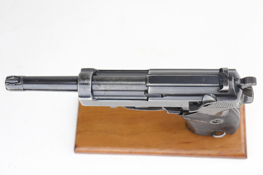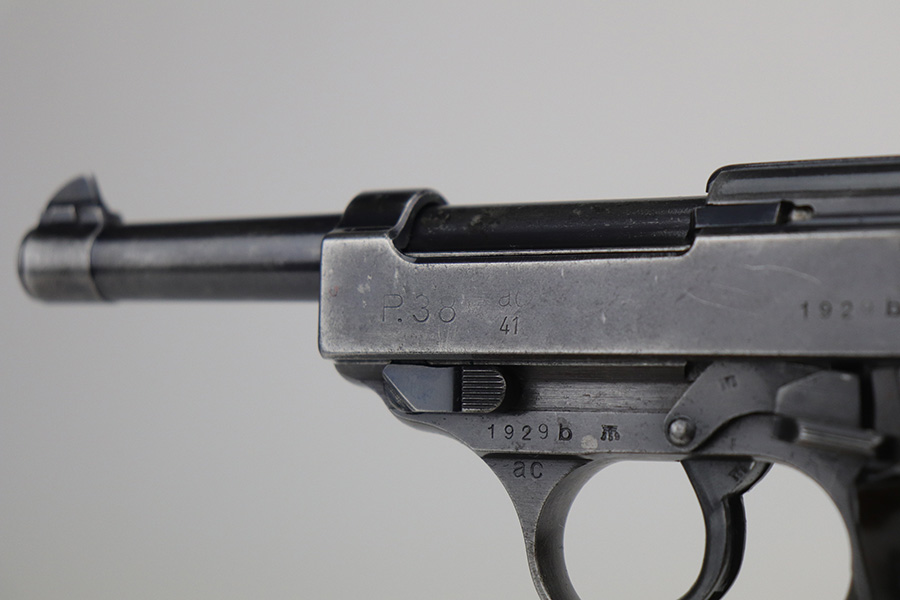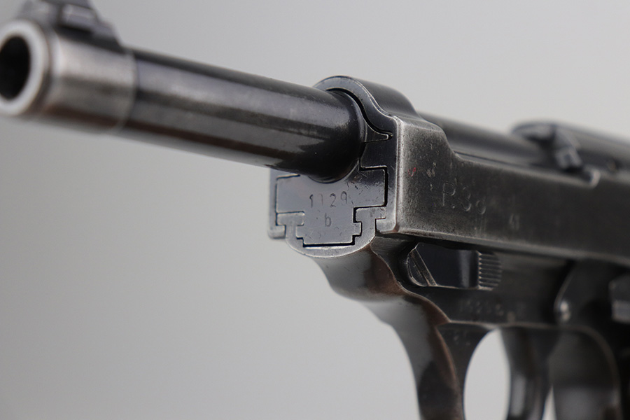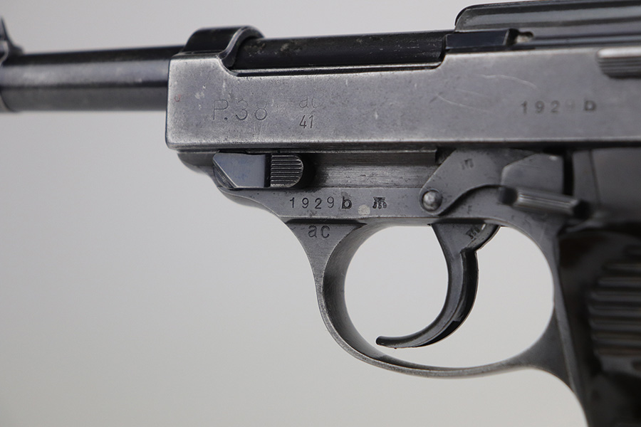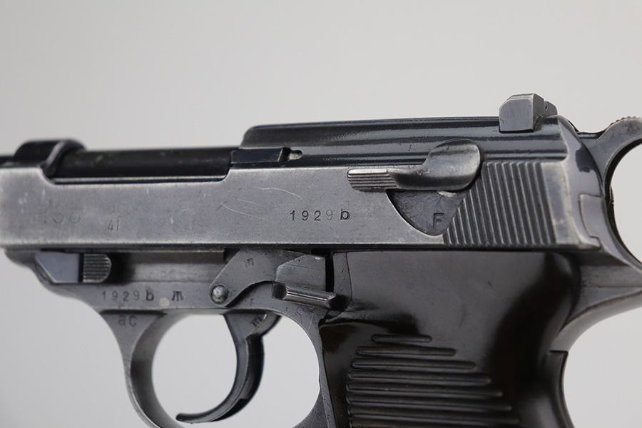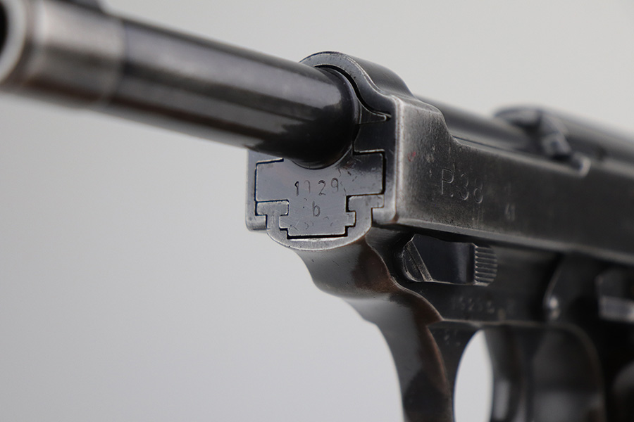 11/5/21 – This is a nice example of an AC 41 Walther P.38 issued to the Nazi military in 1941. It is a first-variation example, characterized by the “ac” Walther factory code on the trigger guard. It is all matching and has the proper “Eagle 359” Nazi military acceptance proofs throughout, even on the small parts. This one also comes with one original matching-numbered magazine. It has retained roughly 50-60% of its original high polish finish. Most of the finish loss is on the front grip strap and underside of the trigger guard (where there is also some spotty oxidation), but there is thinning and spotty, scratchy wear throughout. The wear is most noticeable on both sides of the slide and on the barrel. There is spotty oxidation on top of the barrel through the ejection port, top of the slide, and right side of the slide. Areas of minor pitting along the right side of the slide, left side of the barrel, and around the front edge of the left side of the slide. Comes with excellent Waffen-proofed un-numbered grips. The rifling in the bore is a bit worn with pitting throughout. De-cocker is functional.