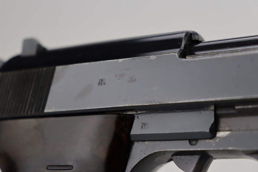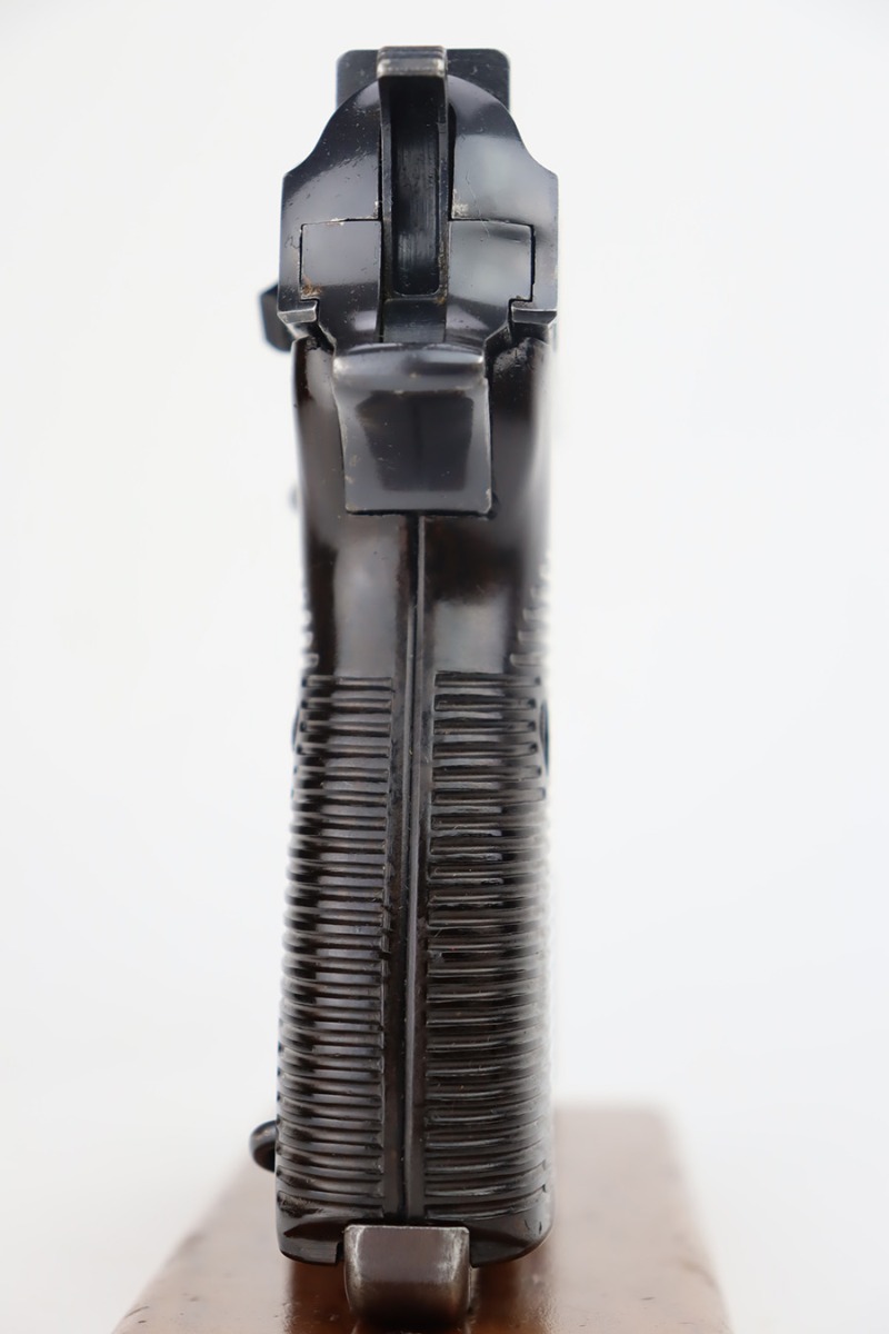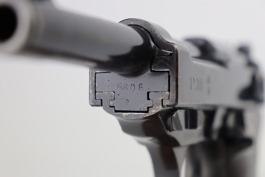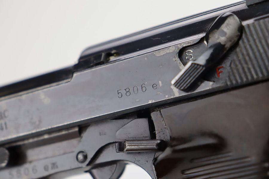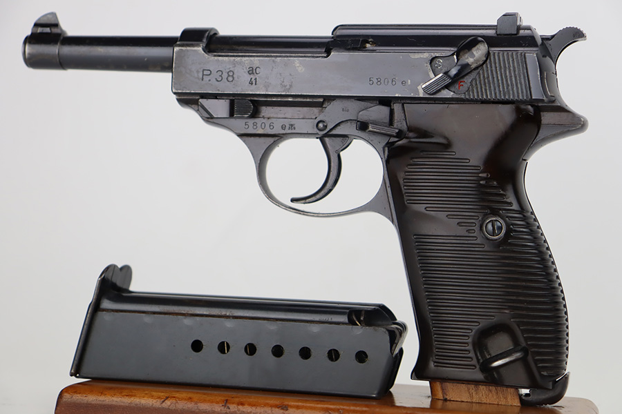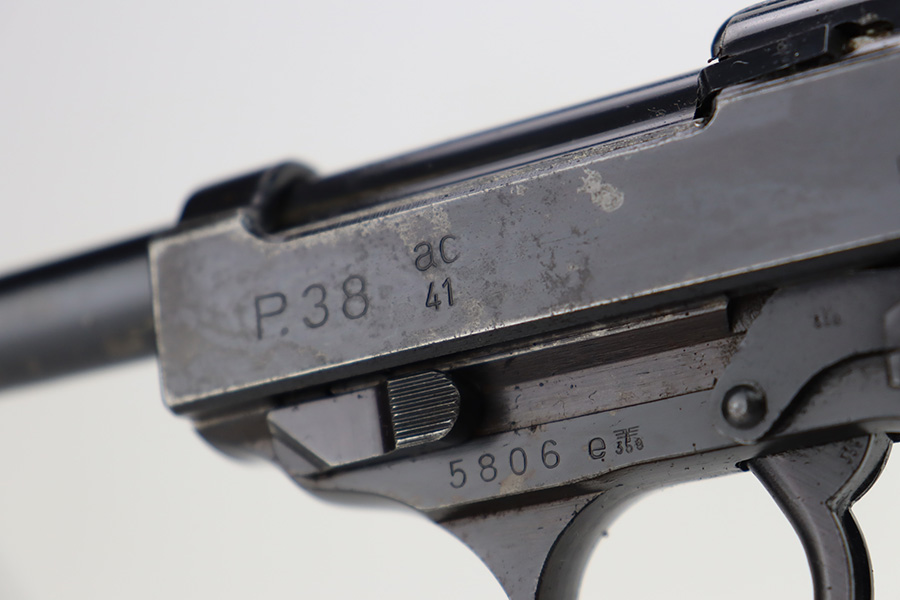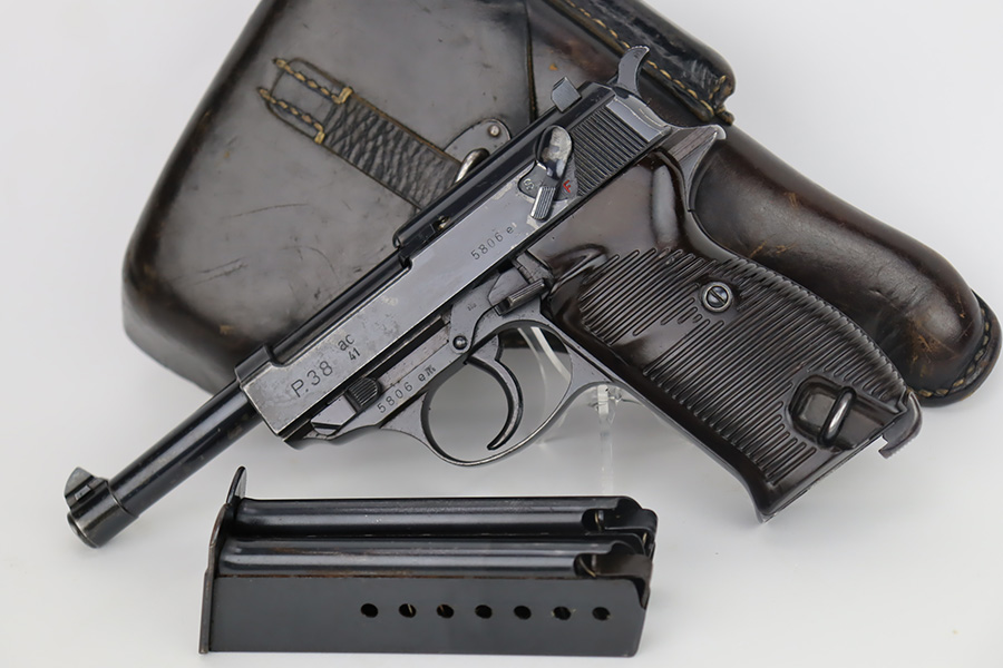 9/26/23 – This is a nice AC 41 Walther P.38 issued to the Nazi military in 1941. All matching with the proper “Eagle 359” military proofs throughout. This is a 2nd variation example with no “ac” on the trigger guard. Comes as a rig with a very nice 1942-dated holster and two “Eagle 359” marked magazines. The bluing on the gun rates roughly 85%. The most obvious sign of wear is splotchy discoloration on the slide and barrel. An area of minor wear on the top plate. Fitted with excellent “Eagle 359” proofed grips. Excellent bore. De-cocker is functional.