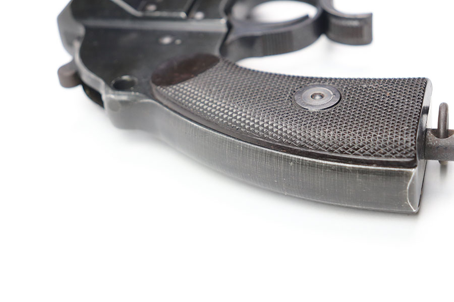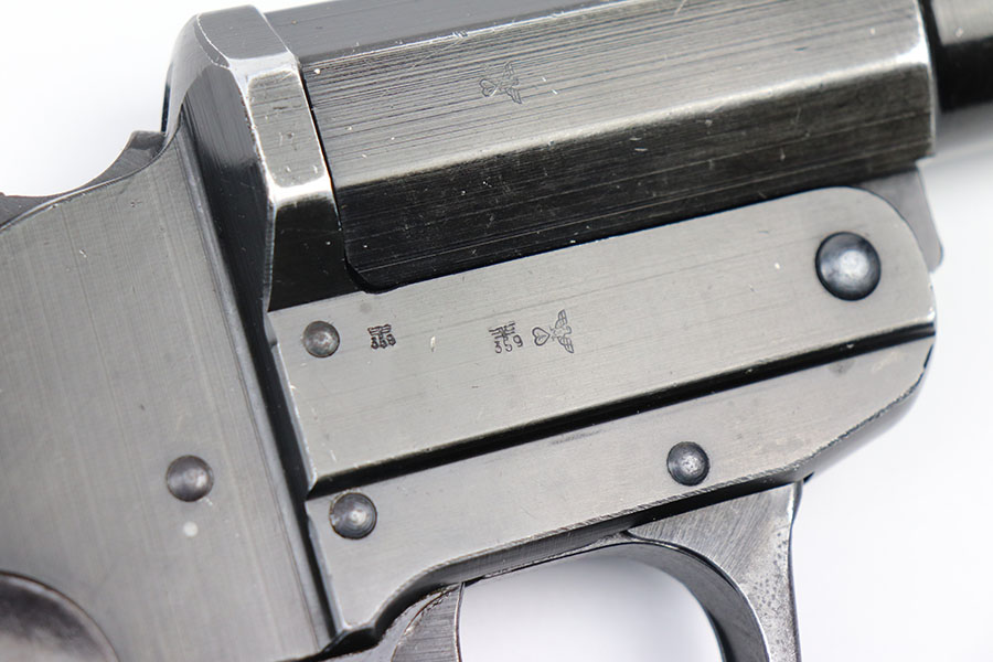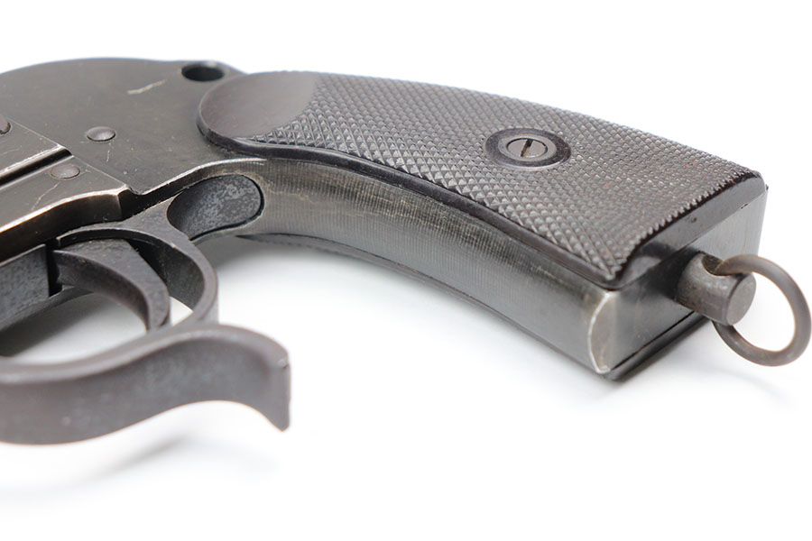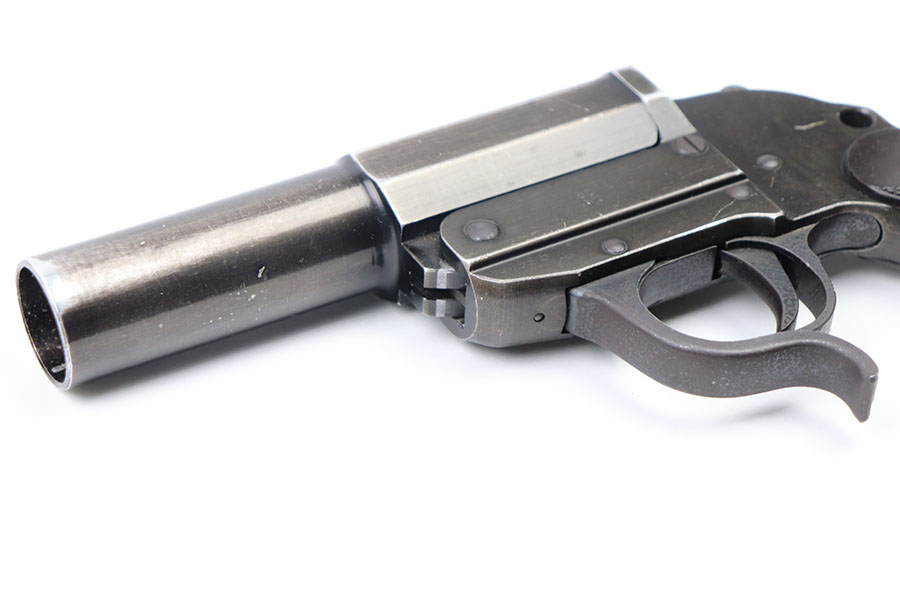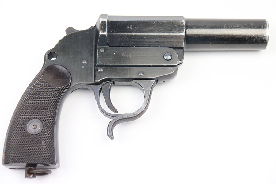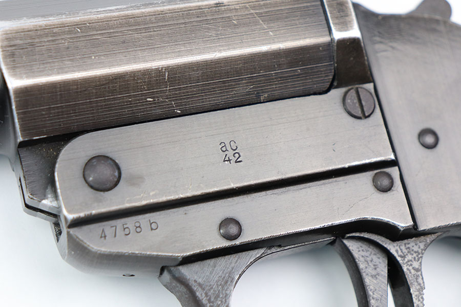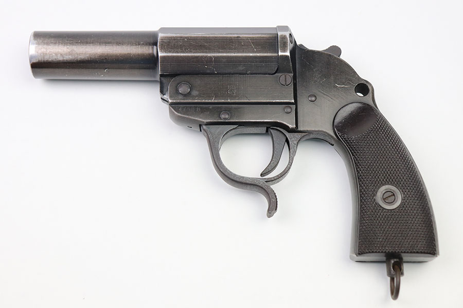 4/22/21 – This is a 1942 production Walther flare pistol. The single barrel has a clean bore and is fully functional. The finish is thinning on the front and back straps, and there’s some typical muzzle wear and finish loss along the edges. All correct and original with eagle 359 military proof stamps.