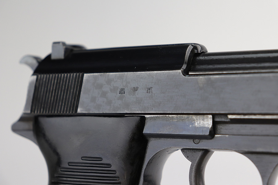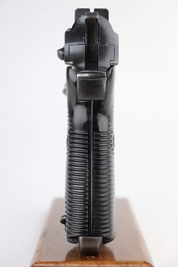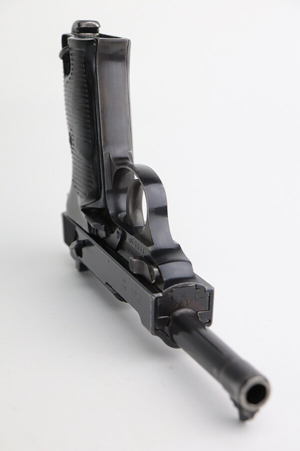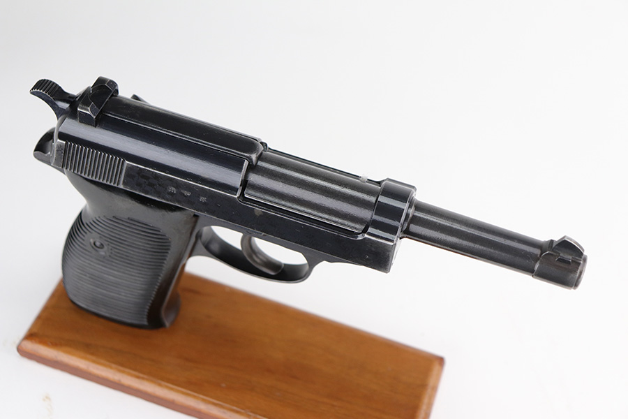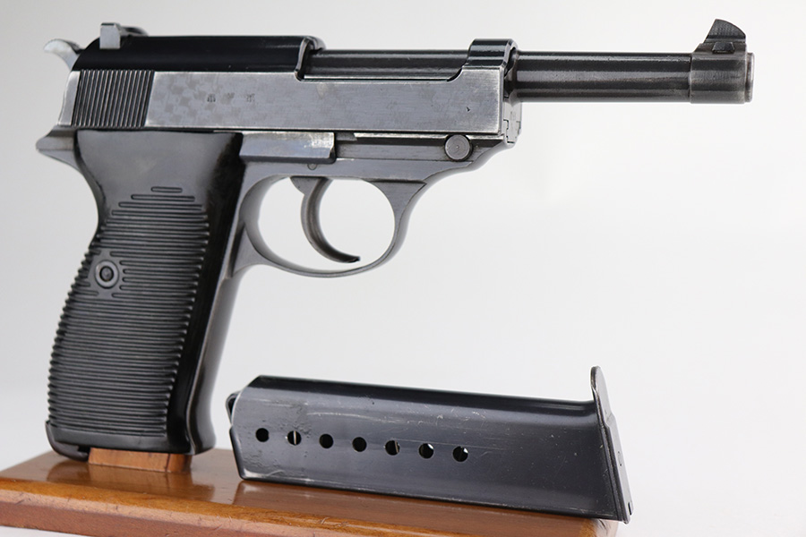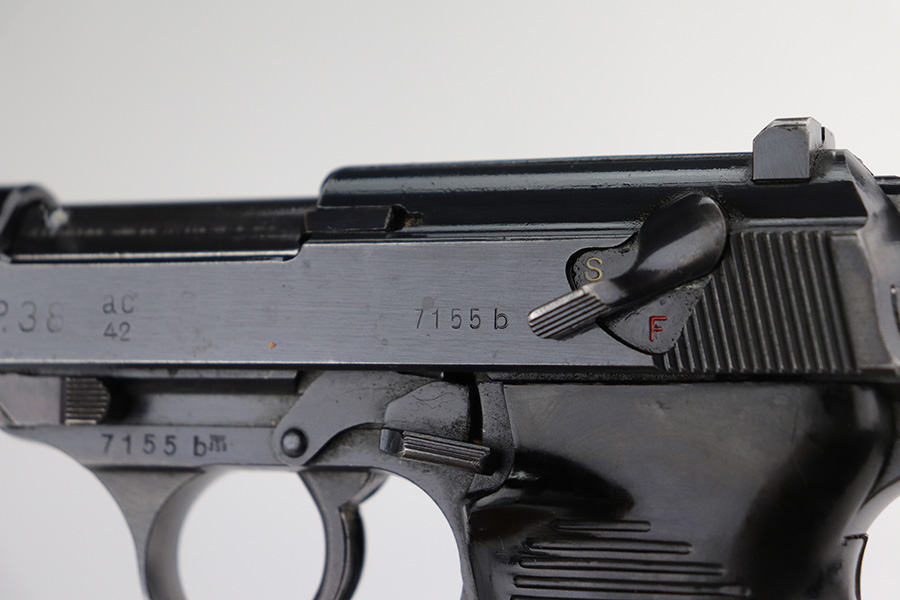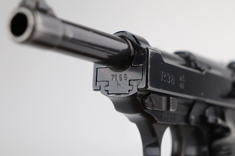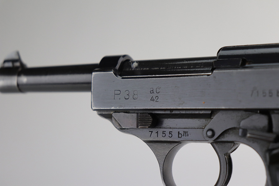 9/17/21 – This is a nice example of Walther P.38 issued to the Nazi military in 1942. It is all matching and has the proper “Eagle 359” military proofs throughout, even on the small parts. It has retained about 90% of its original finish. There is thinning on the front strap and on the barrel and minor wear on the high edges and around the muzzle. A couple of spots of wear on the right side of the slide and on the barrel. There is a series of dark squares of discoloration on the right side of the slide, almost in a grid pattern. Comes with excellent grips and a period-correct Walther magazine. The bore has good rifling with pin-pricking throughout. De-cocker is functional.
