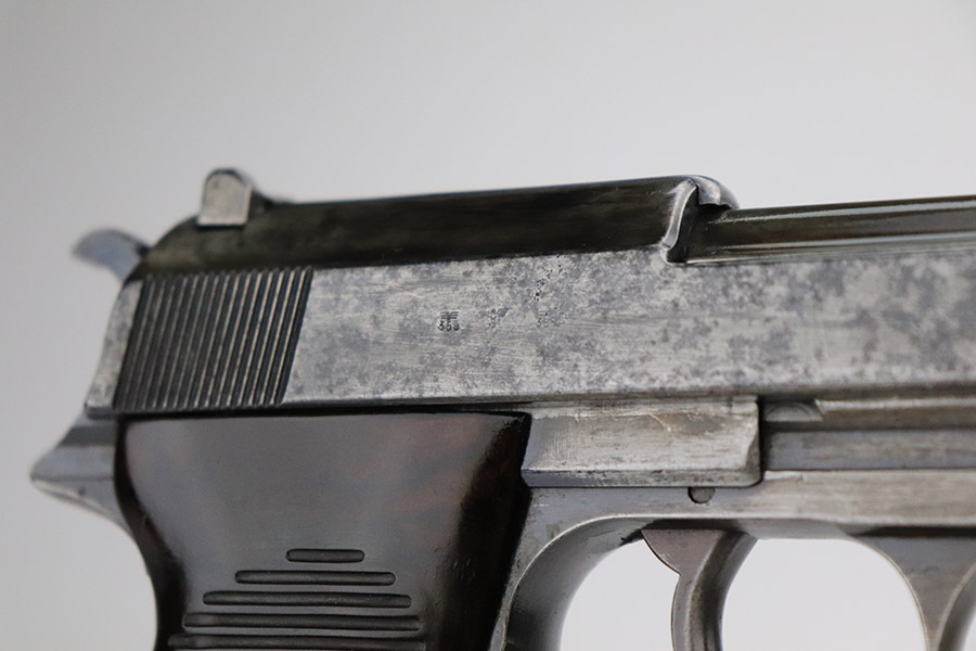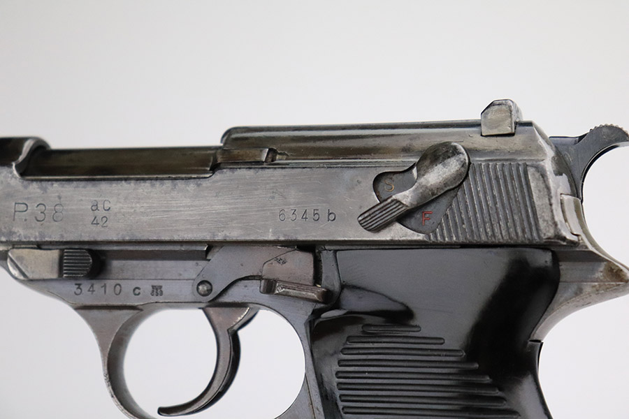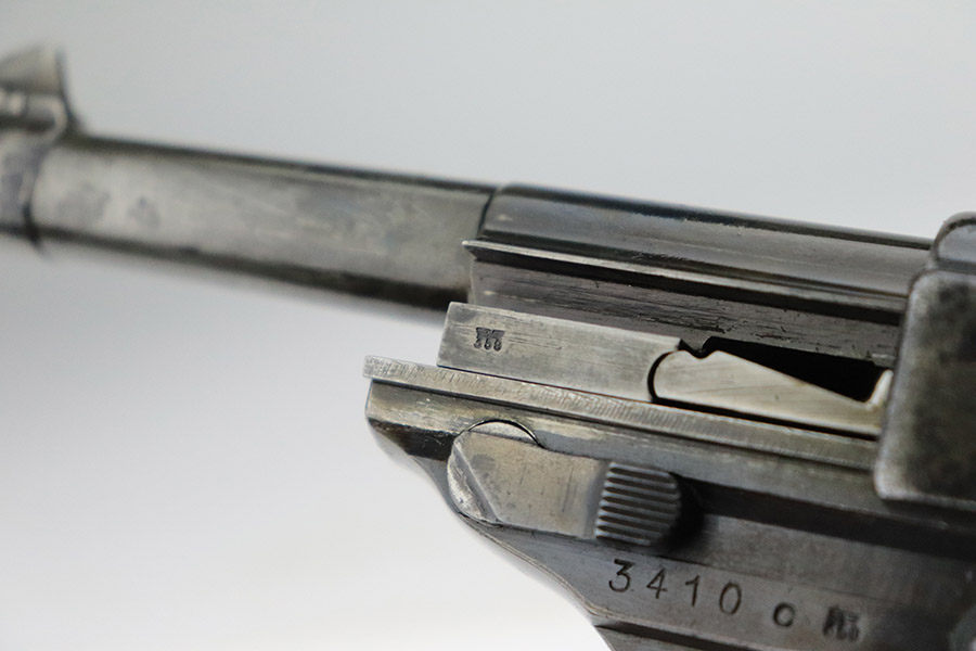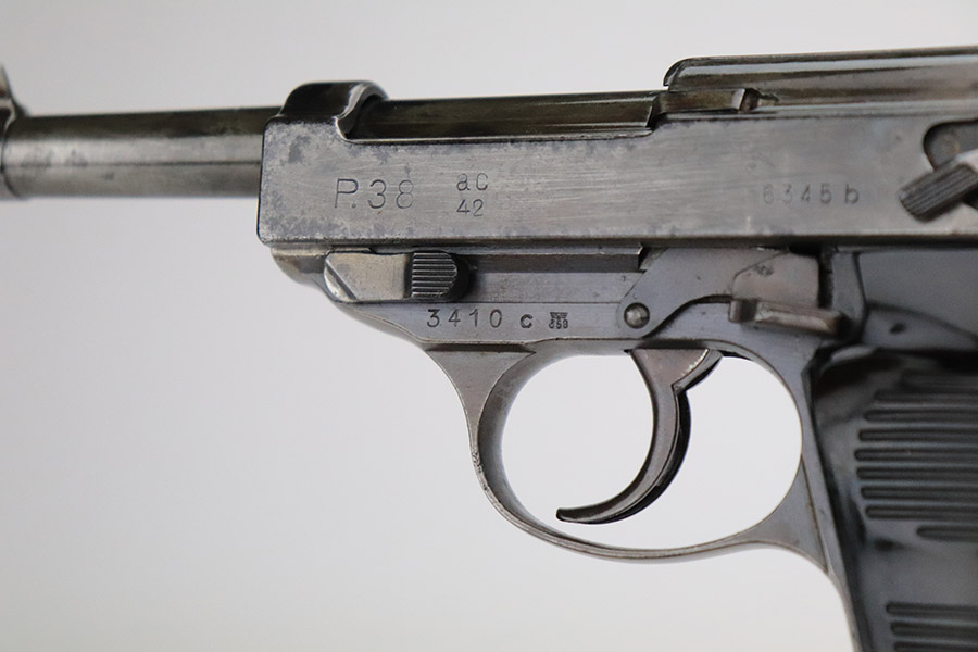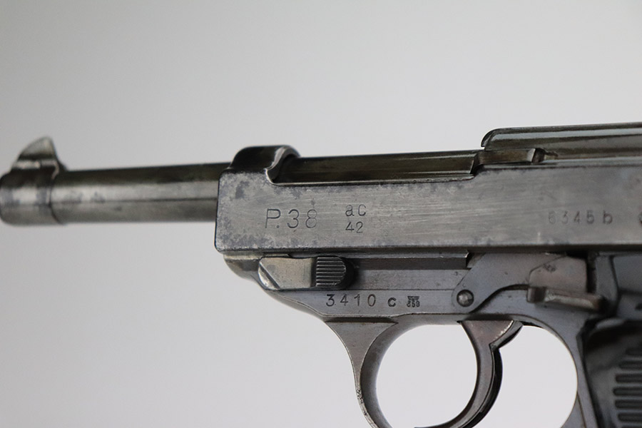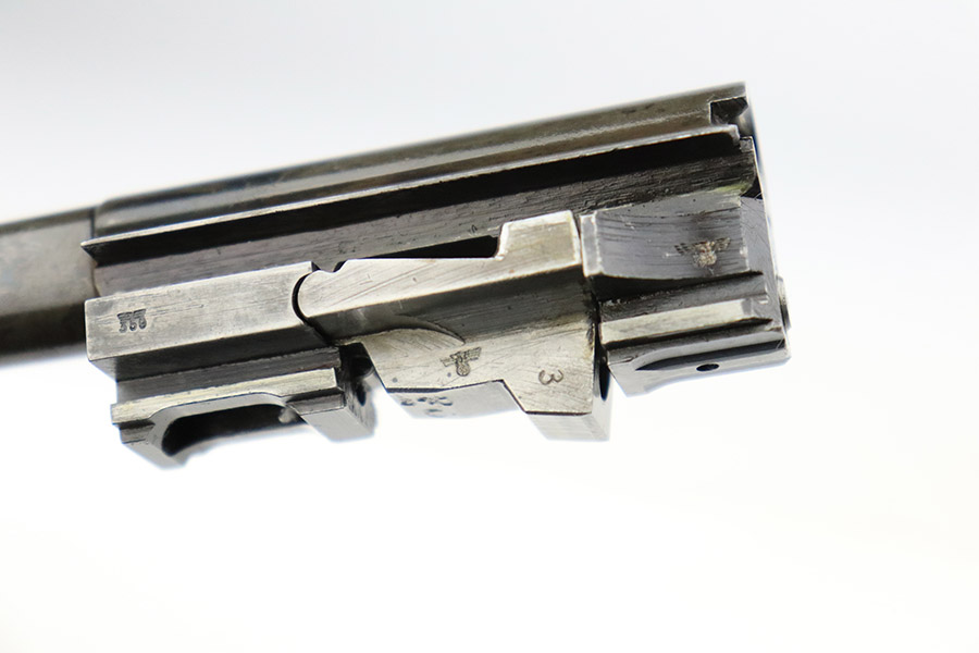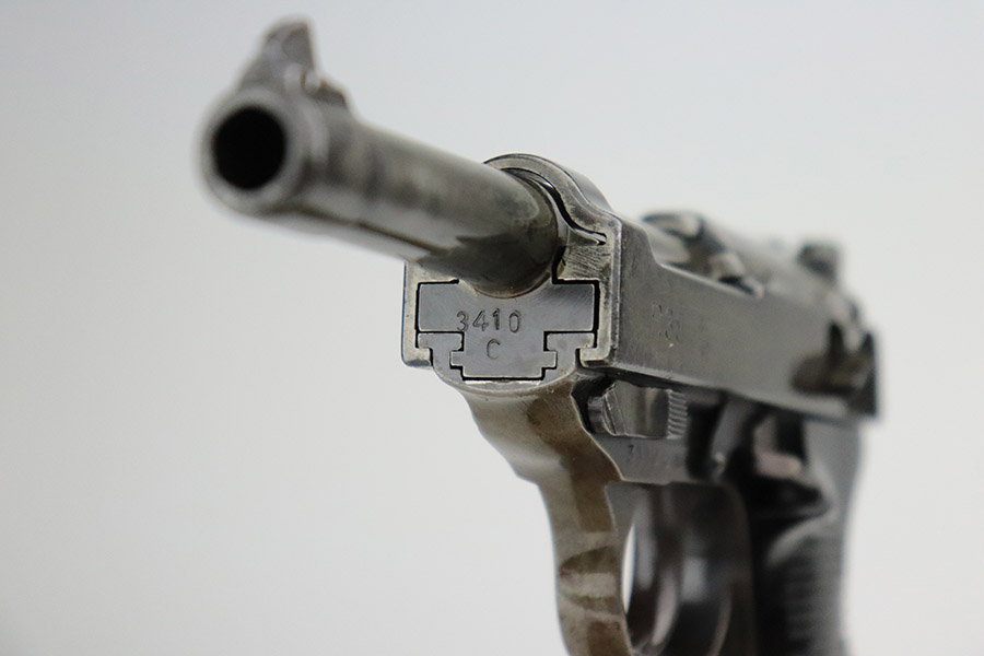 11/9/22 – This is an AC 42 Walther P.38 issued to the Nazi military in 1942. The slide is mismatched, but the rest of the parts are matching. It has the proper “Eagle 359” military acceptance proofs throughout. It has lost almost all of its original finish with noticeable spotty oxidation throughout. Areas of pin-pricking here and there. There is some light scratchy wear along the barrel and both sides of the slide. Comes with excellent blackish-brown bakelite grips and an un-marked magazine. The bore is shiny with strong rifling and some very light freckling throughout. De-cocker is functional.