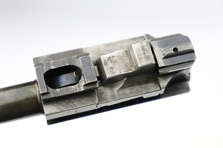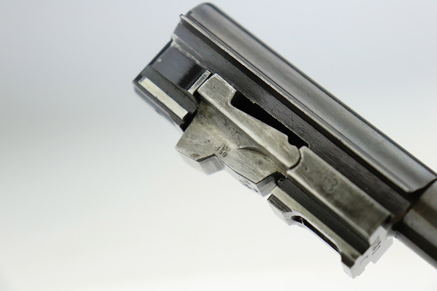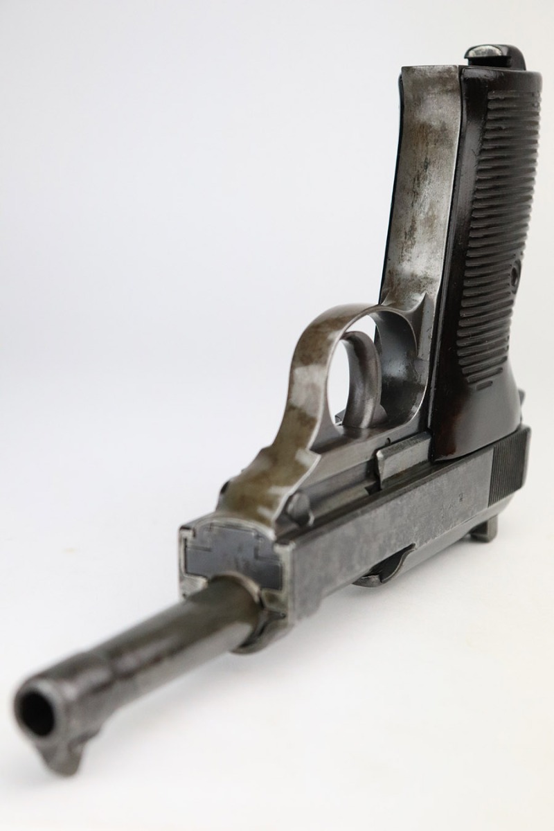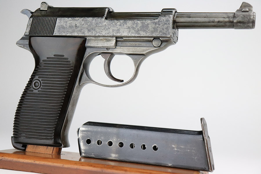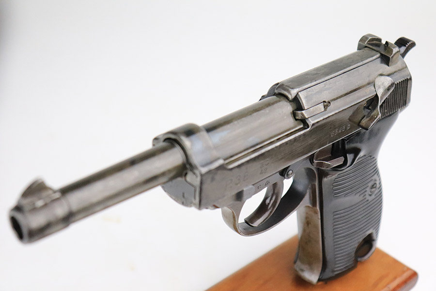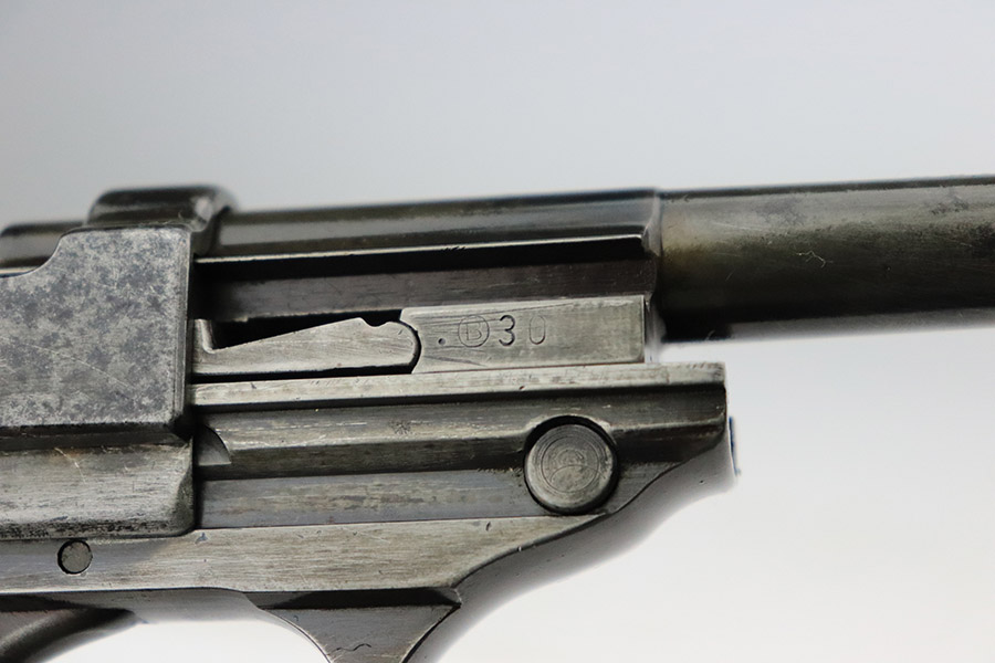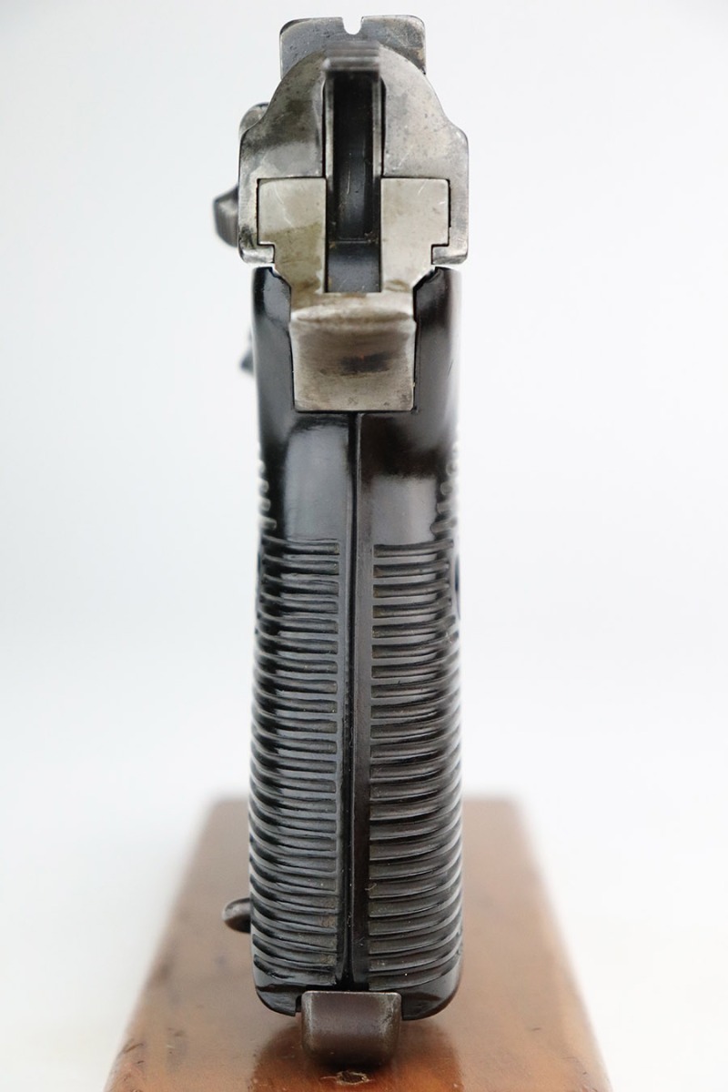 11/9/22 – This is an AC 42 Walther P.38 issued to the Nazi military in 1942. The slide is mismatched, but the rest of the parts are matching. It has the proper “Eagle 359” military acceptance proofs throughout. It has lost almost all of its original finish with noticeable spotty oxidation throughout. Areas of pin-pricking here and there. There is some light scratchy wear along the barrel and both sides of the slide. Comes with excellent blackish-brown bakelite grips and an un-marked magazine. The bore is shiny with strong rifling and some very light freckling throughout. De-cocker is functional.