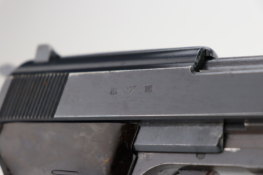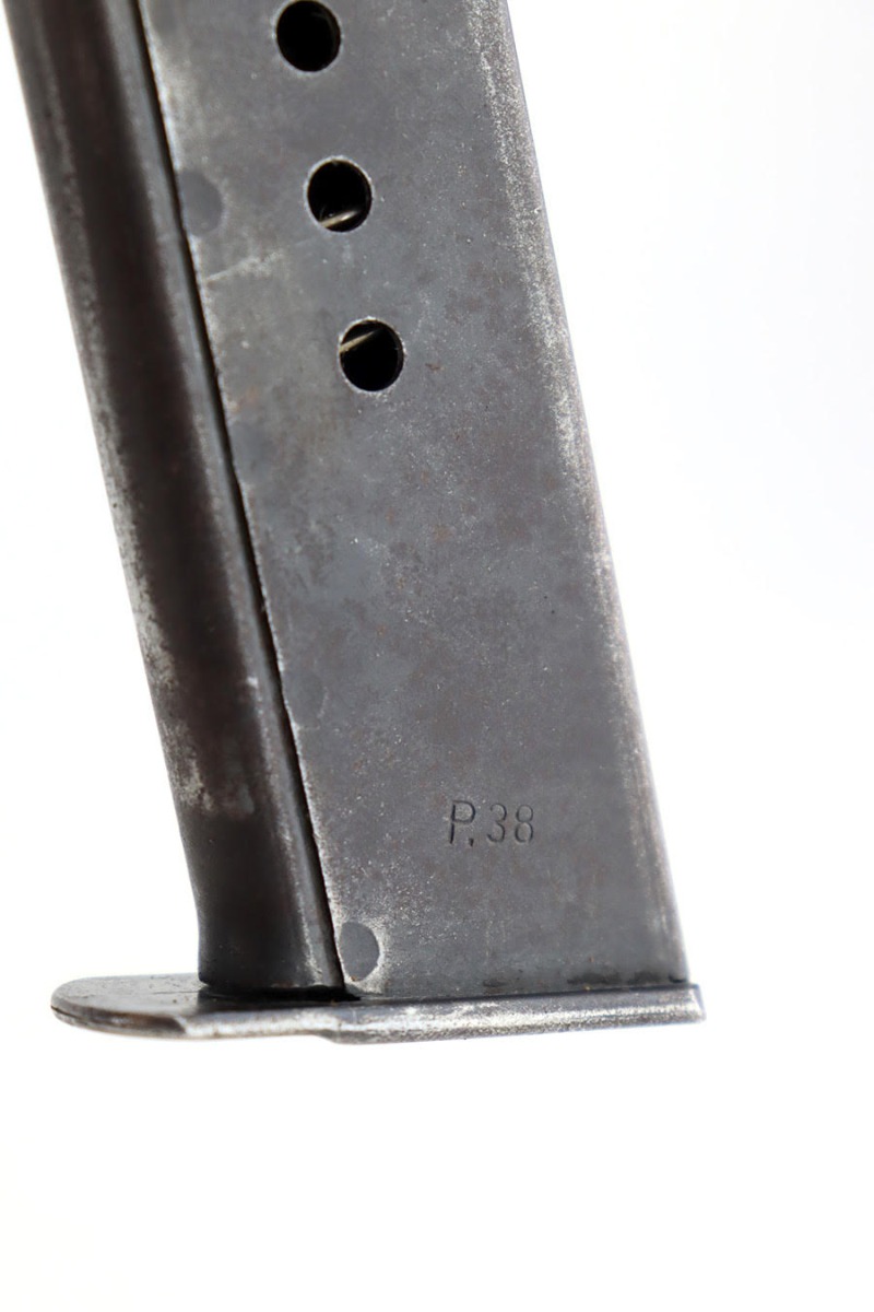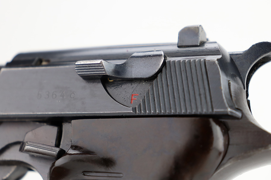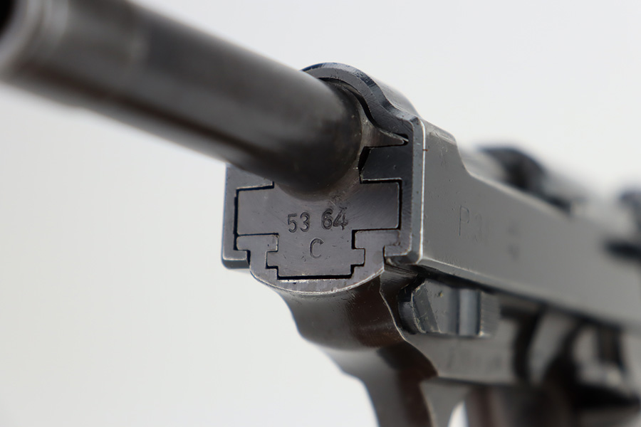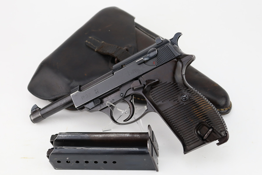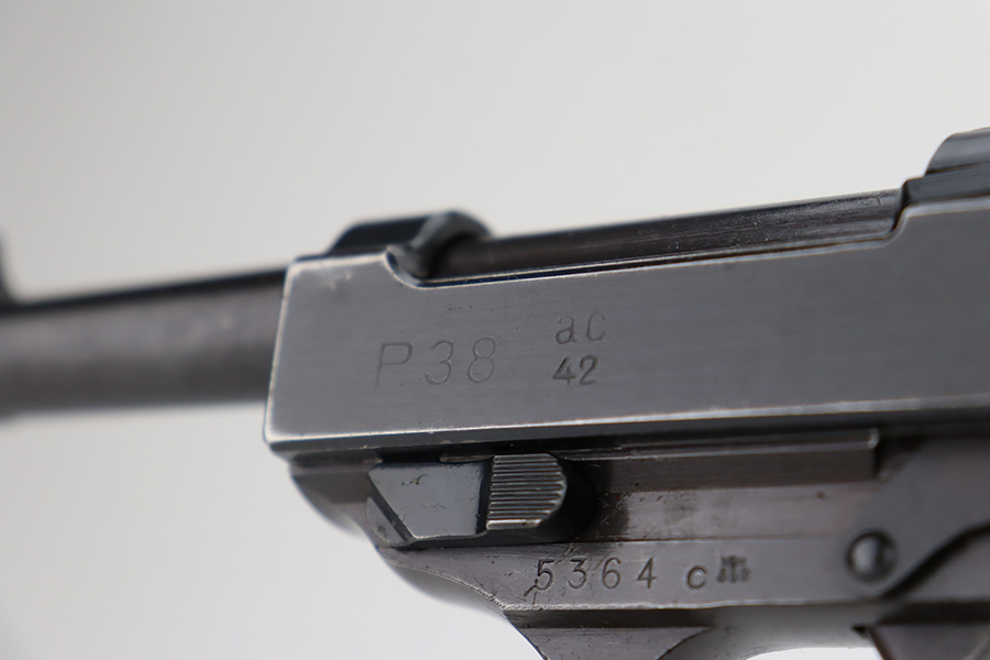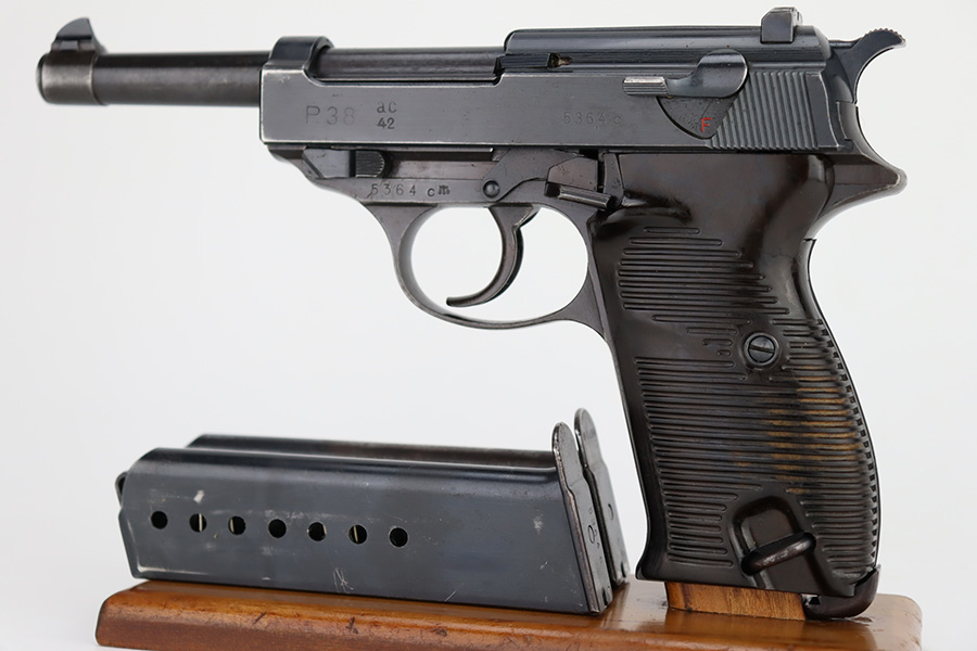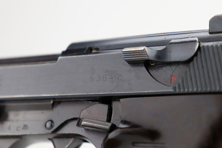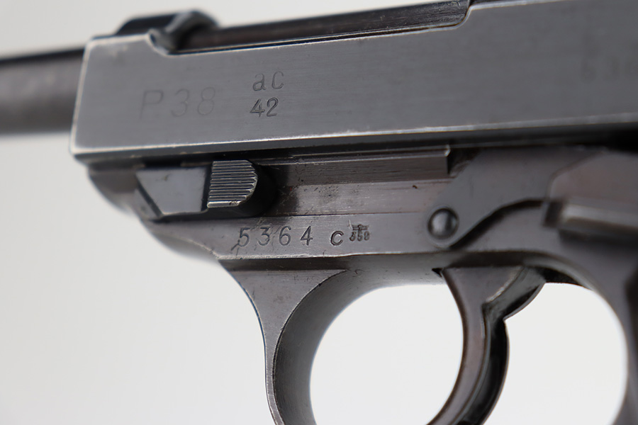 12/14/23 – This is an excellent example of an AC 42 Walther P.38 issued to the German military in 1942. All matching with the proper “Eagle 359” military proofs throughout. It comes as a rig with a 1942-dated hard shell holster, one original matching-numbered magazine, and one numbered but mismatched magazine. The gun’s original finish rates about 94% with minor wear around the muzzle, on the high edges of the slide, and some minor thinning on the front strap. A few small spots of light oxidation here and there. Fitted with period-correct bakelite grips – no waffen proofs. The bore has good rifling, but there is freckling throughout. De-cocker is functional.