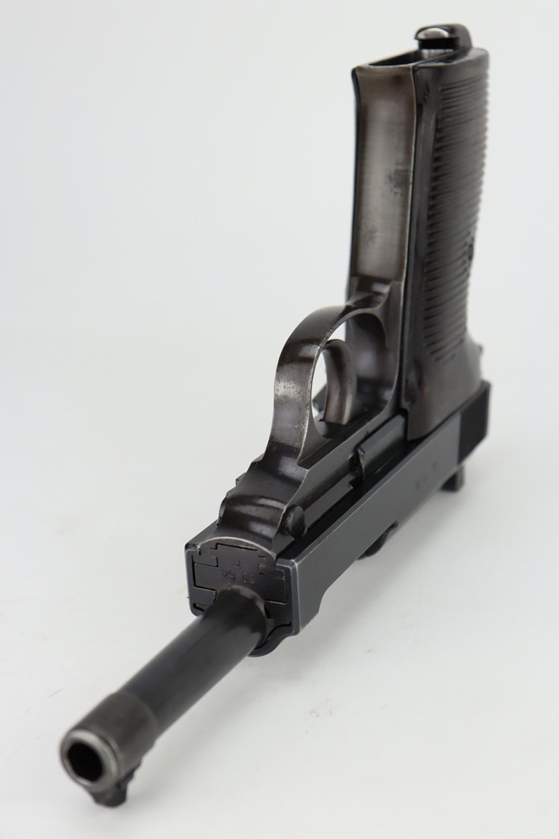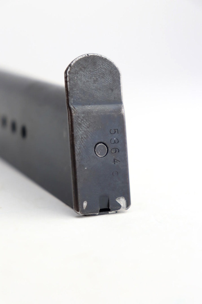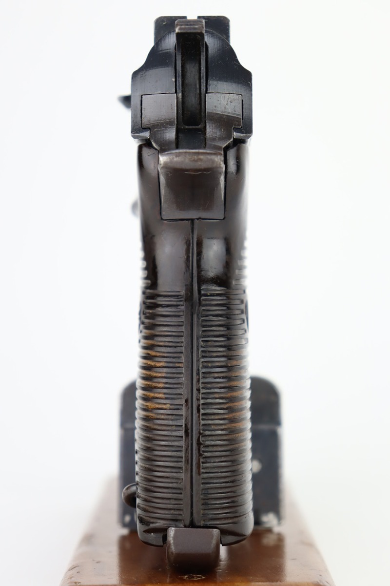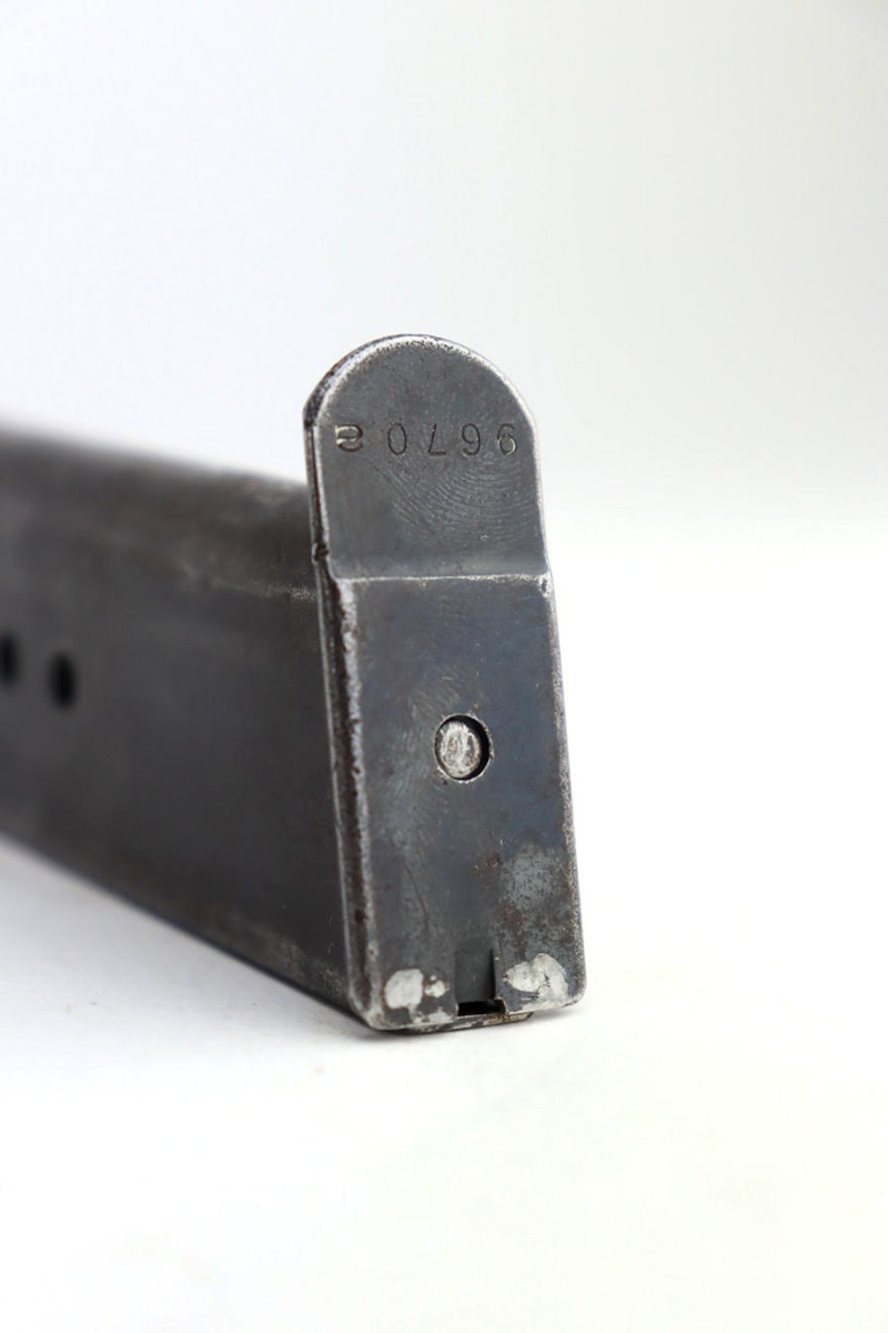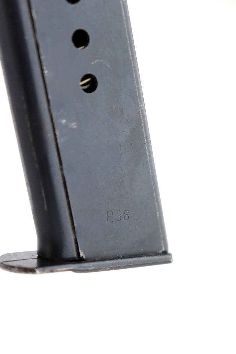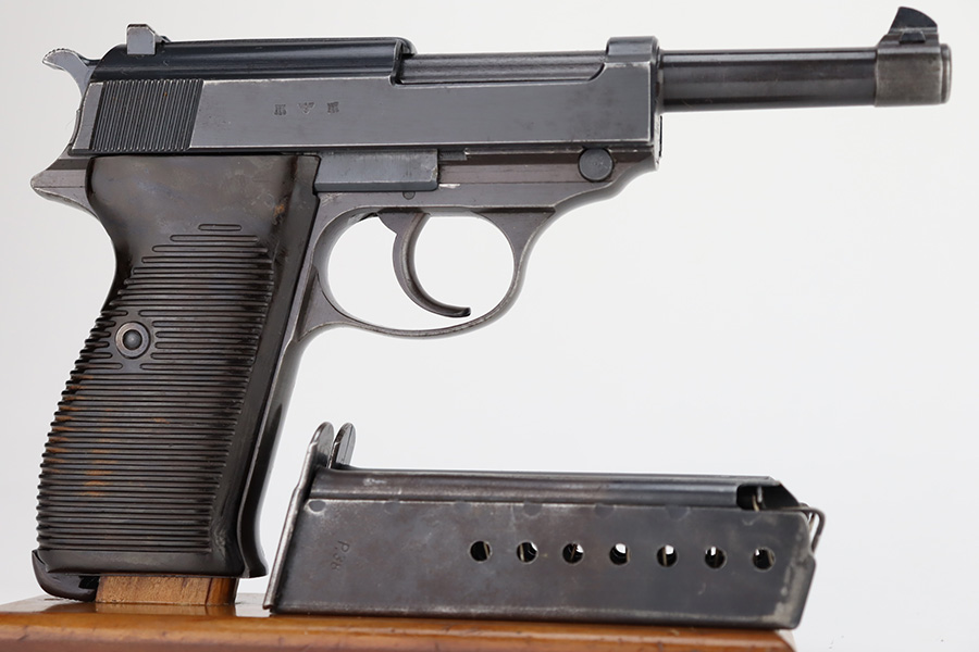 12/14/23 – This is an excellent example of an AC 42 Walther P.38 issued to the German military in 1942. All matching with the proper “Eagle 359” military proofs throughout. It comes as a rig with a 1942-dated hard shell holster, one original matching-numbered magazine, and one numbered but mismatched magazine. The gun’s original finish rates about 94% with minor wear around the muzzle, on the high edges of the slide, and some minor thinning on the front strap. A few small spots of light oxidation here and there. Fitted with period-correct bakelite grips – no waffen proofs. The bore has good rifling, but there is freckling throughout. De-cocker is functional.