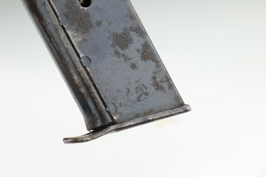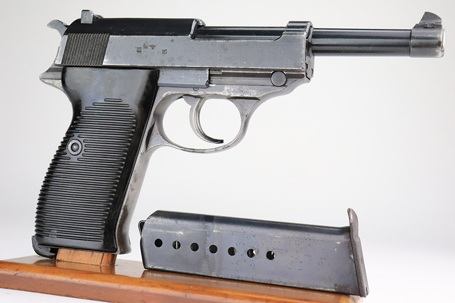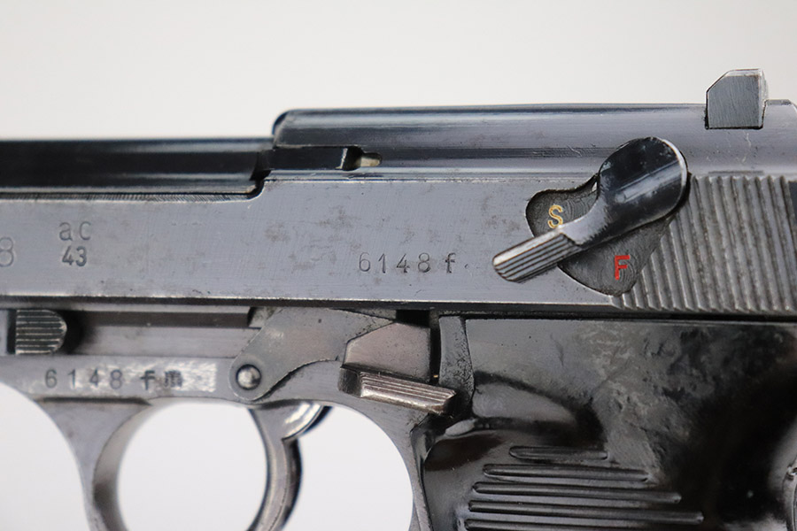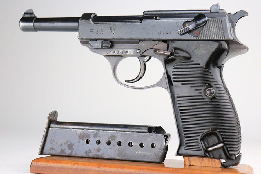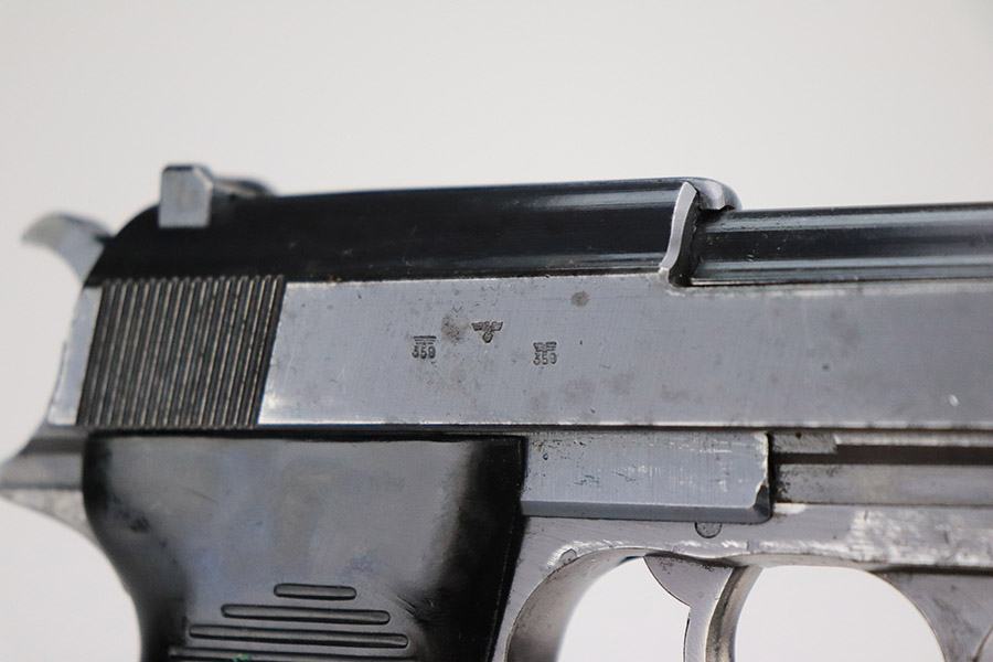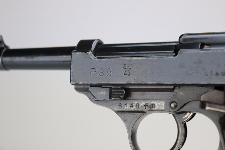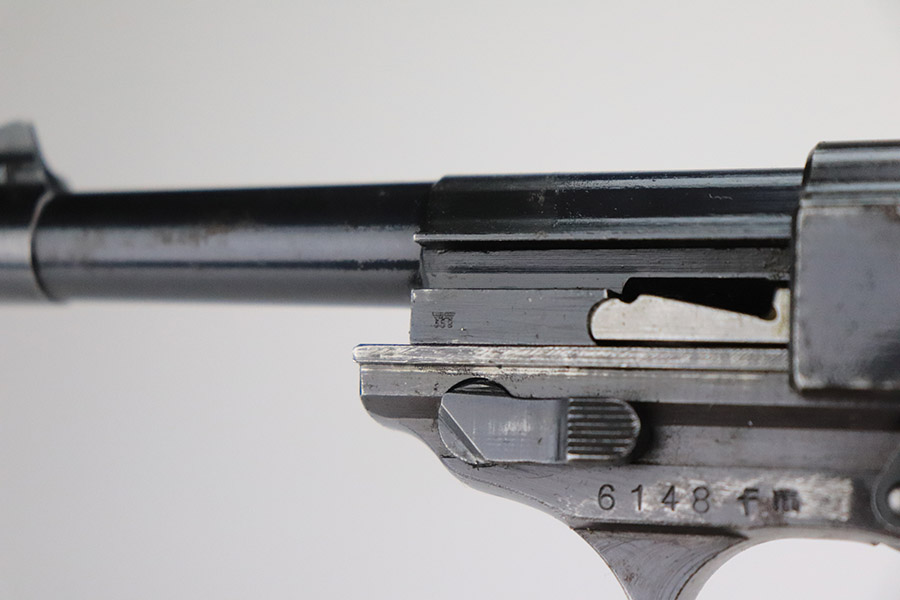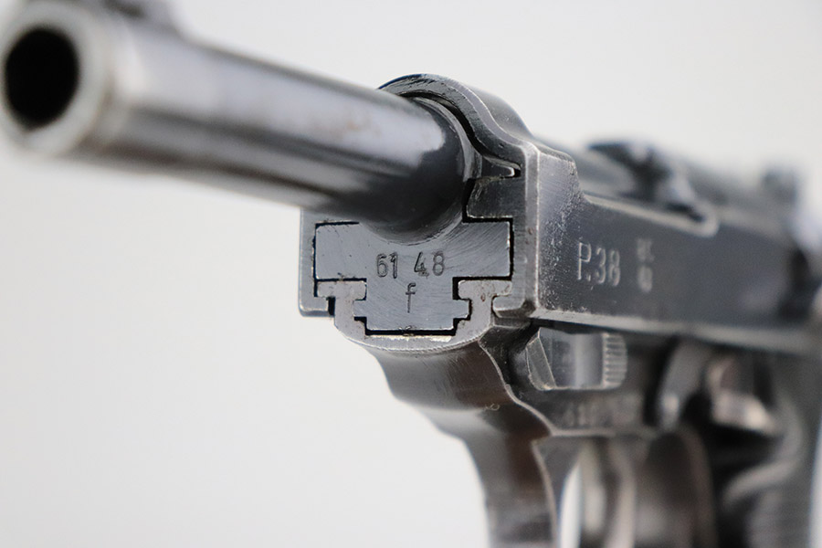 11/7/22 – This is a nice example of an AC 43 Walther P.38 issued to the Nazi military in 1943. It is all matching and has the proper “Eagle 359” military acceptance proofs throughout. It has retained roughly 85% of its original finish. The majority of the finish loss is on the front strap, but there is also very minor wear around the muzzle and high edges of the slide. There are areas of spotty oxidation on the front strap, along both sides of the slide, and a little bit along the barrel. Comes with nice blackish-brown bakelite grips and a “Eagle 135” marked Mauser magazine. The bore is near-mint. De-cocker is functional.